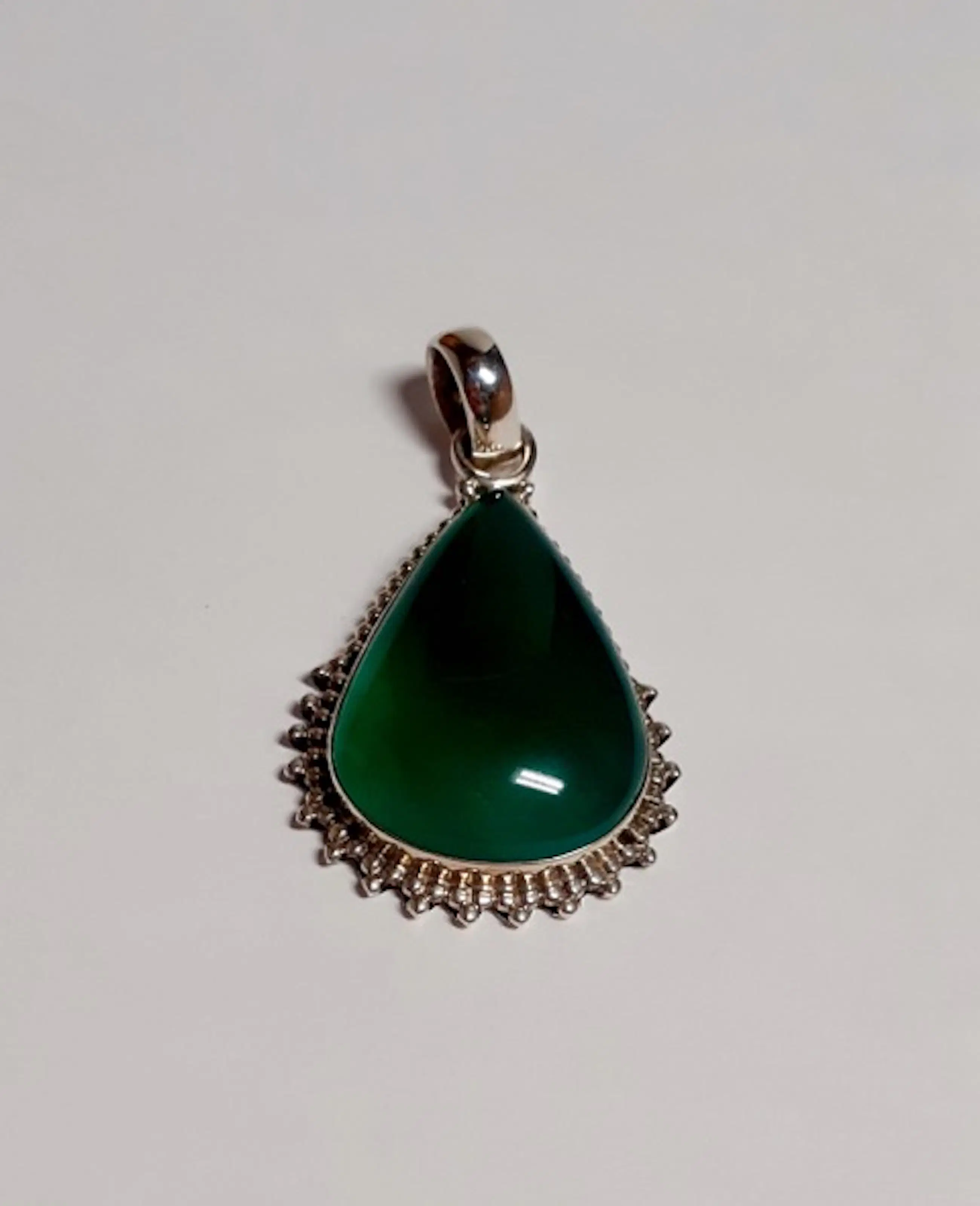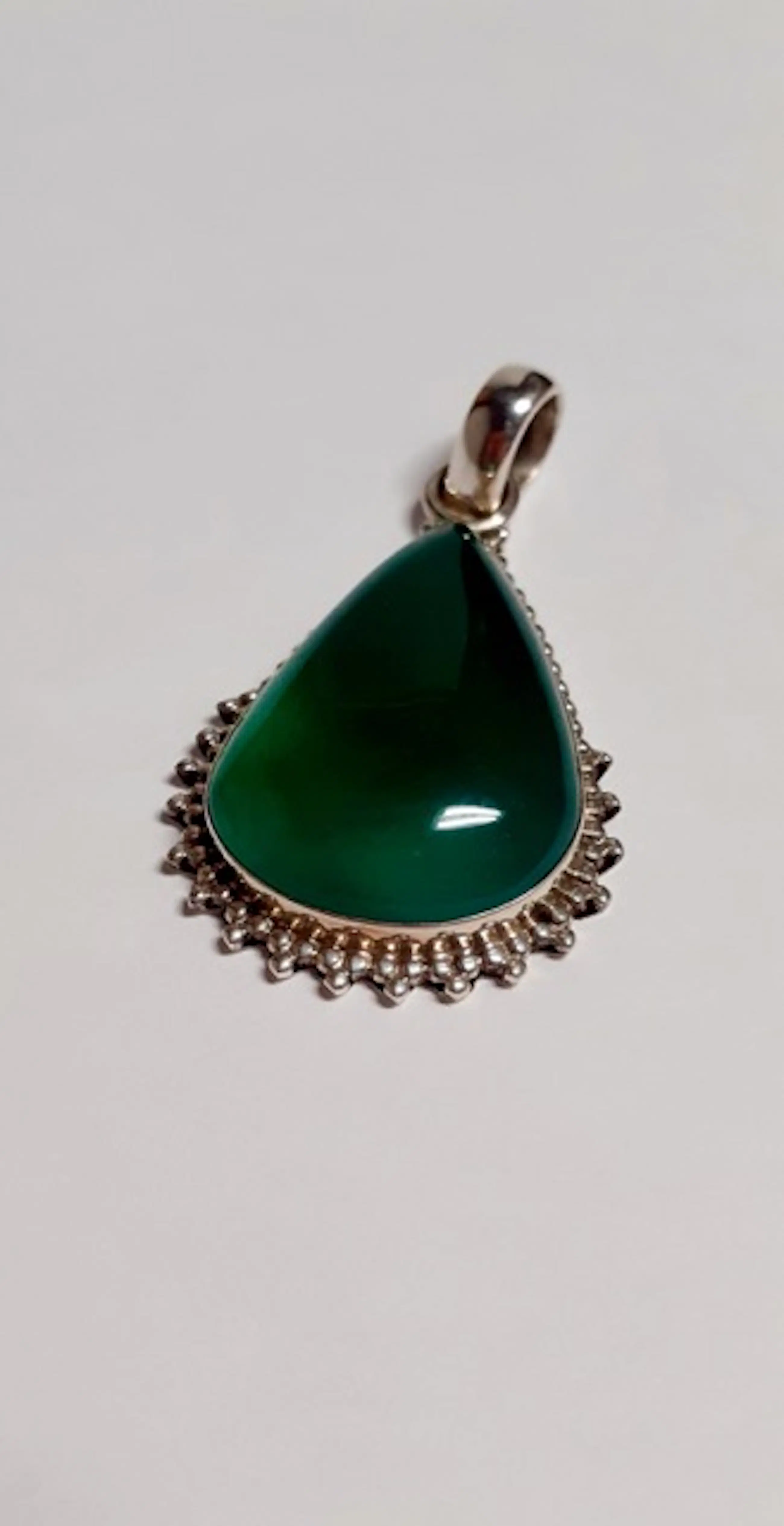 Zilveren hanger met groene onyx een totale lengte van 4.5 cm weegt 11.51 gram mooie bewerkte druppel kast . Meer dan 40 jaar oud .