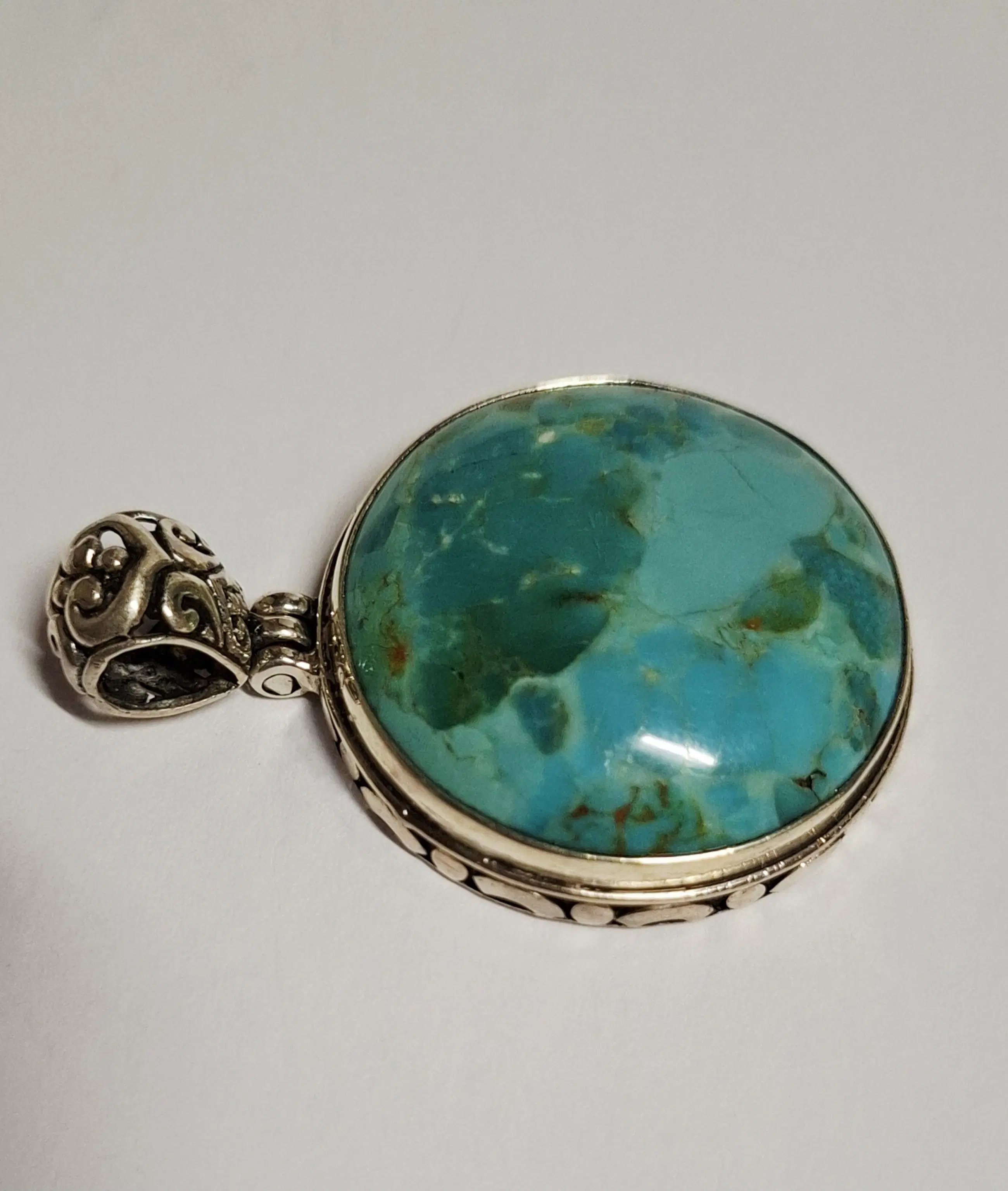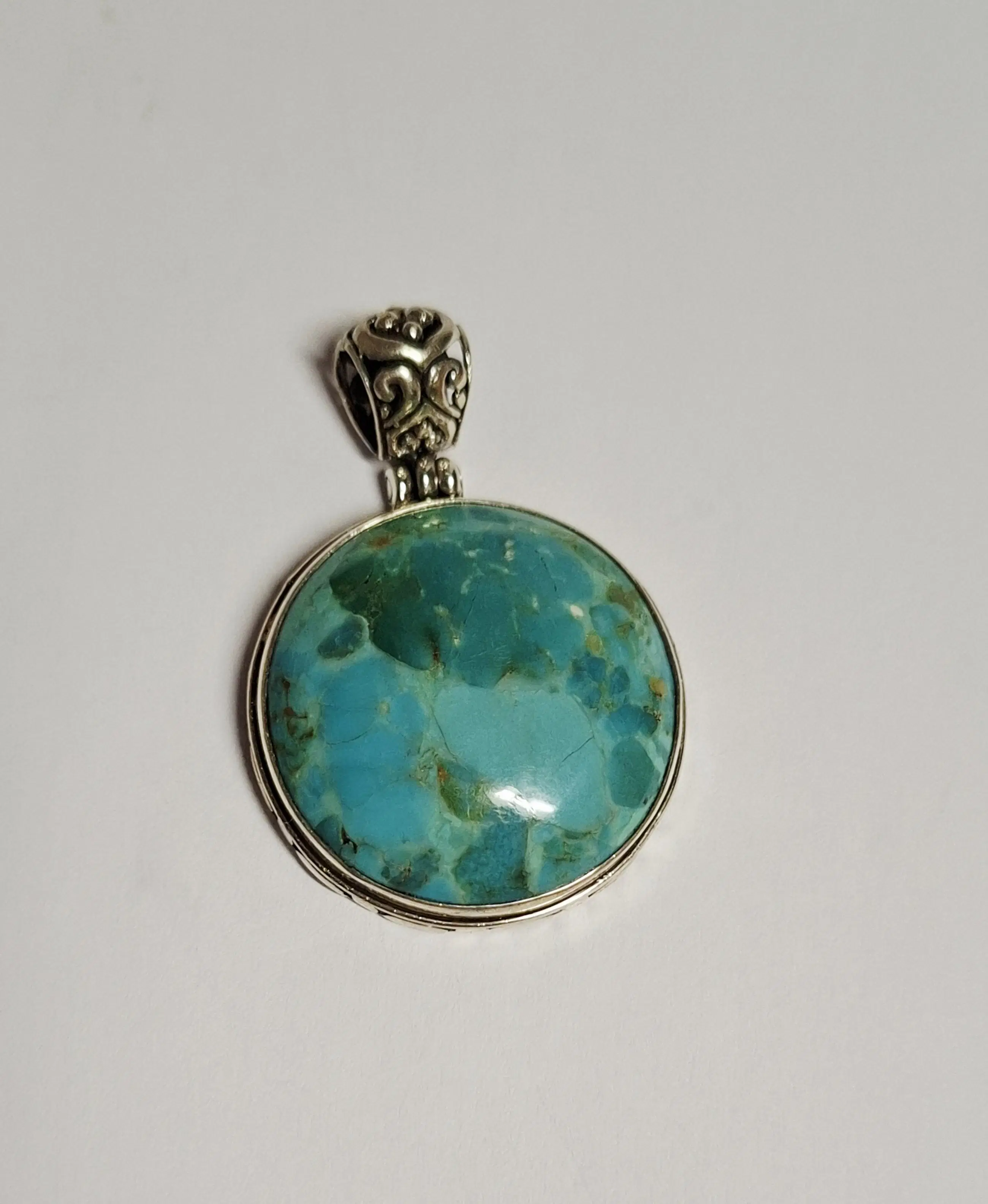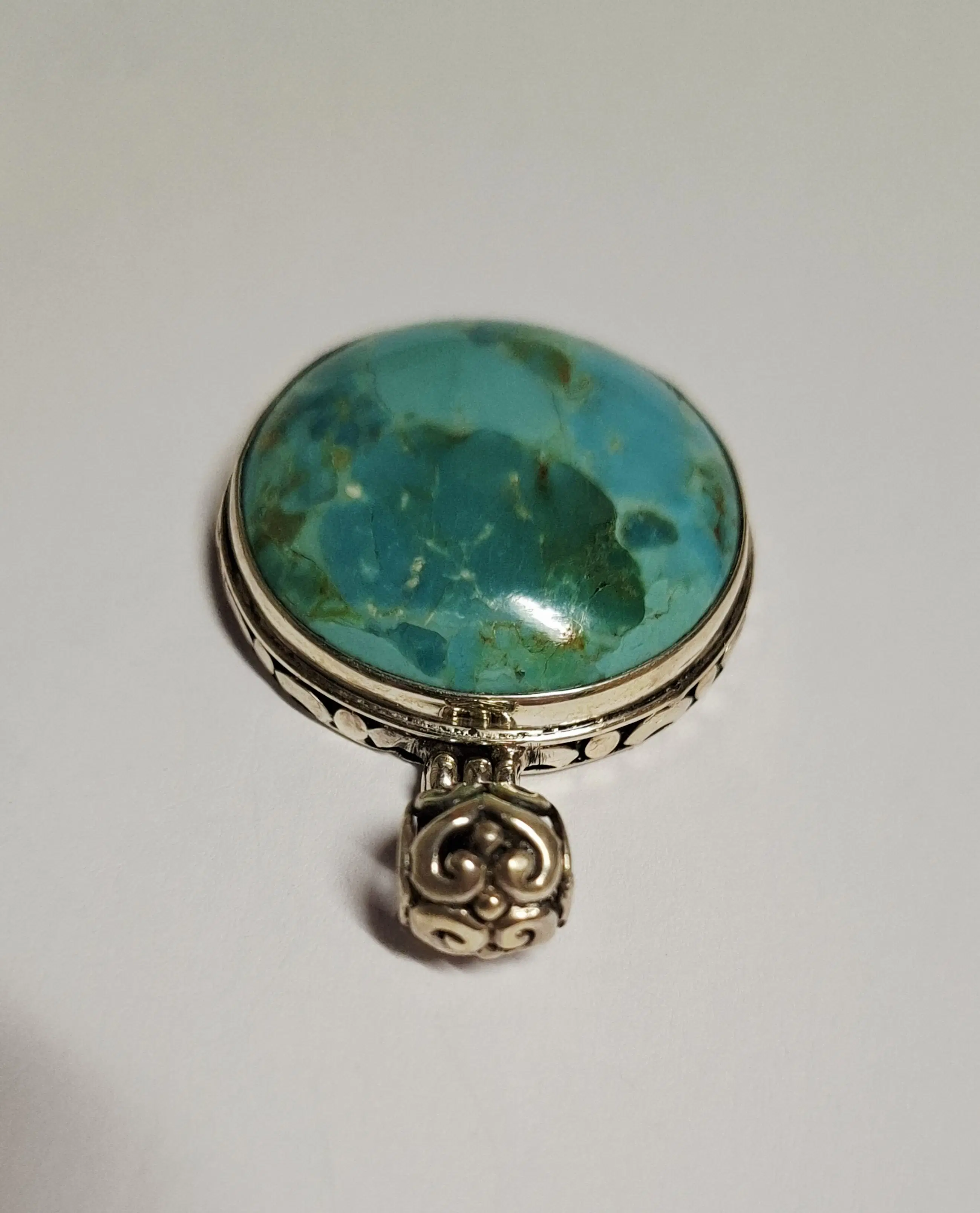 In nieuwstaat Een sierlijk bewerkte hanger Zilver met Natuurlijke Turkoois Edelsteen Handgemaakte Mode Ontwerper Hanger Voor Dames, Moderne Etnische Filigraan Tribaal Zigeuner Boho Bohemien Stijl, Dit prachtige hangende sieraad is met de hand gemaakt van 925 sterling zilver door traditionele ambachtslieden en kan bij verschillende gelegenheden worden gedragen of als cadeau worden gegeven voor de feest dagen aan uw geliefden Perfect voor zowel informele als formele kleding, voegt een vleugje verfijning toe aan elke outfit. Nog nooit gedragen. eigenlijk is het nog nieuw voor een sieraad uit 1995 Komt uit een Prive collectie altijd in een kastje gelegen . moet nog een beetje opgepoetst worden voor verzending zodat hij mooi aankomt Wordt goed verpakt en verzekerd verzonden met track en trace