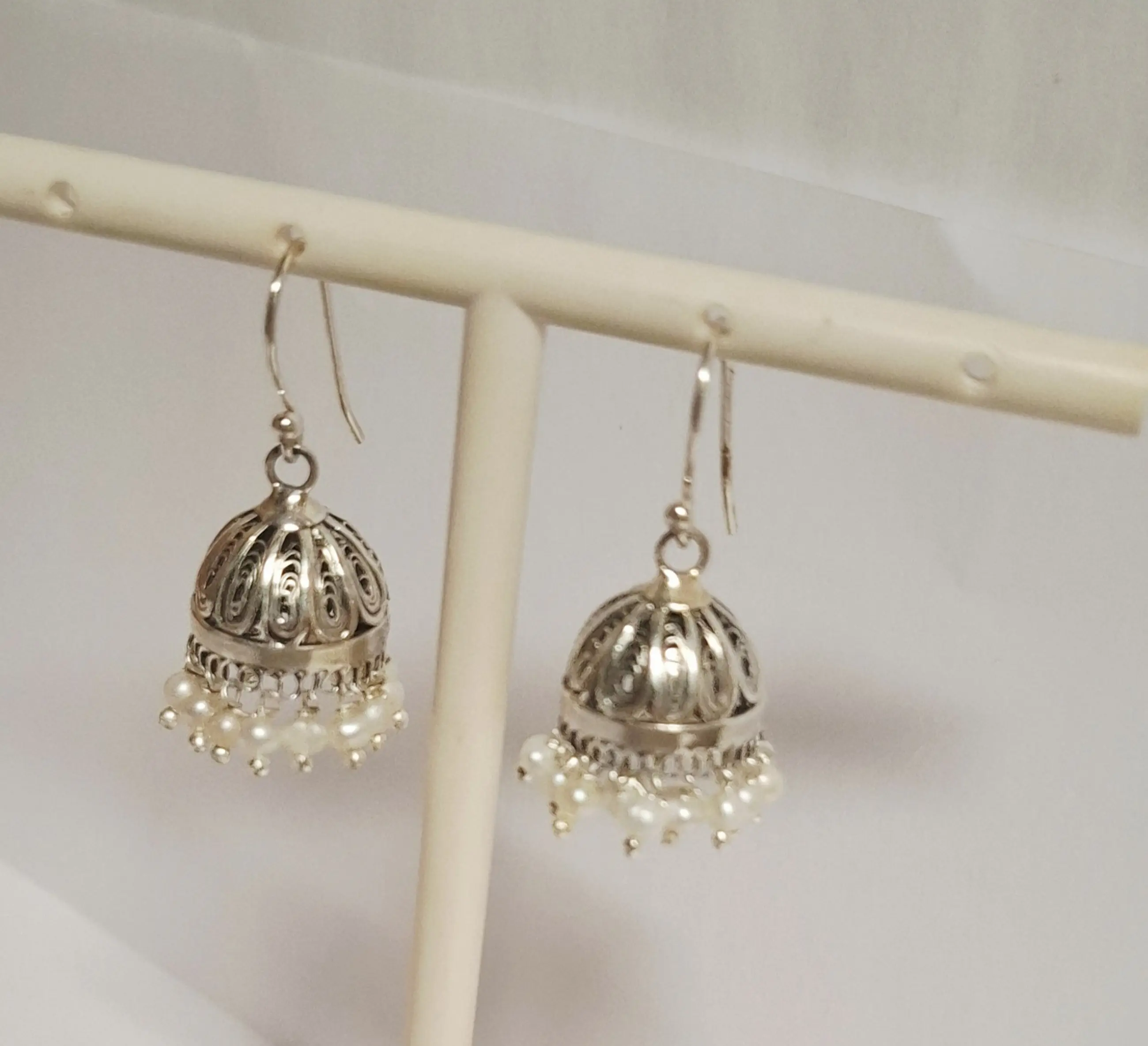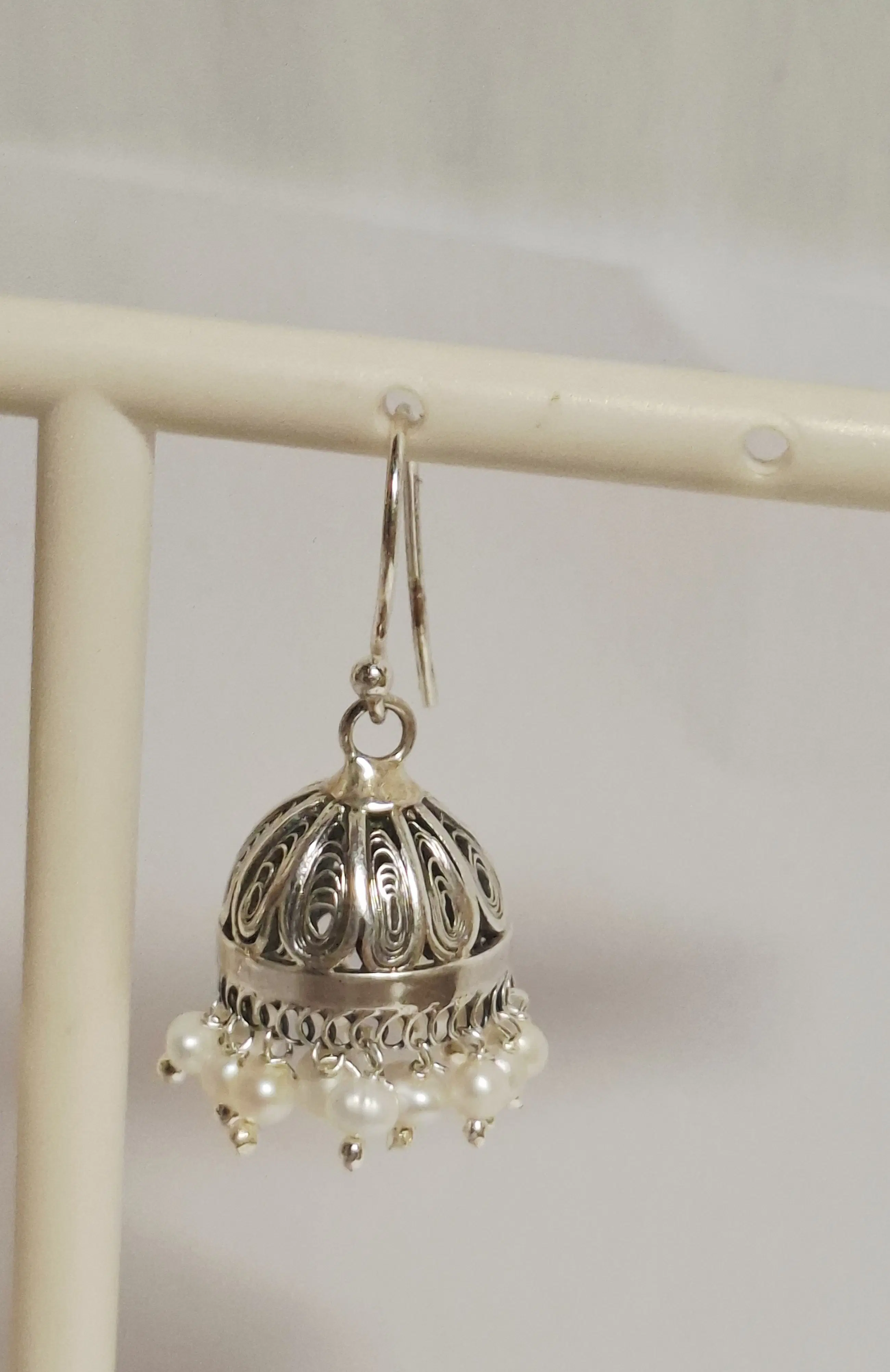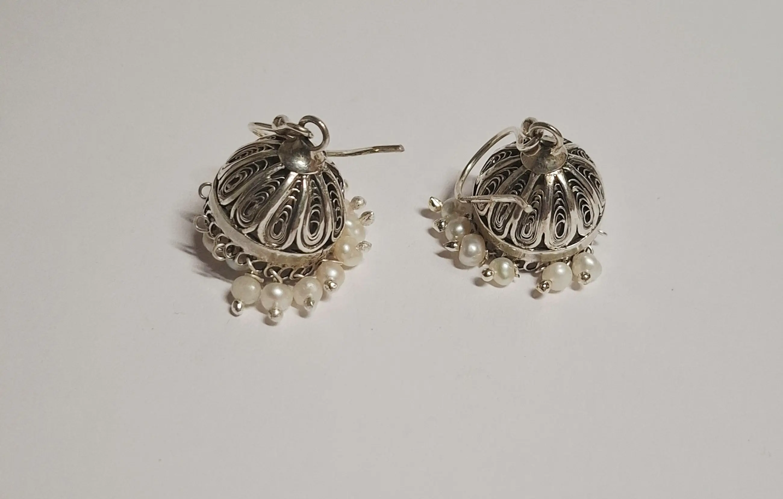 Deze Jhumka oorbellen van zilver filigraan werk zijn geïnspireerd op traditionele Indiase ontwerpen en zijn versierd met kleine parels.
