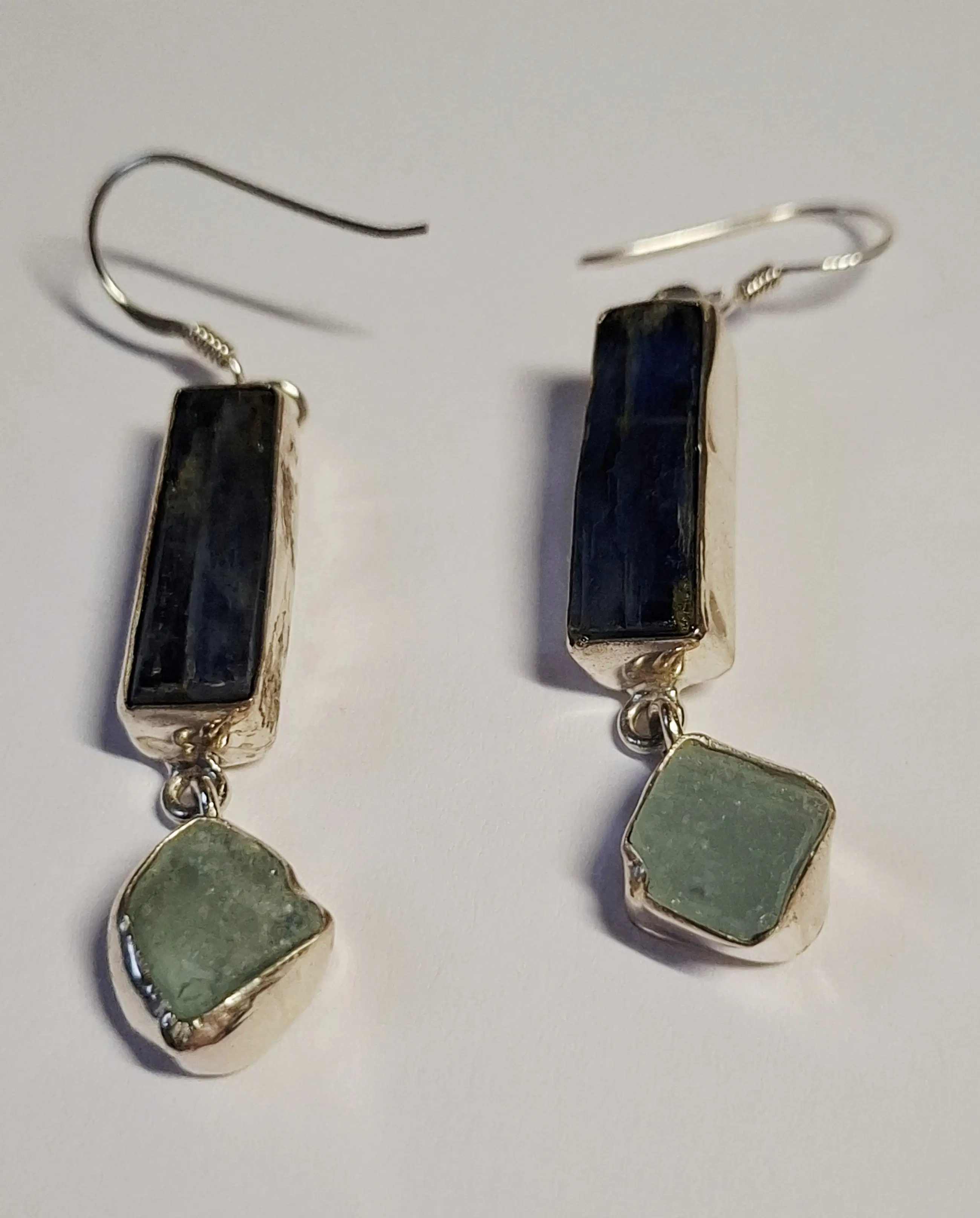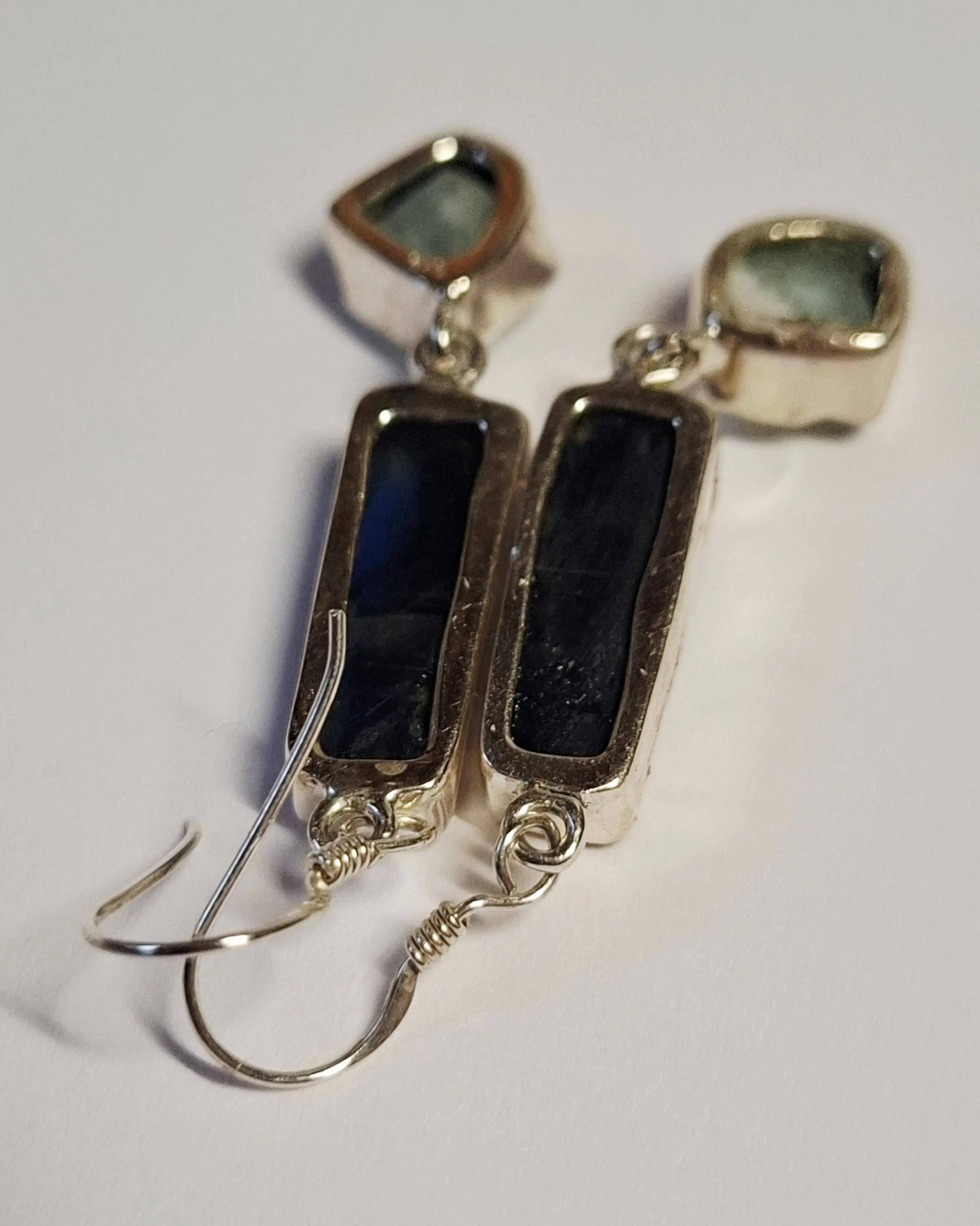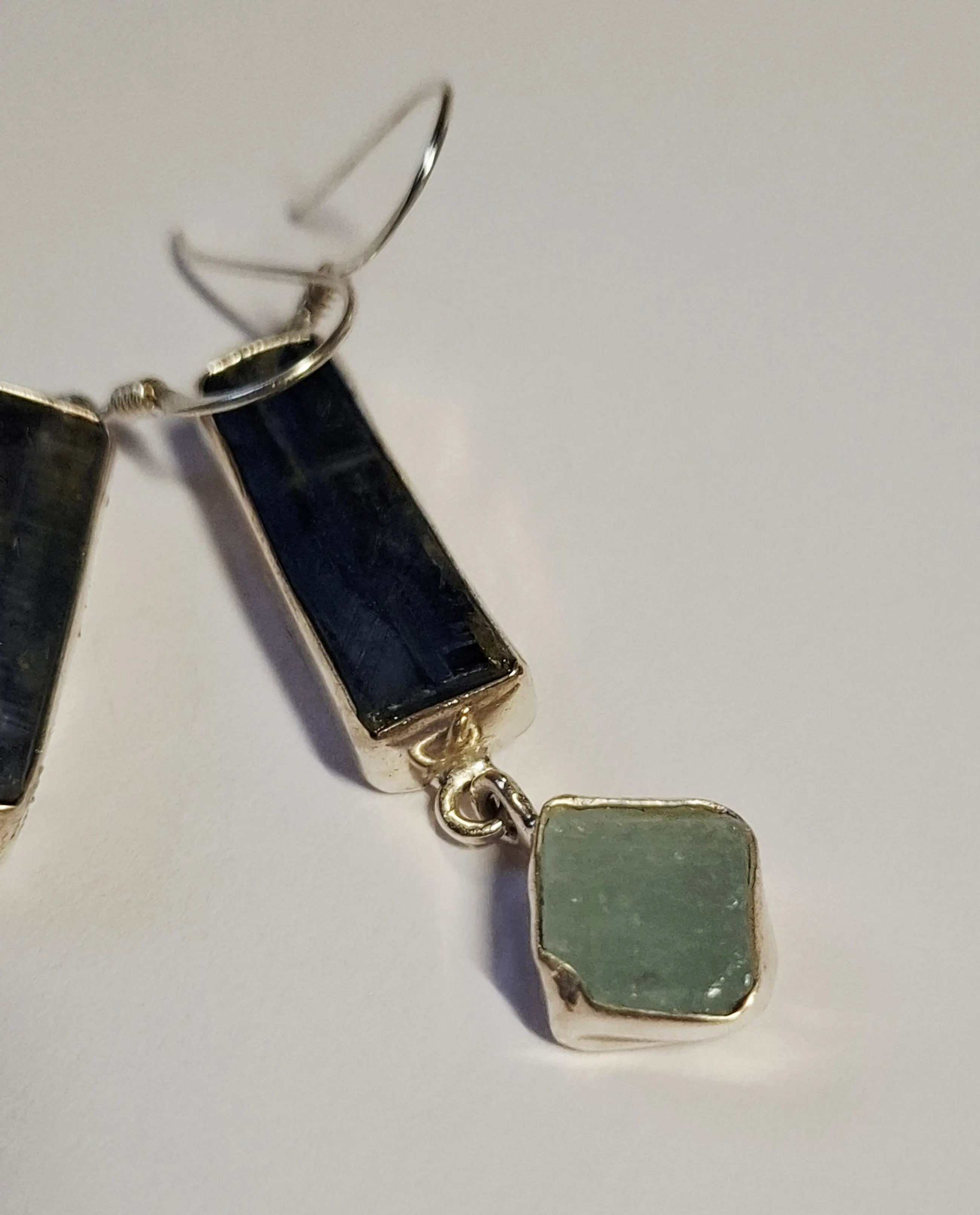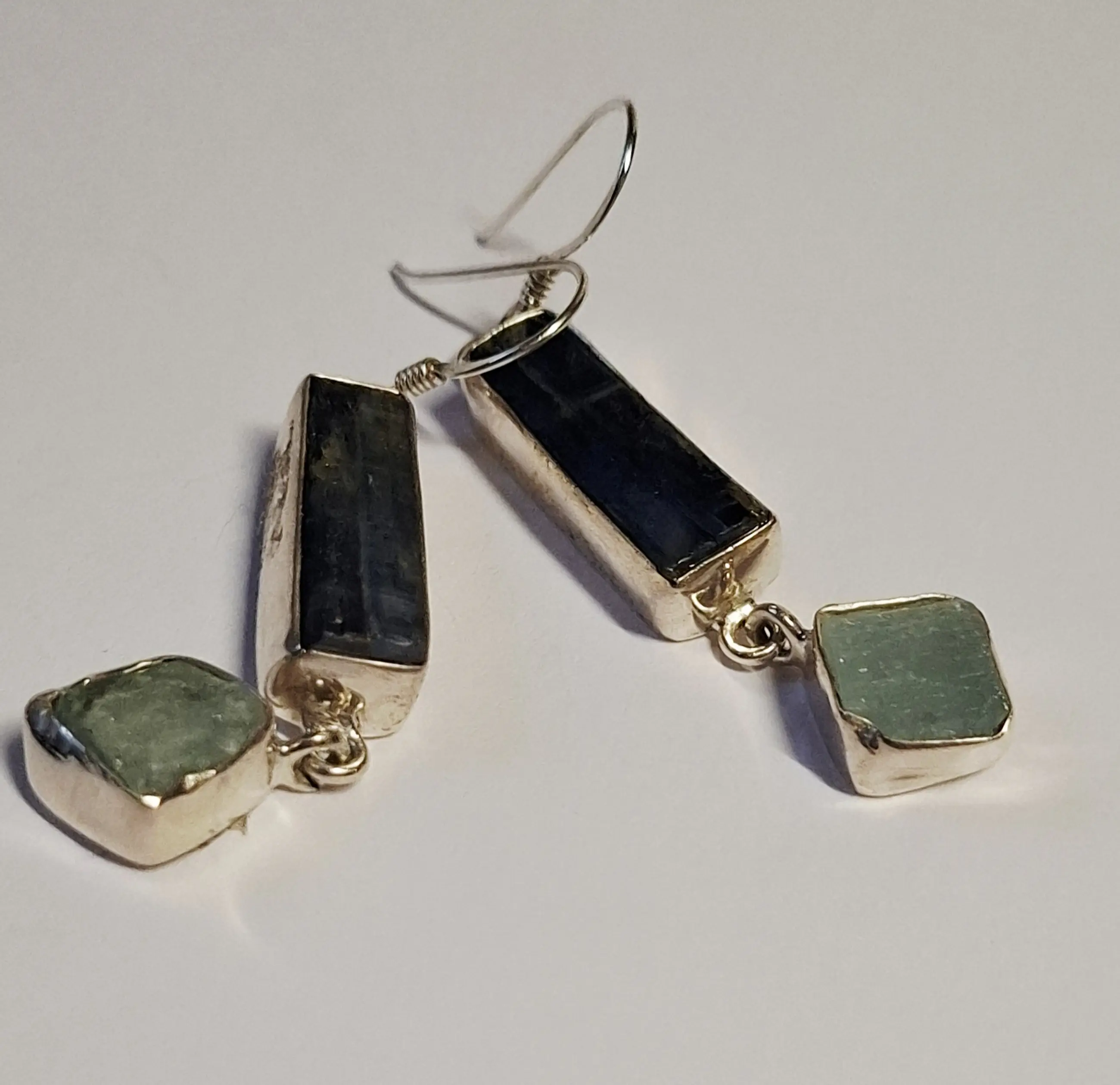 ieuwe zilveren oorbellen met ruwe saffieren en ruwe Aquamarijn in zilver handgemaakte kast