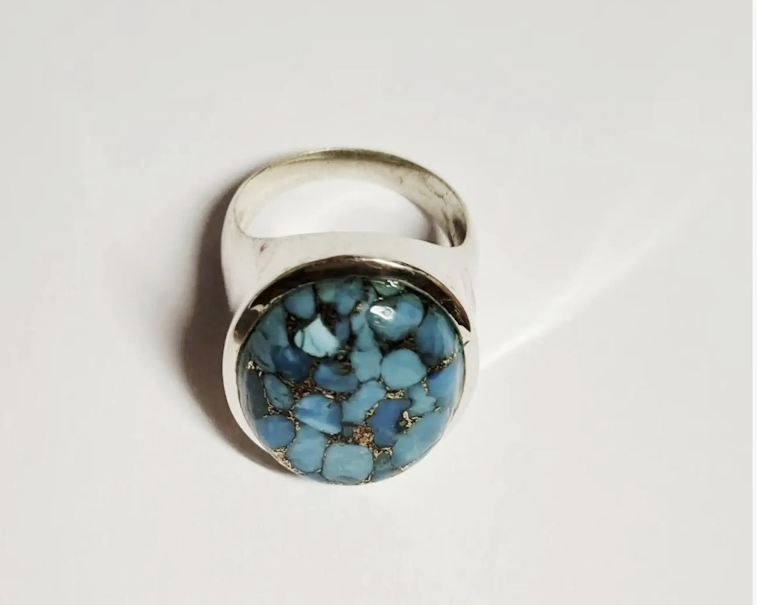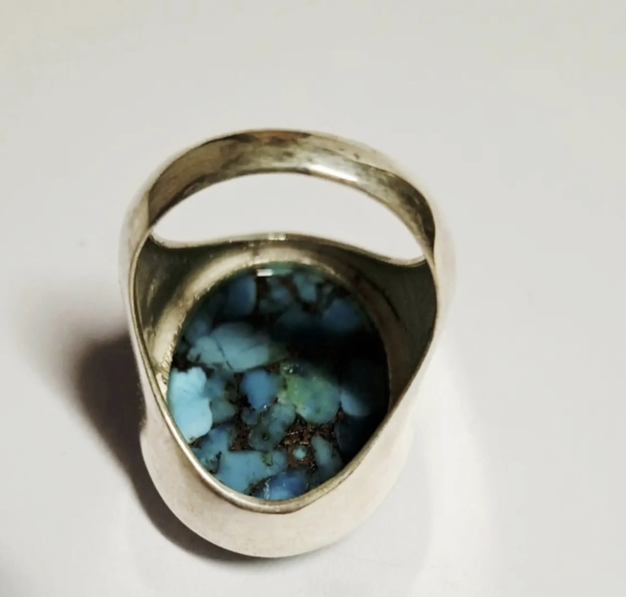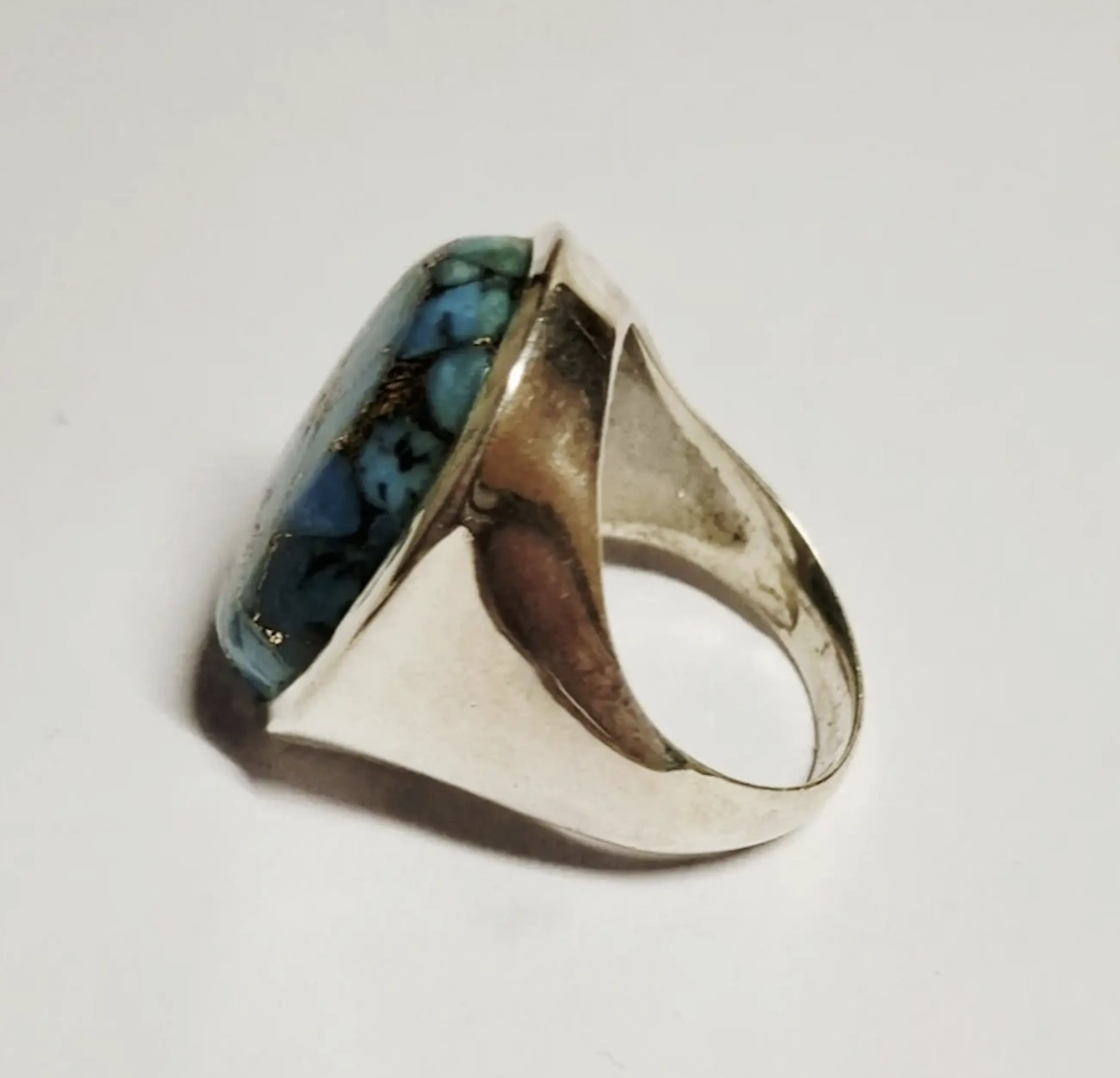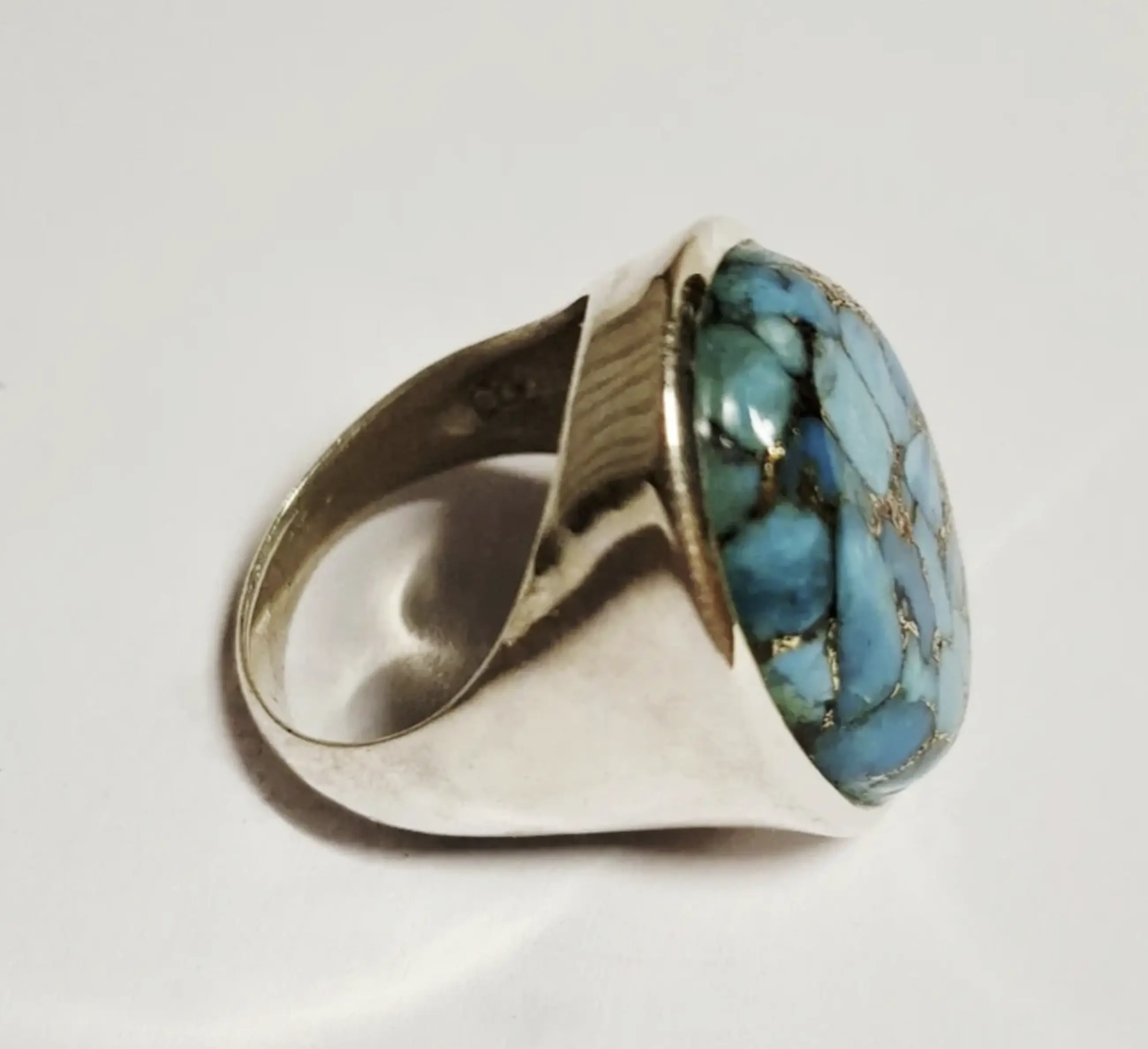 De ring ringmaat is 19.5. De werking van turkoois, inclusief ' goud ,koper turkoois', omvat sterk zuiverende, geneeskrachtige en beschermende eigenschappen. Het brengt emotionele balans door te helpen bij depressie, stemmingswisselingen en paniekaanvallen. Fysiek werkt de steen pijnstillend en ontstekingsremmend, en het kan het immuunsysteem, de longen en de opname van voedingsstoffen ondersteunen. Het bevordert ook innerlijke rust, creativiteit en intuïtie. Wij poetsen het zilver altijd op voor verzending