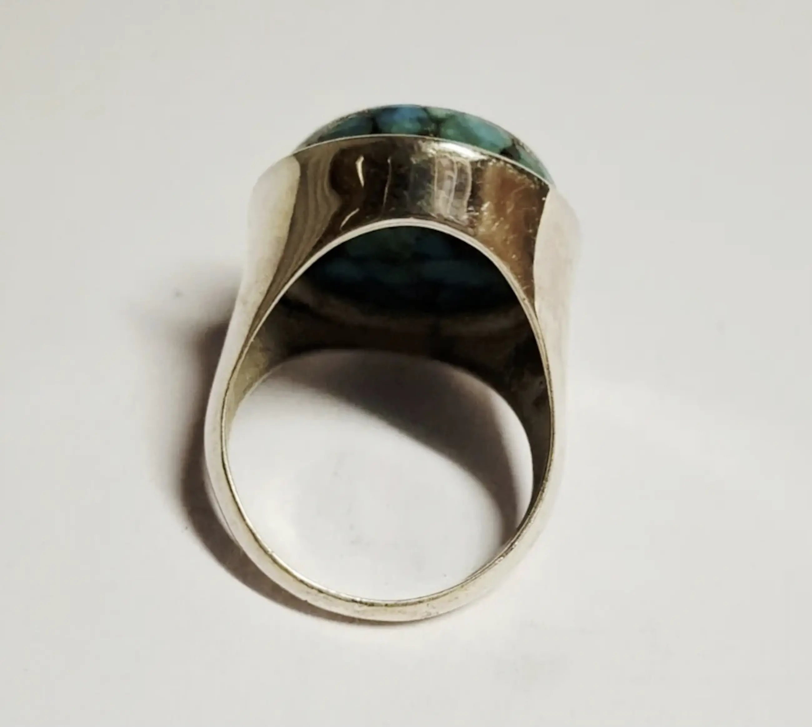 Nieuwe zilveren ring met ovale hoogglans turkoois deze zilveren ring heeft een mooie cabochon geslepen blauwe goud ,koper turkoois steen. Het zilvergehalte is 925.