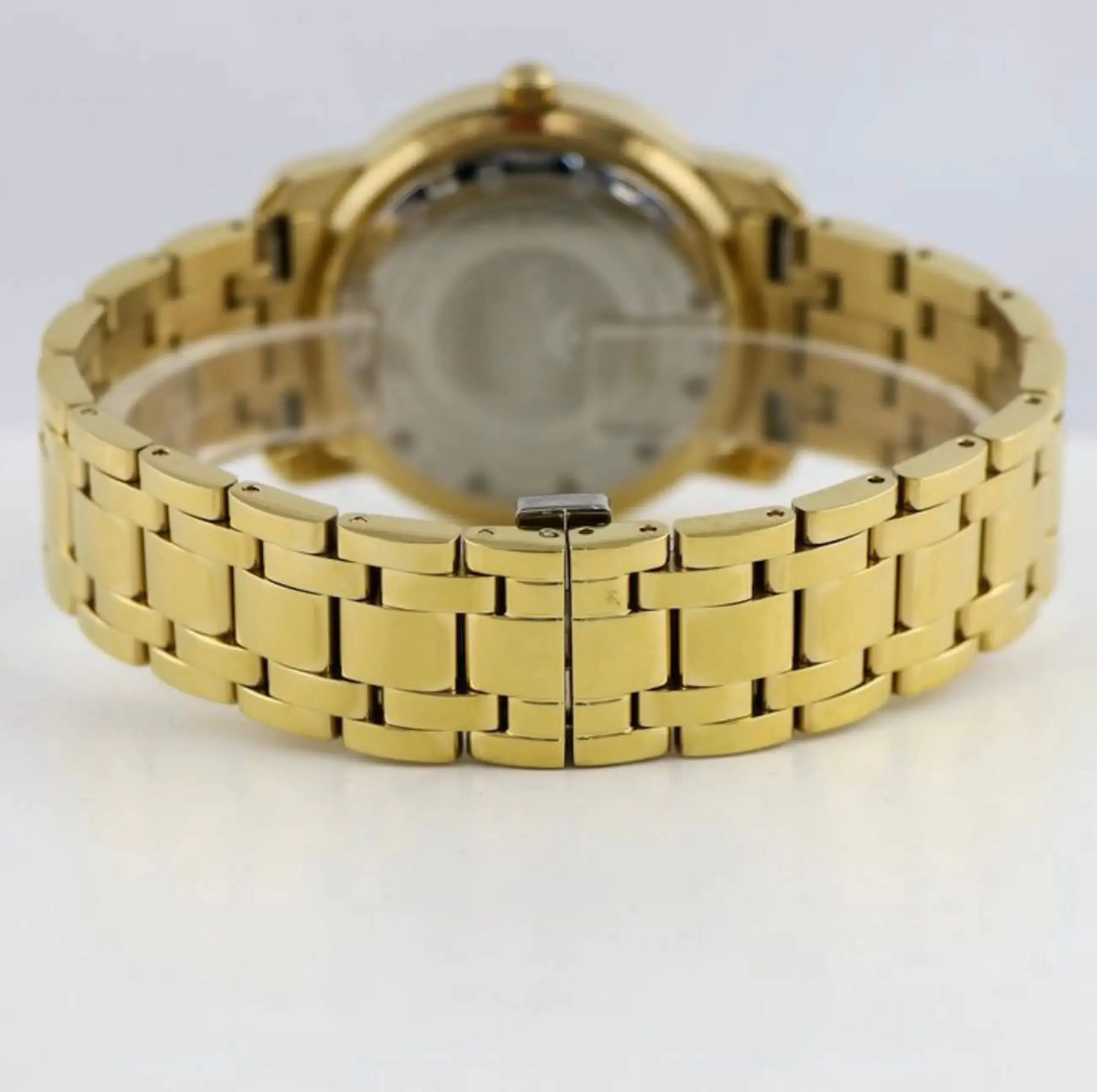 Wijzerplaat: Wit parelmoer. PVD gouden wijzers gevuld met lume en PVD gouden indexen.