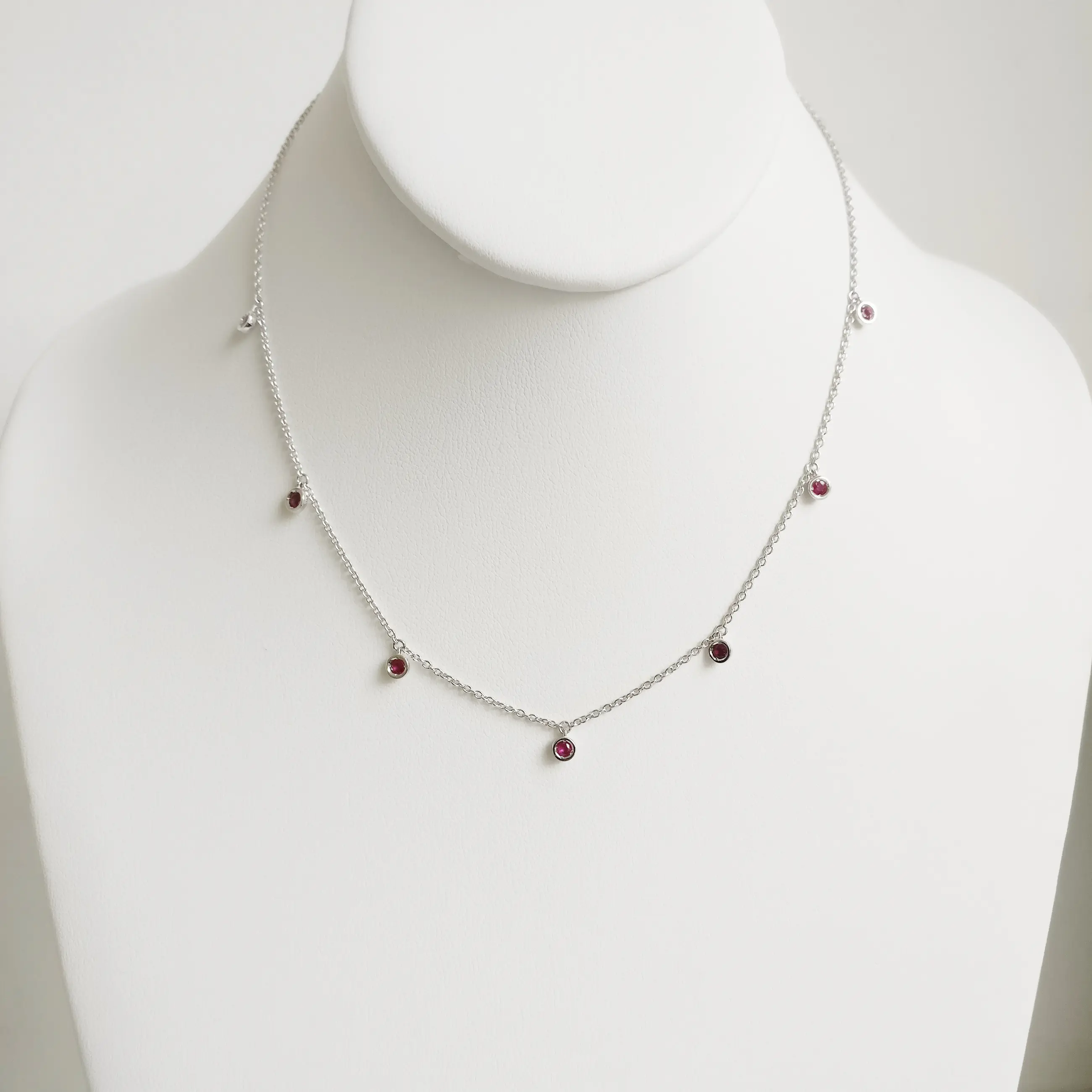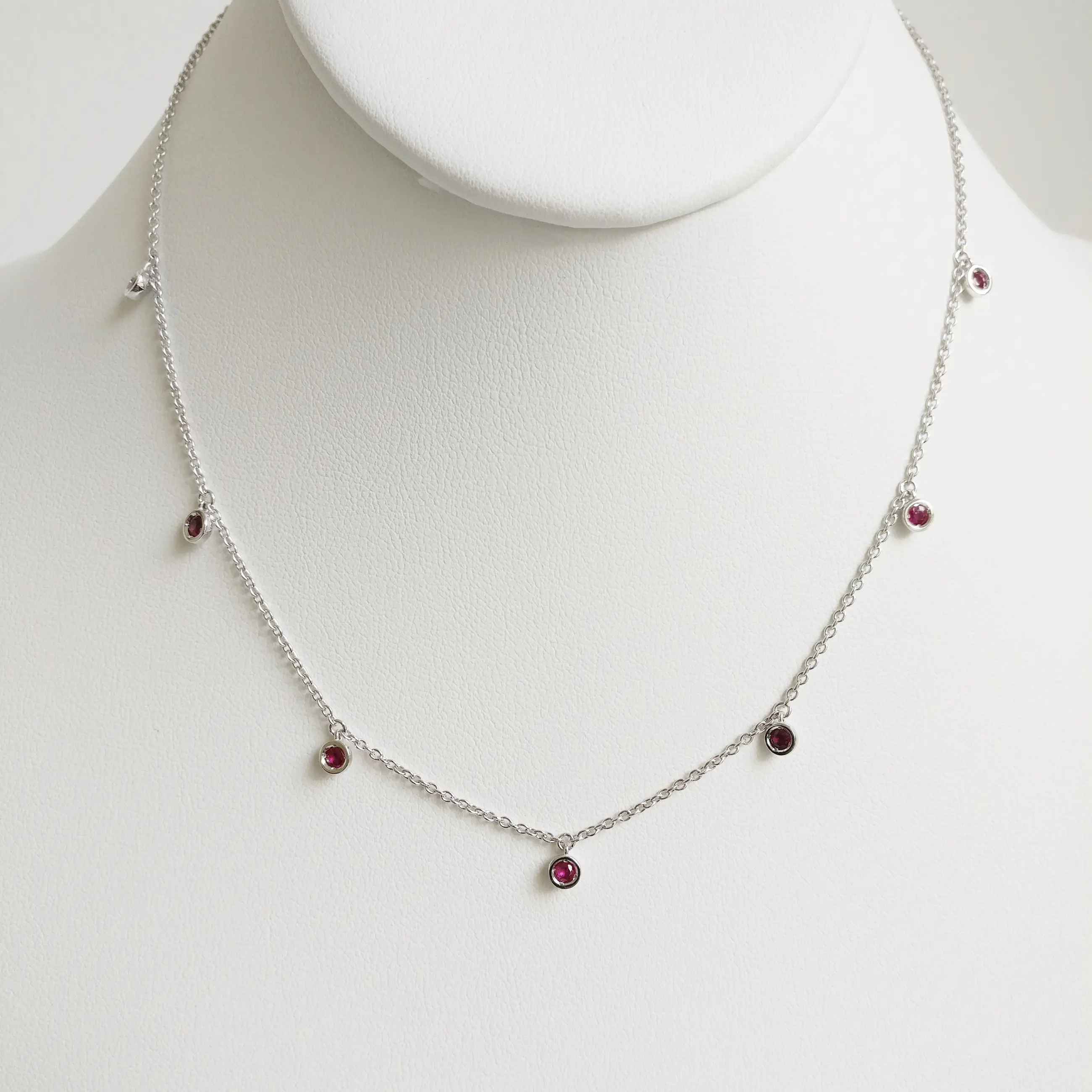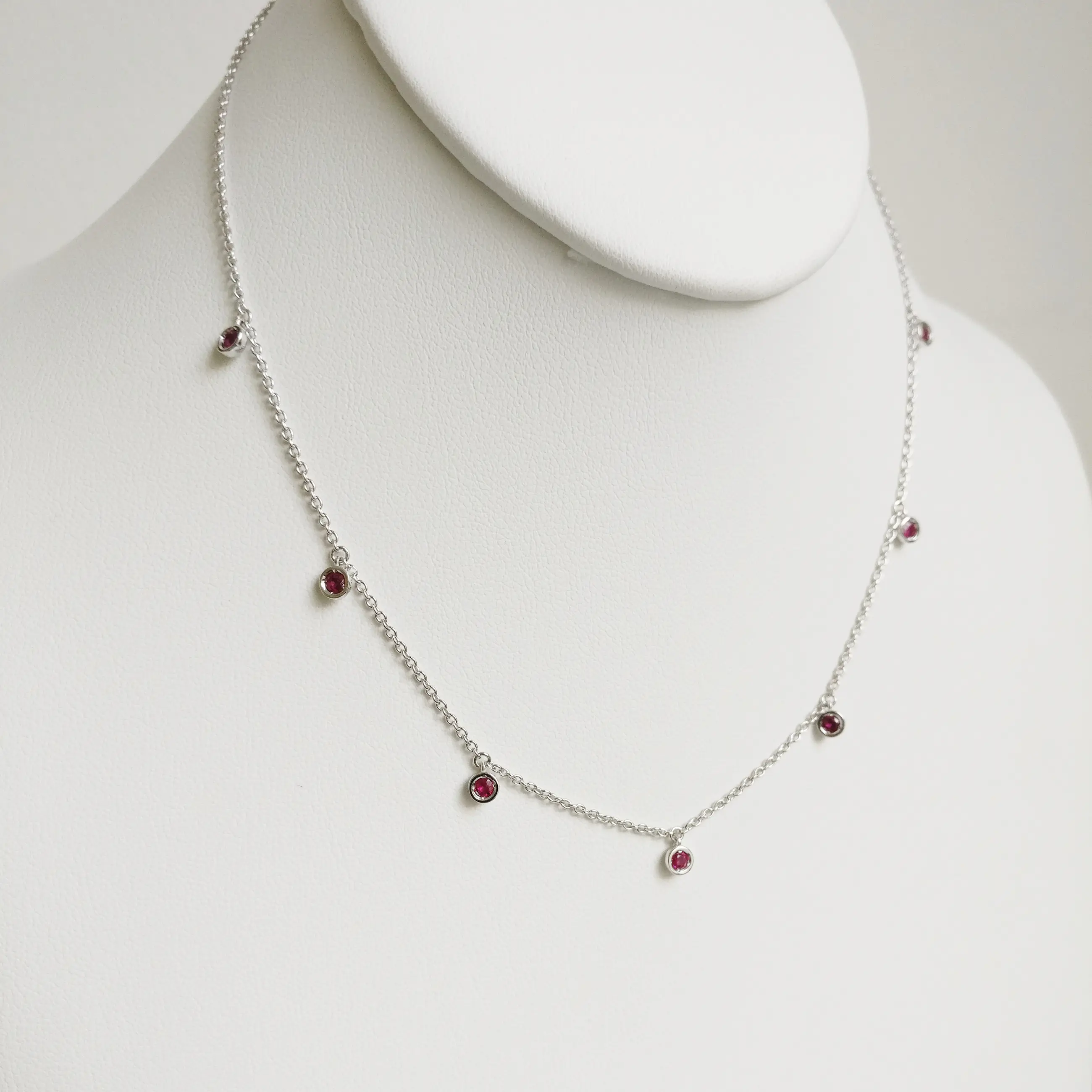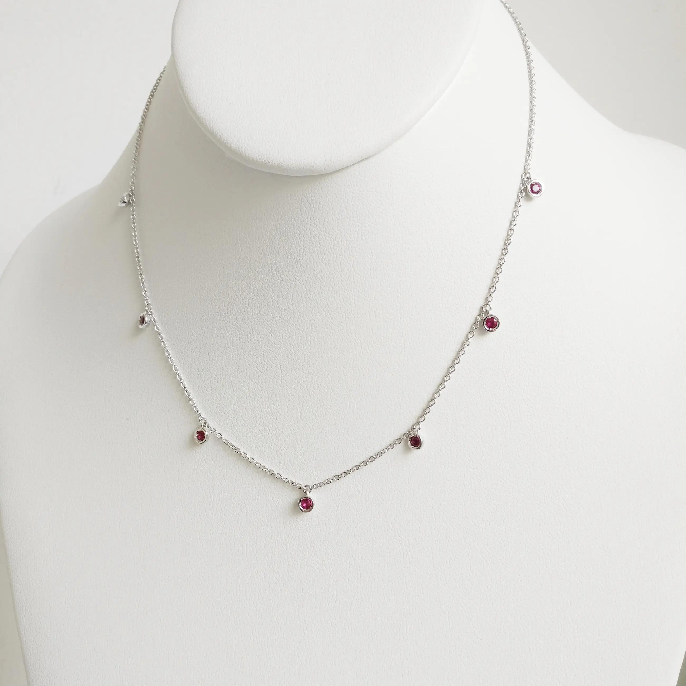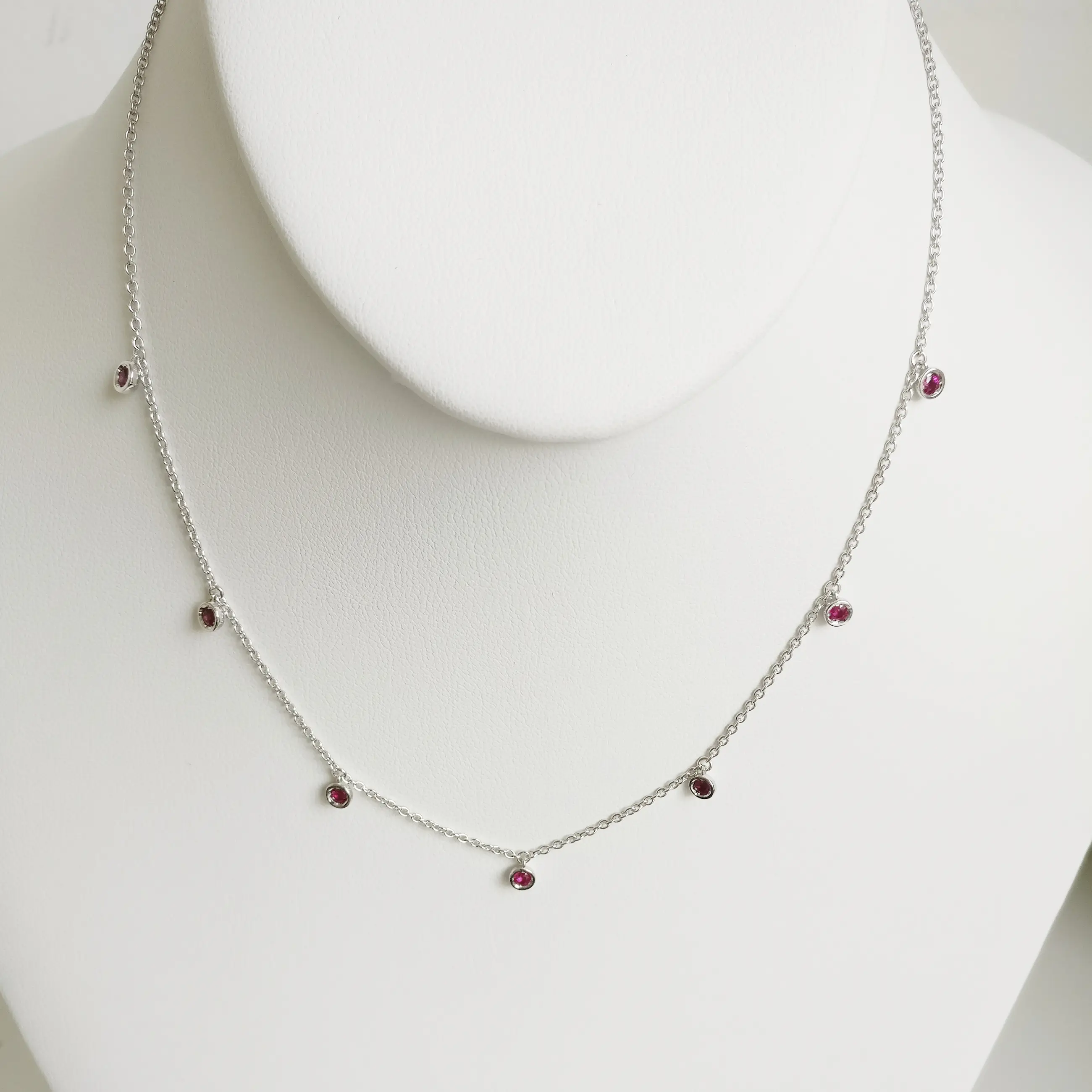 Elegante halsketting van 18-karaats witgoud met 7 natuurlijke robijnen.