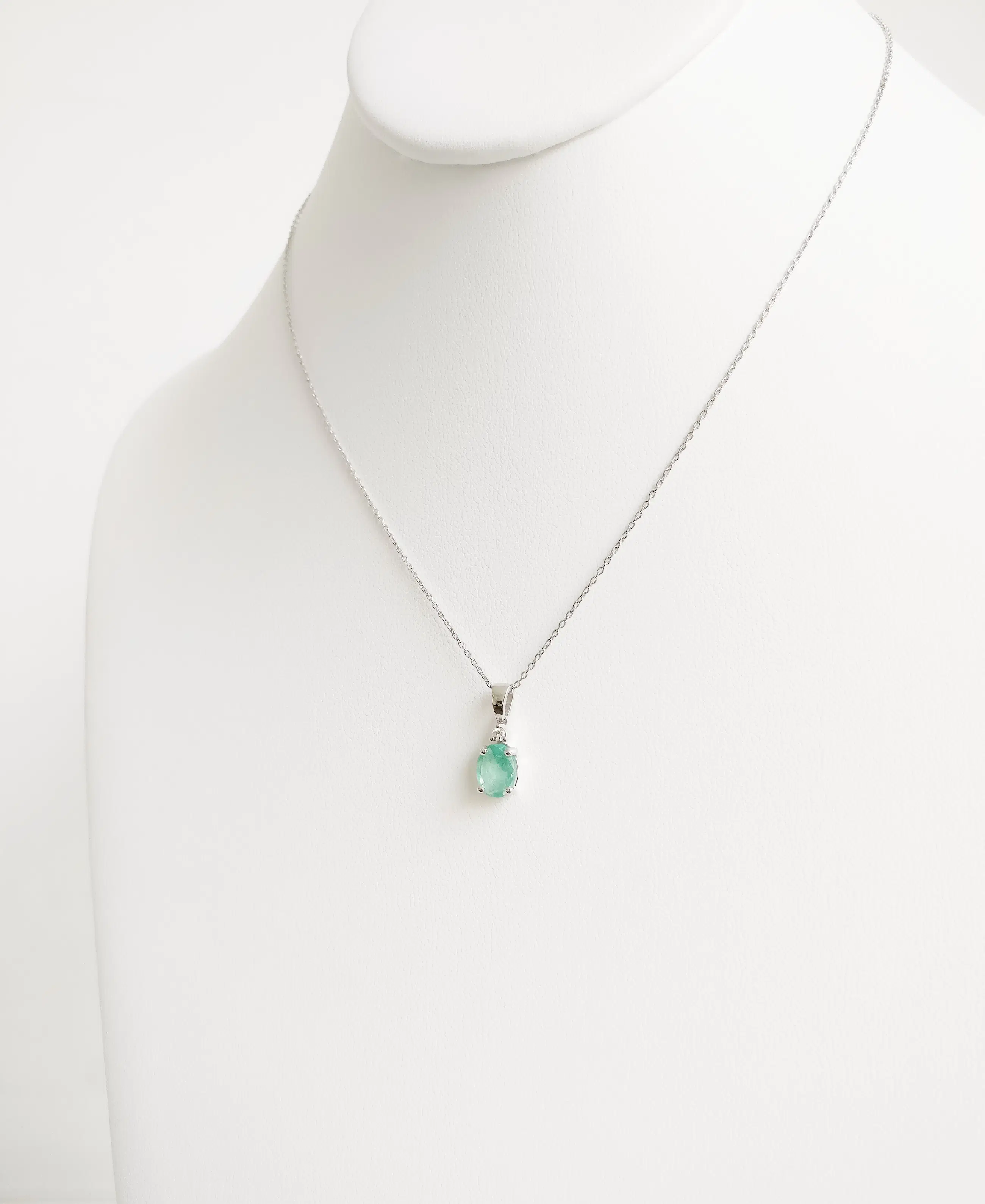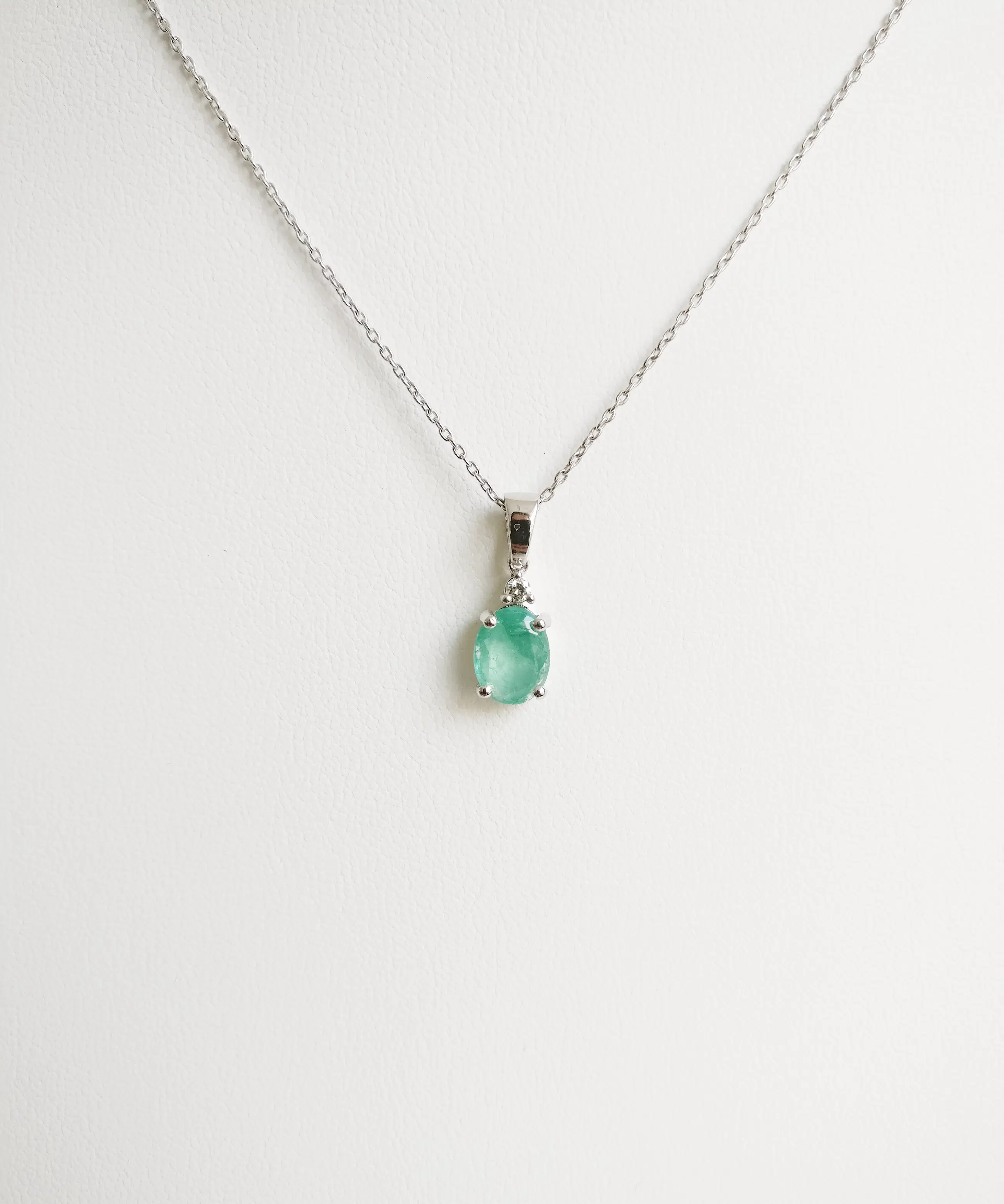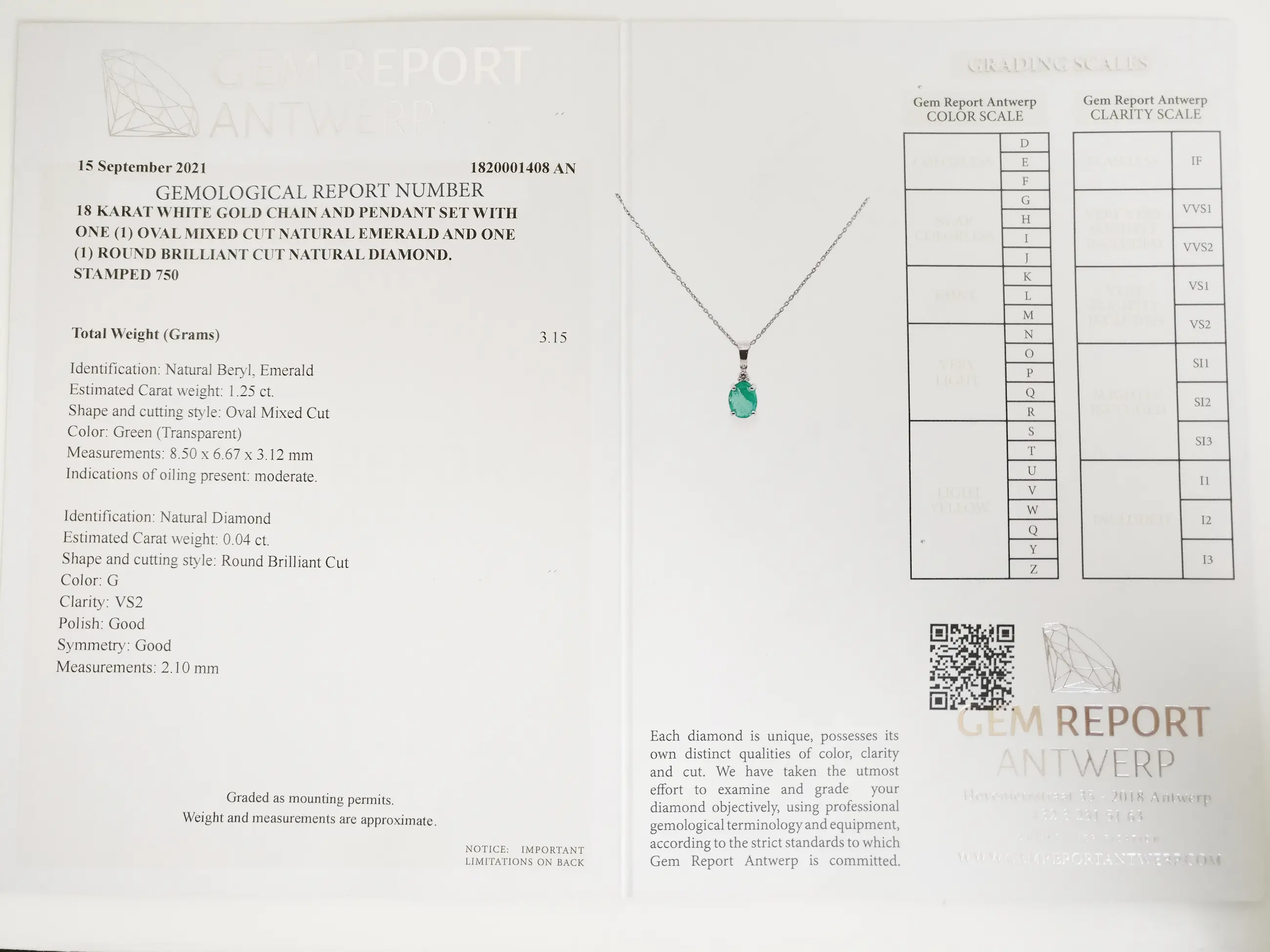 Hanger van 18-karaats witgoud, bezet met een natuurlijke smaragd en diamant, met een ketting van 18-karaats witgoud.