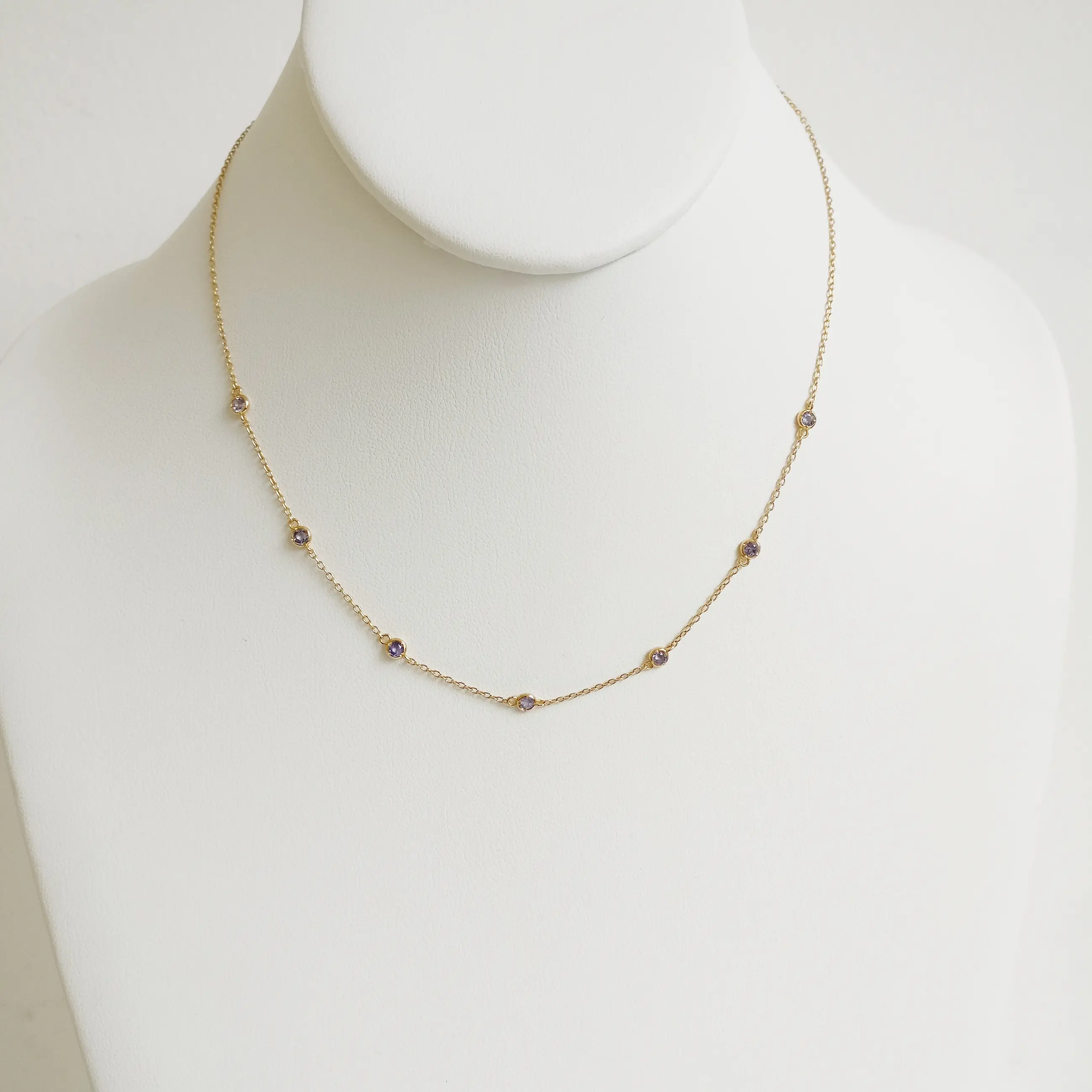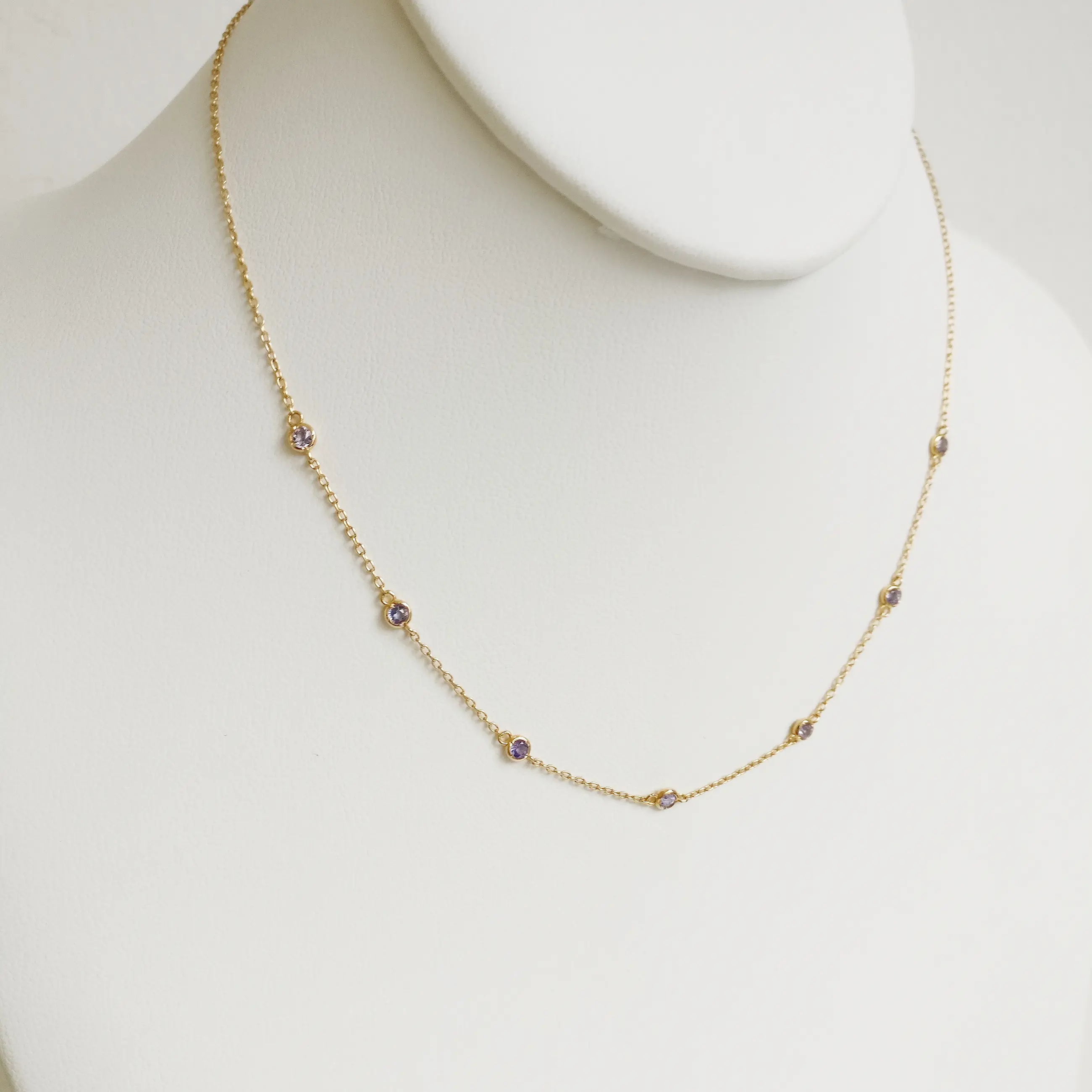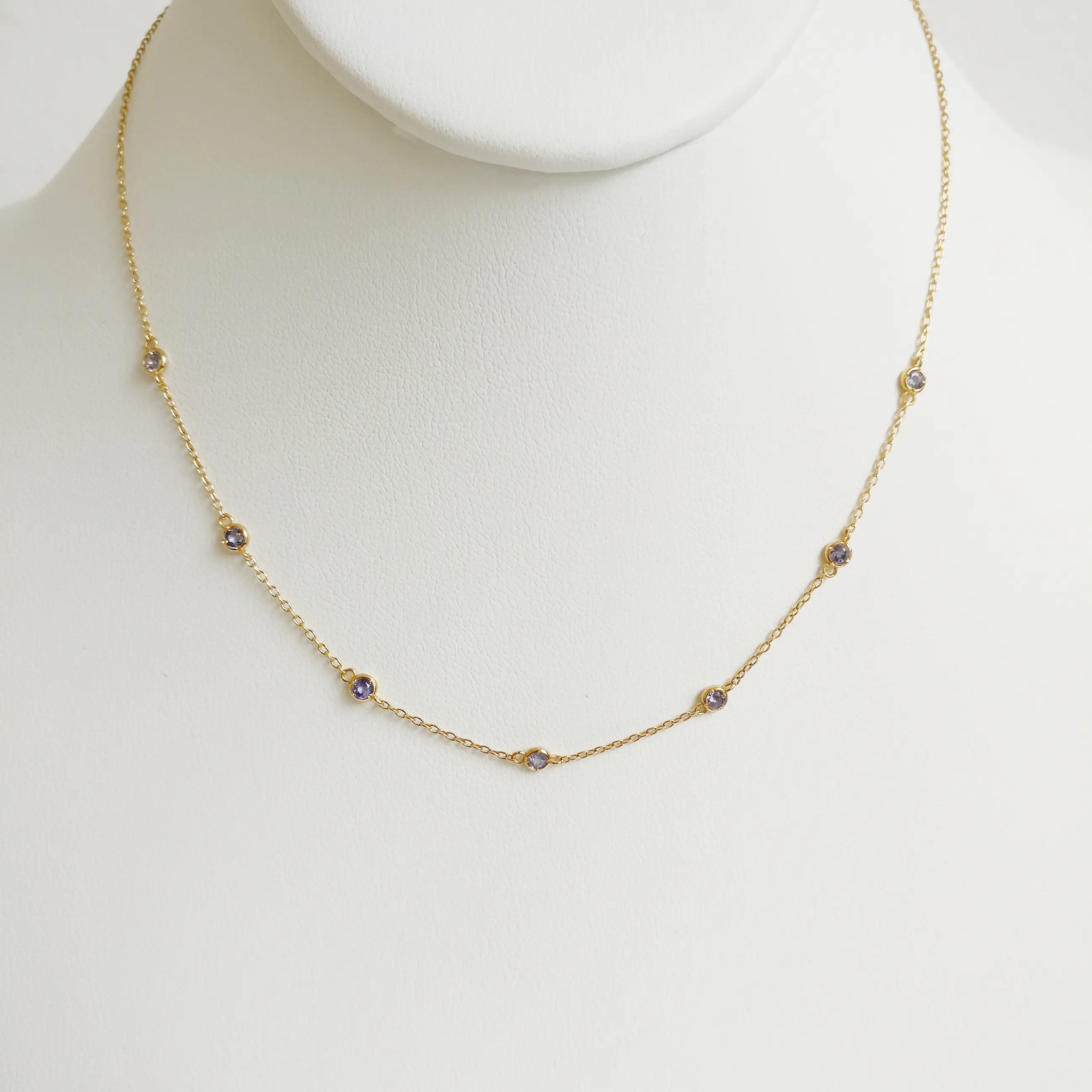 Schitterende halsketting van 18-karaats geelgoud met 7 tanzanietstenen. Brutogewicht: 2,55 gram Gewicht van de steen: 0,50 karaat