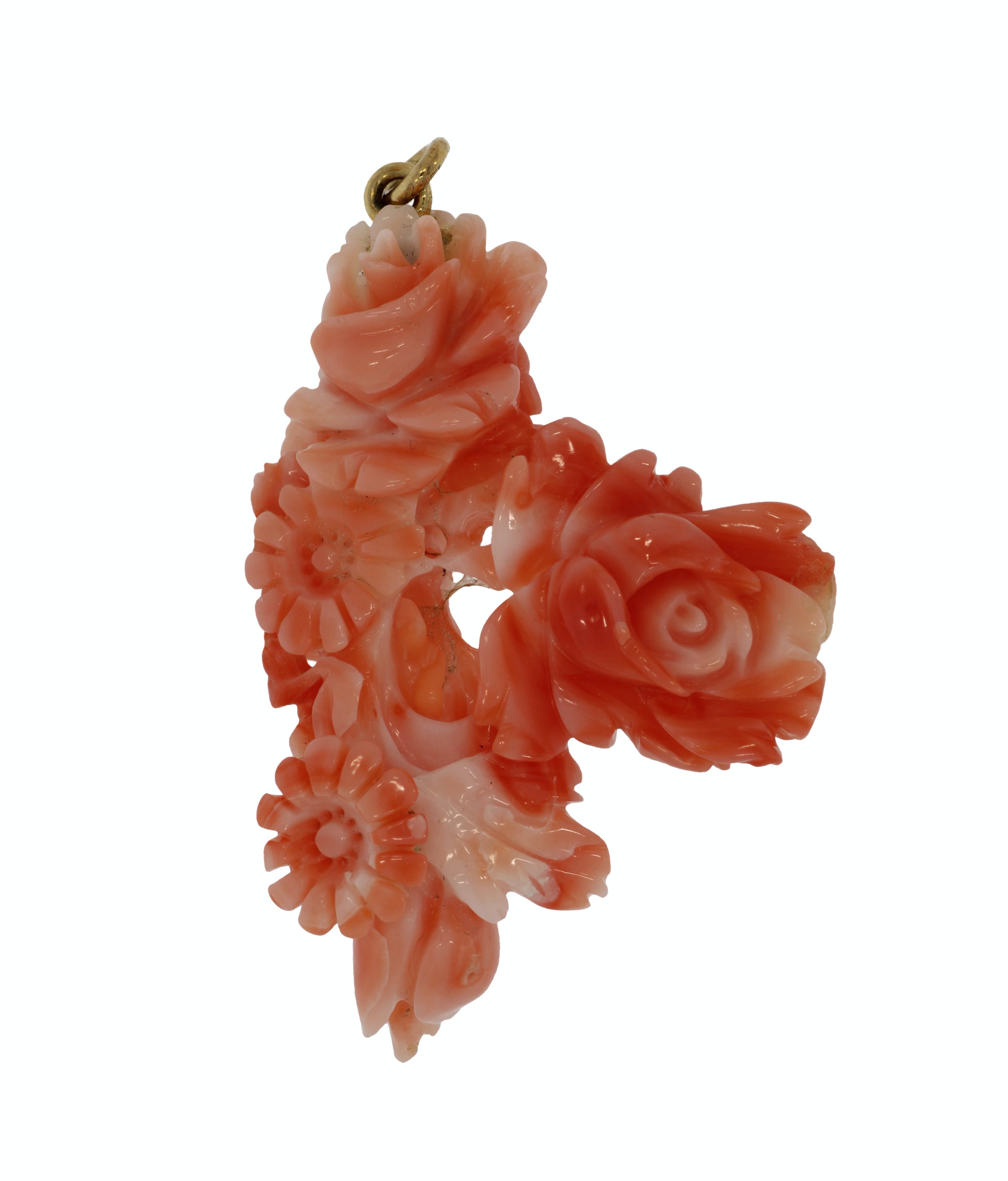 Grote handgesneden koraal hanger in de vorm van rozenbloemen aan 18 karaats gouden hangoog. Uniek en in opdracht vervaardigd sieraad, verzamelaarsitem. Afmetingen van dit sieraad zijn 52x34mm, gewicht 15 gram.