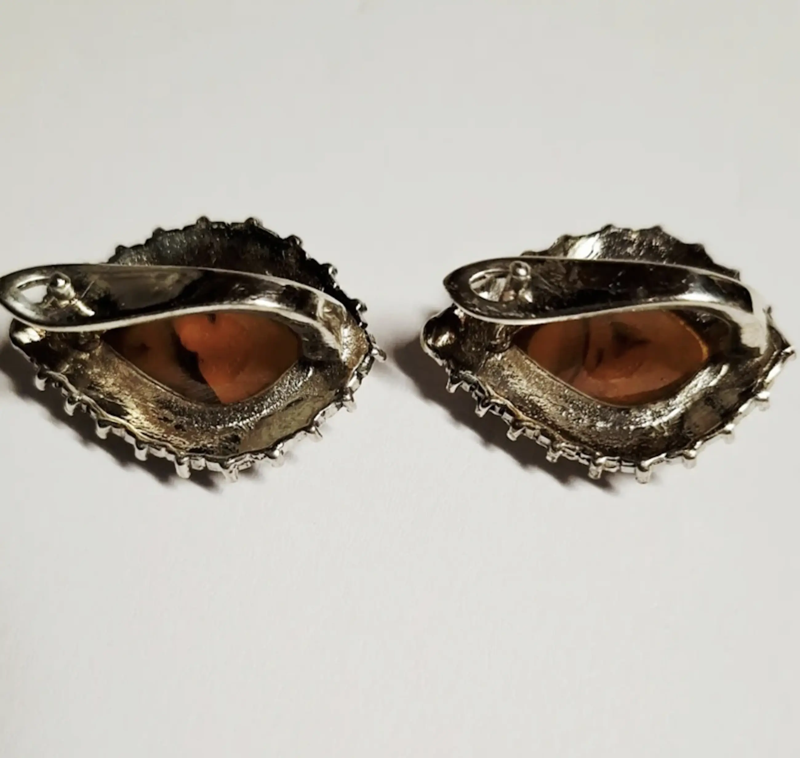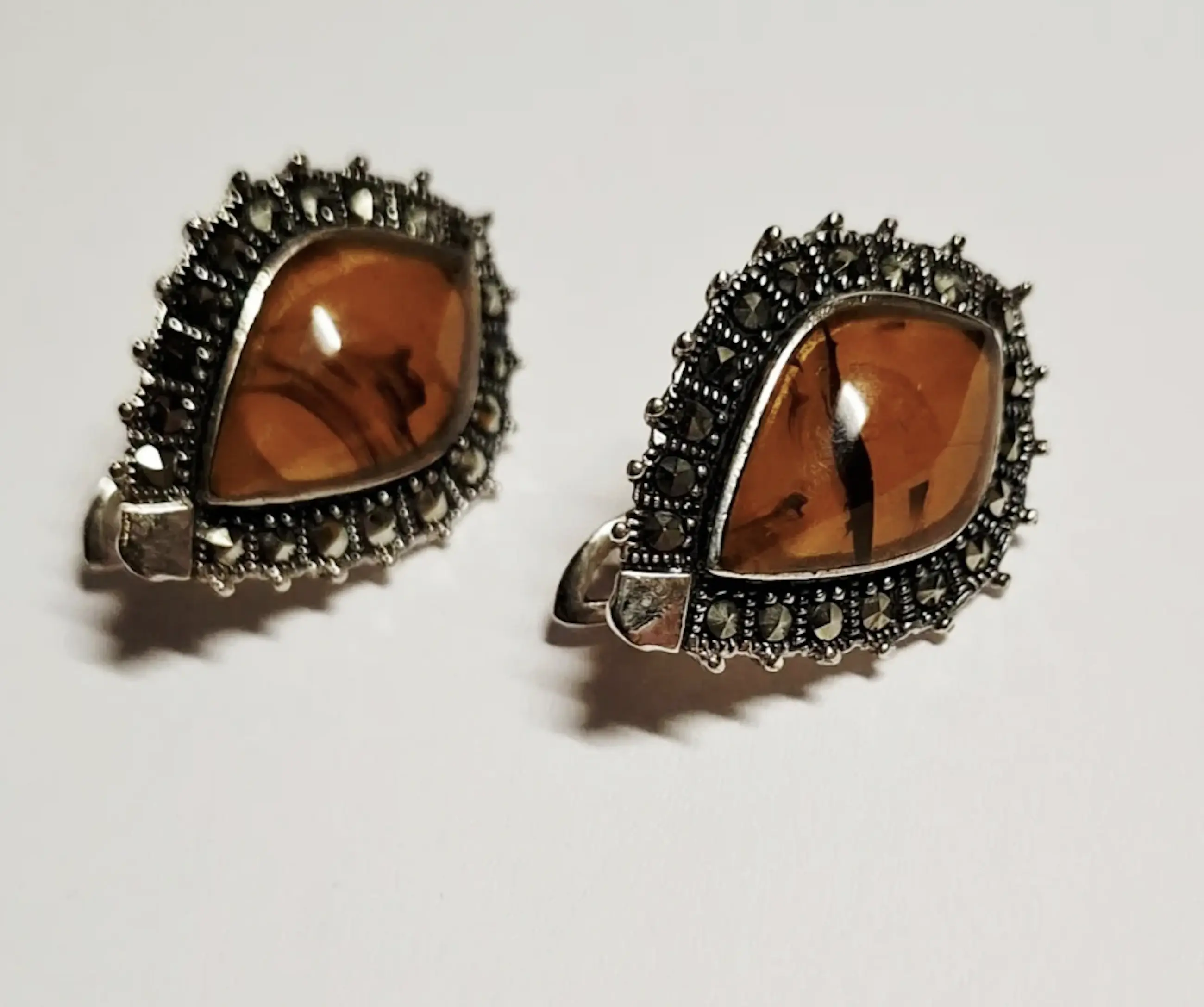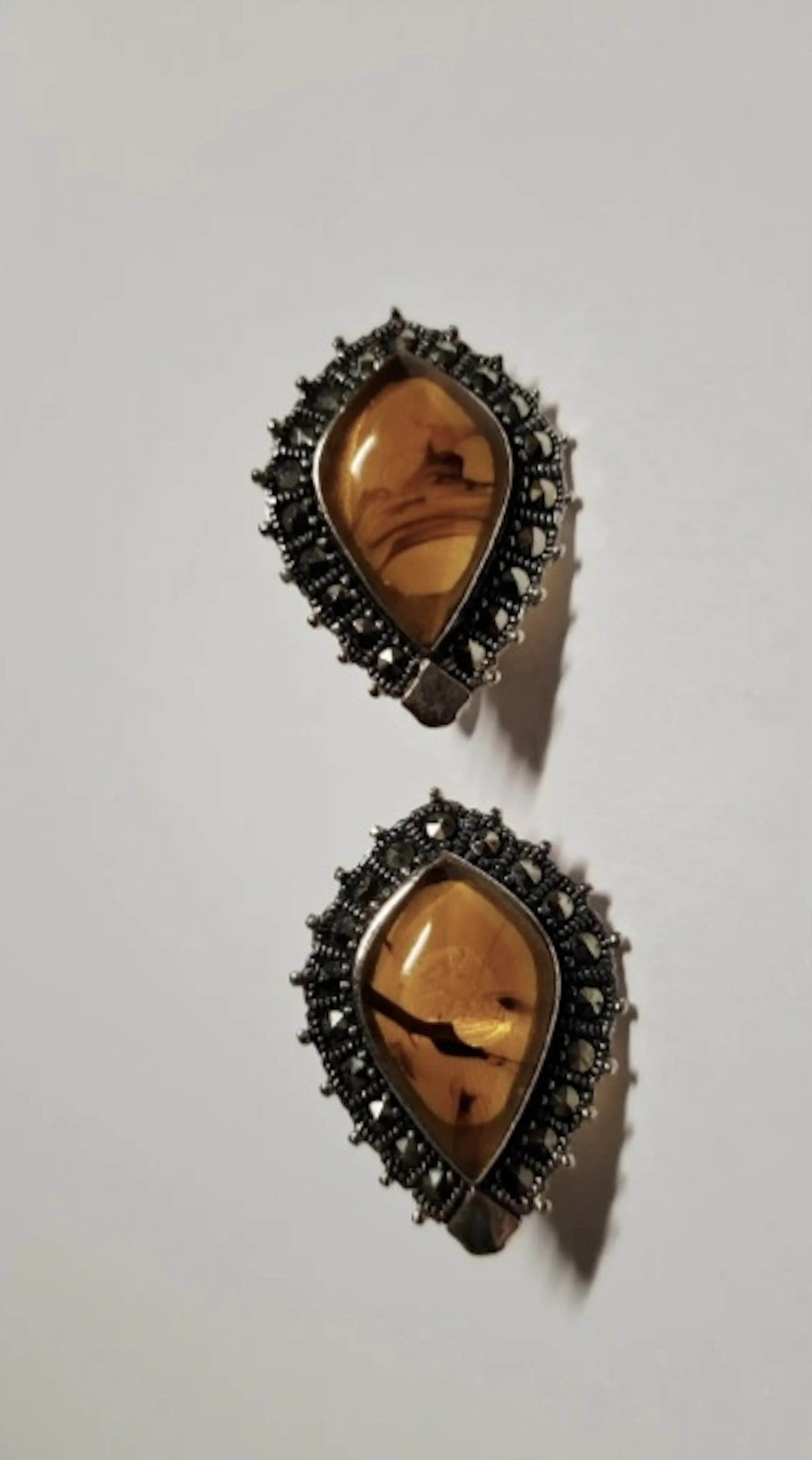 De setting van deze druppelvormige oorbellen is zilver en de rand heeft een mooi marcasiet setting. Het midden heeft een koepelvormig stuk gouden Amber met een open achterkant.