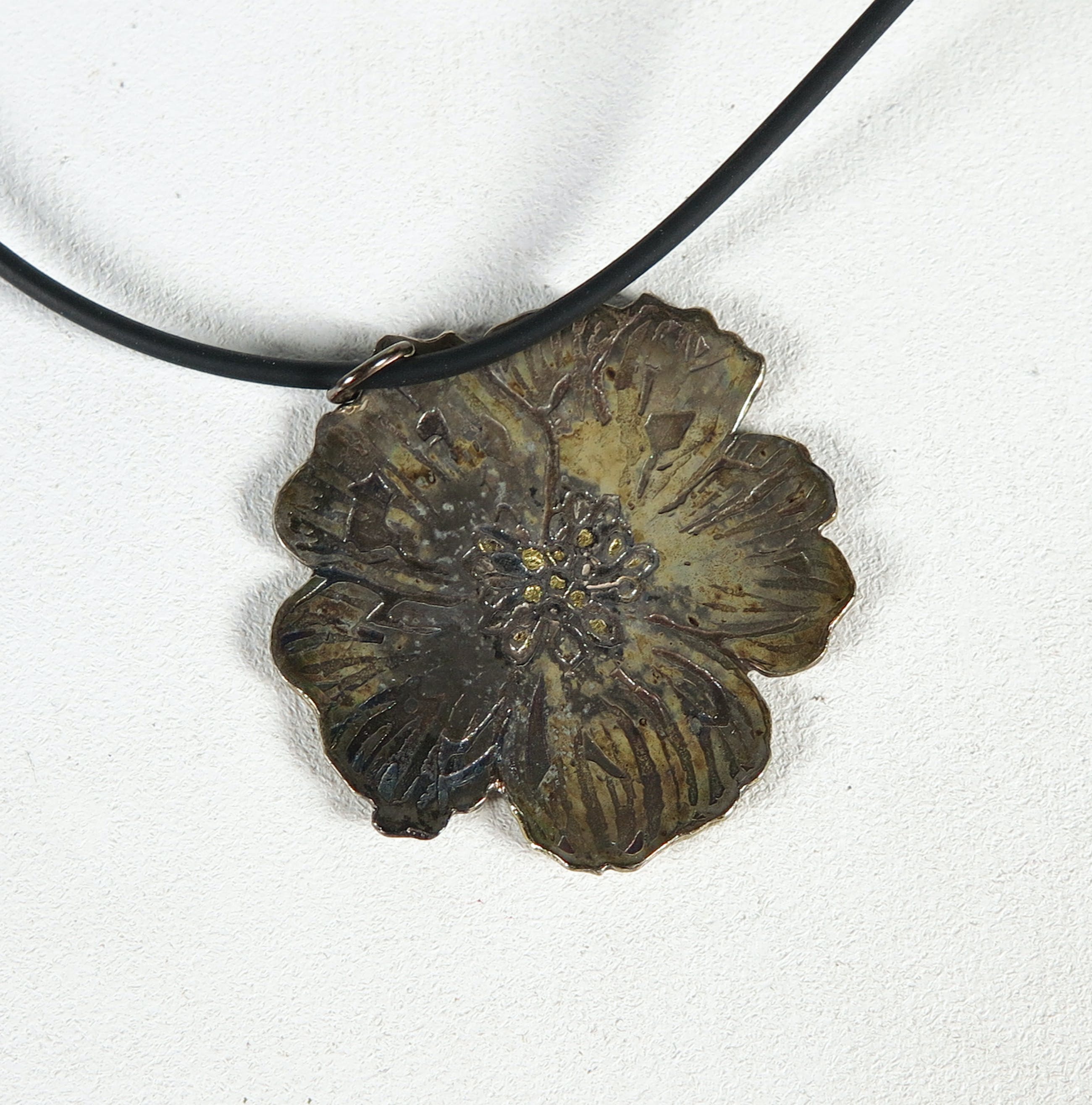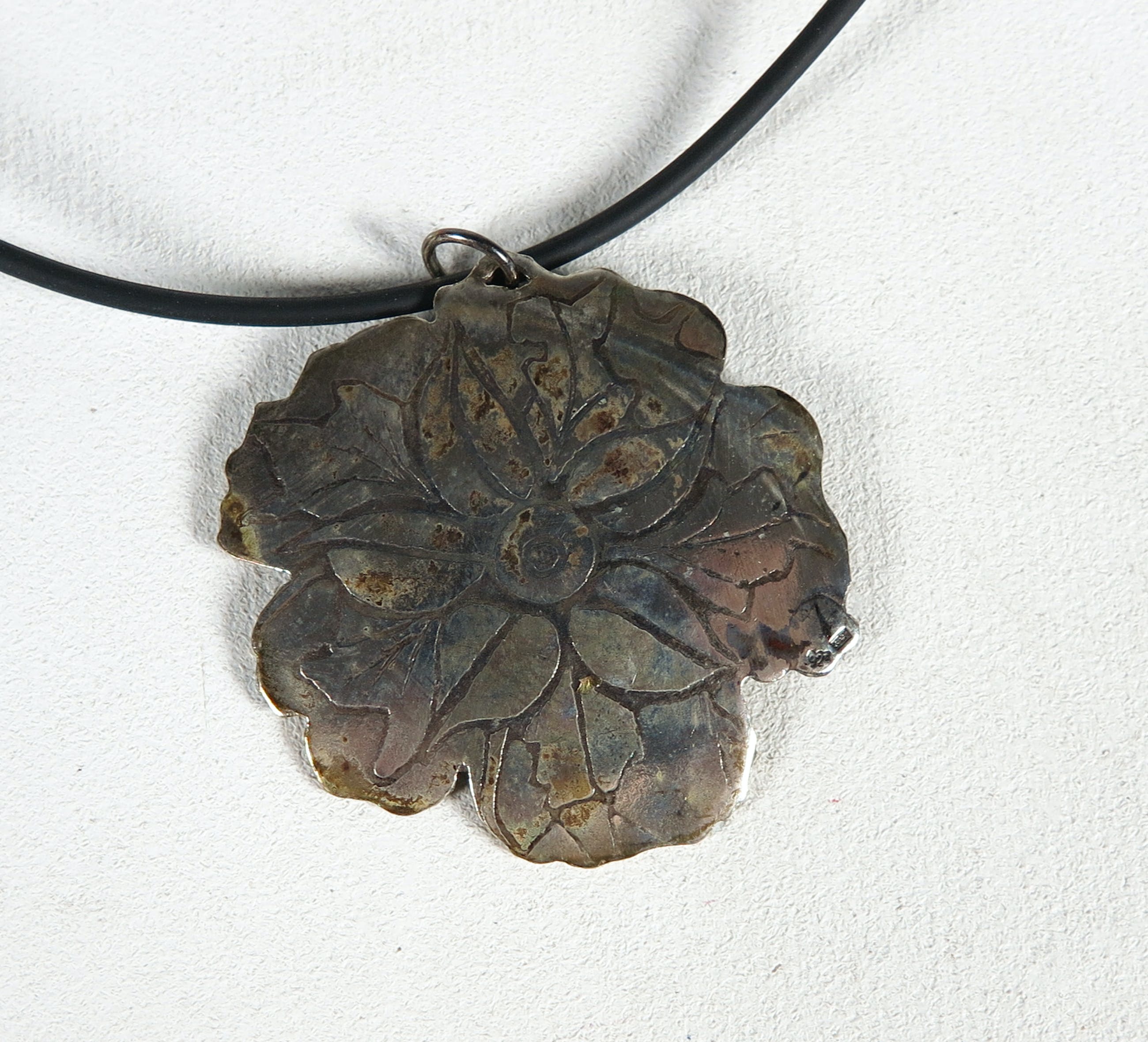 Zilveren hanger met met koord en zilveren sluiting, door Yoka Voorbach. De hanger is gemerkt (925), de sluiting is door ons getest.