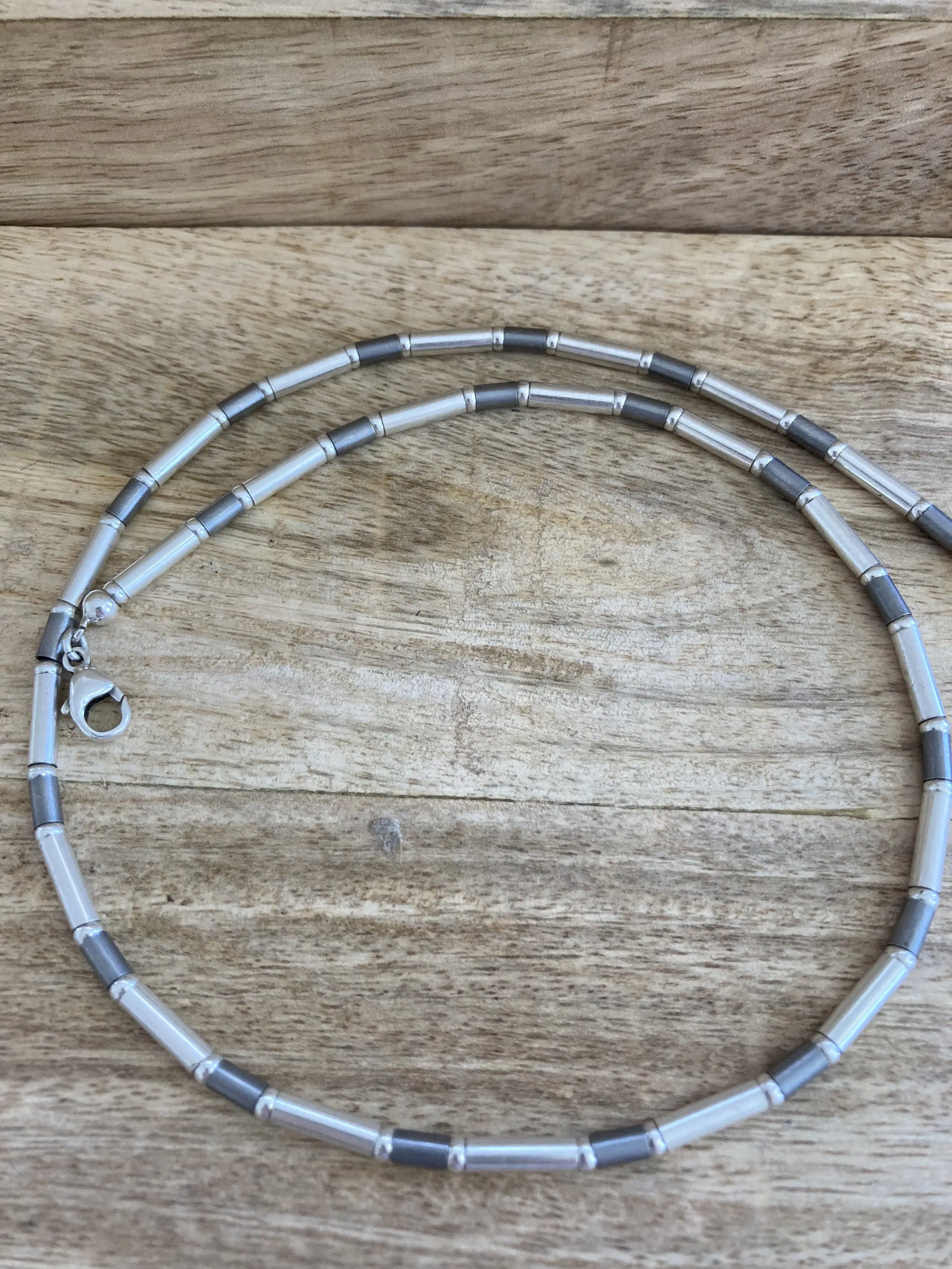 Zilver gecombineerd met titanium staafjes collier op staaldraad geregen.
