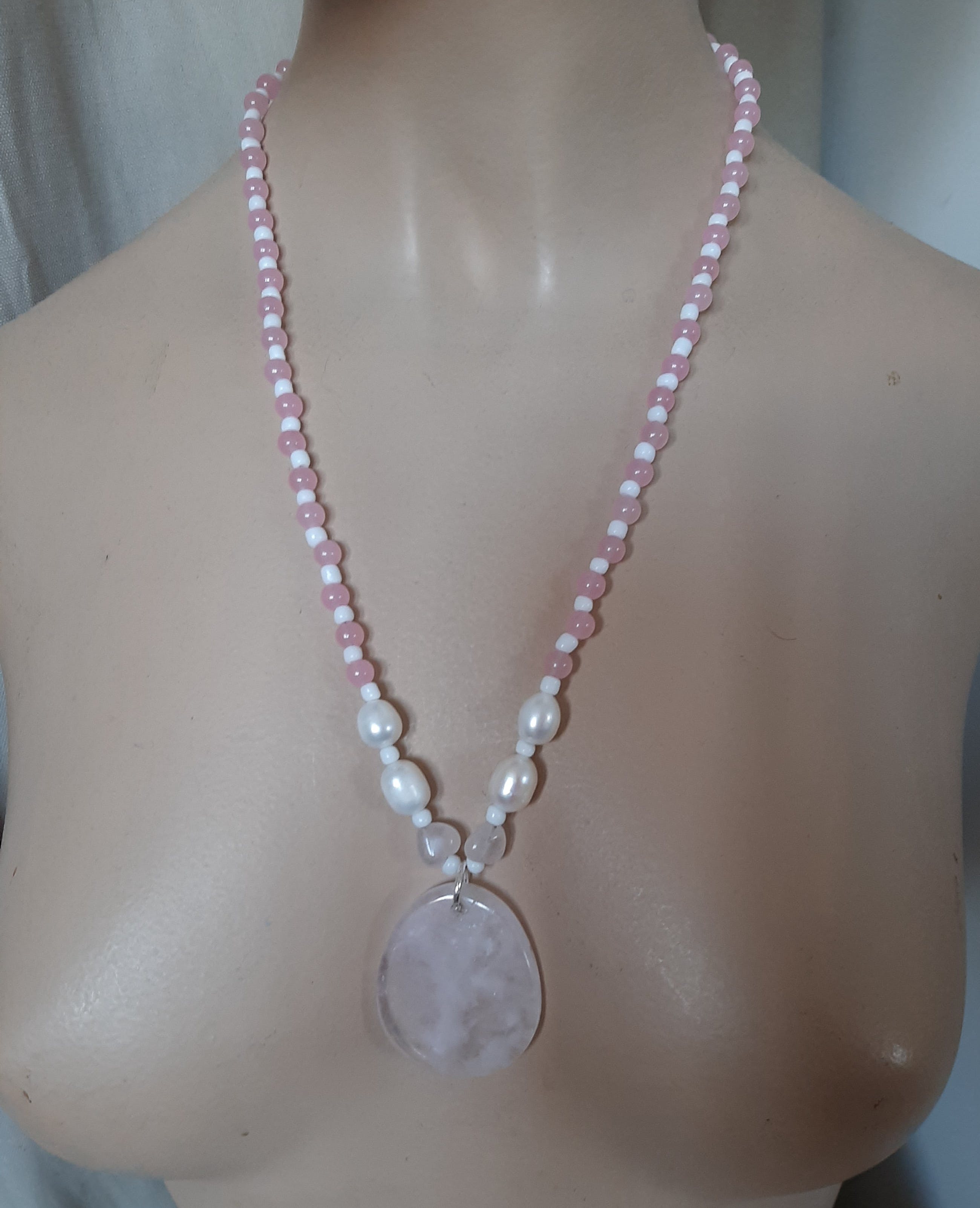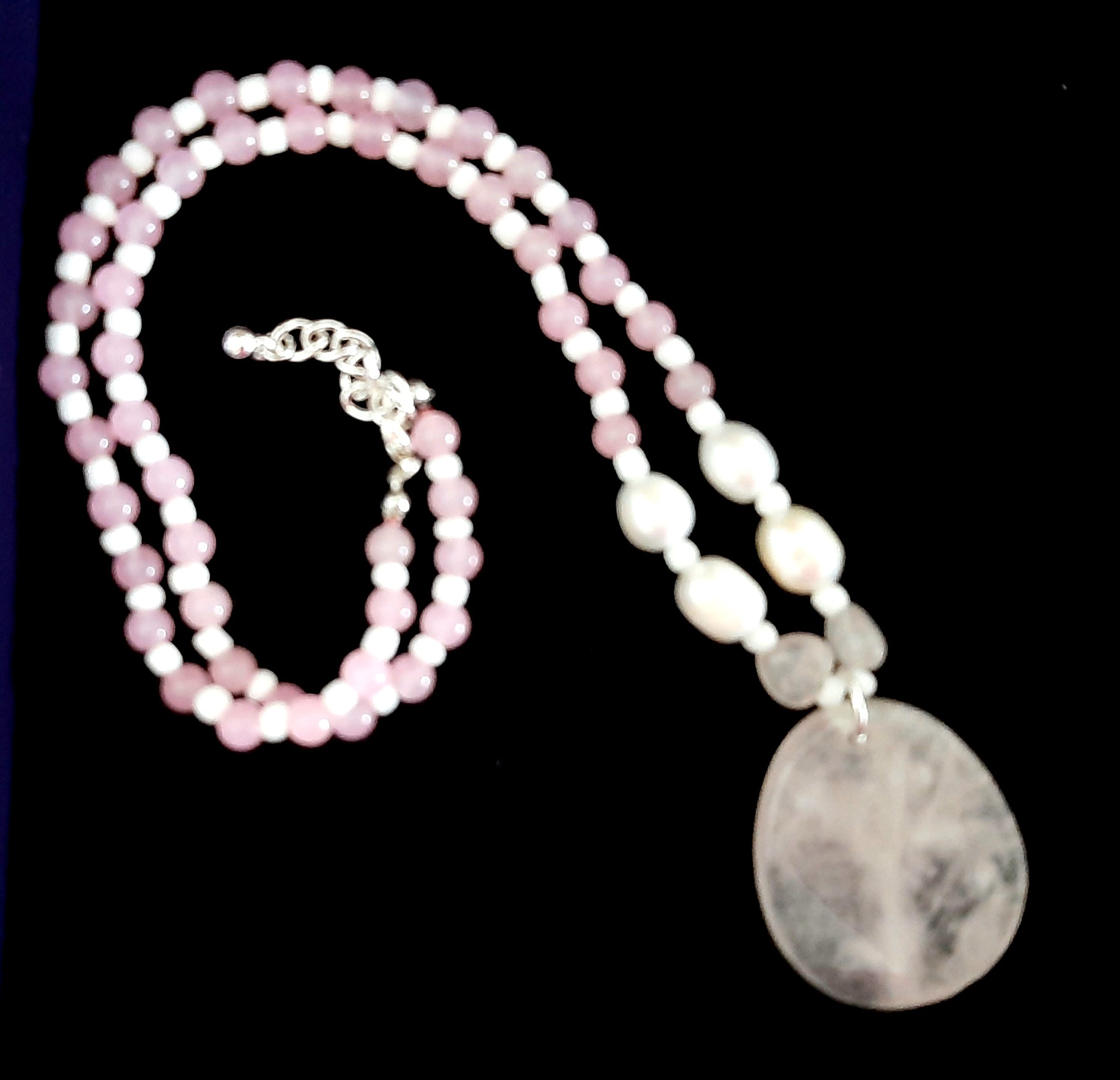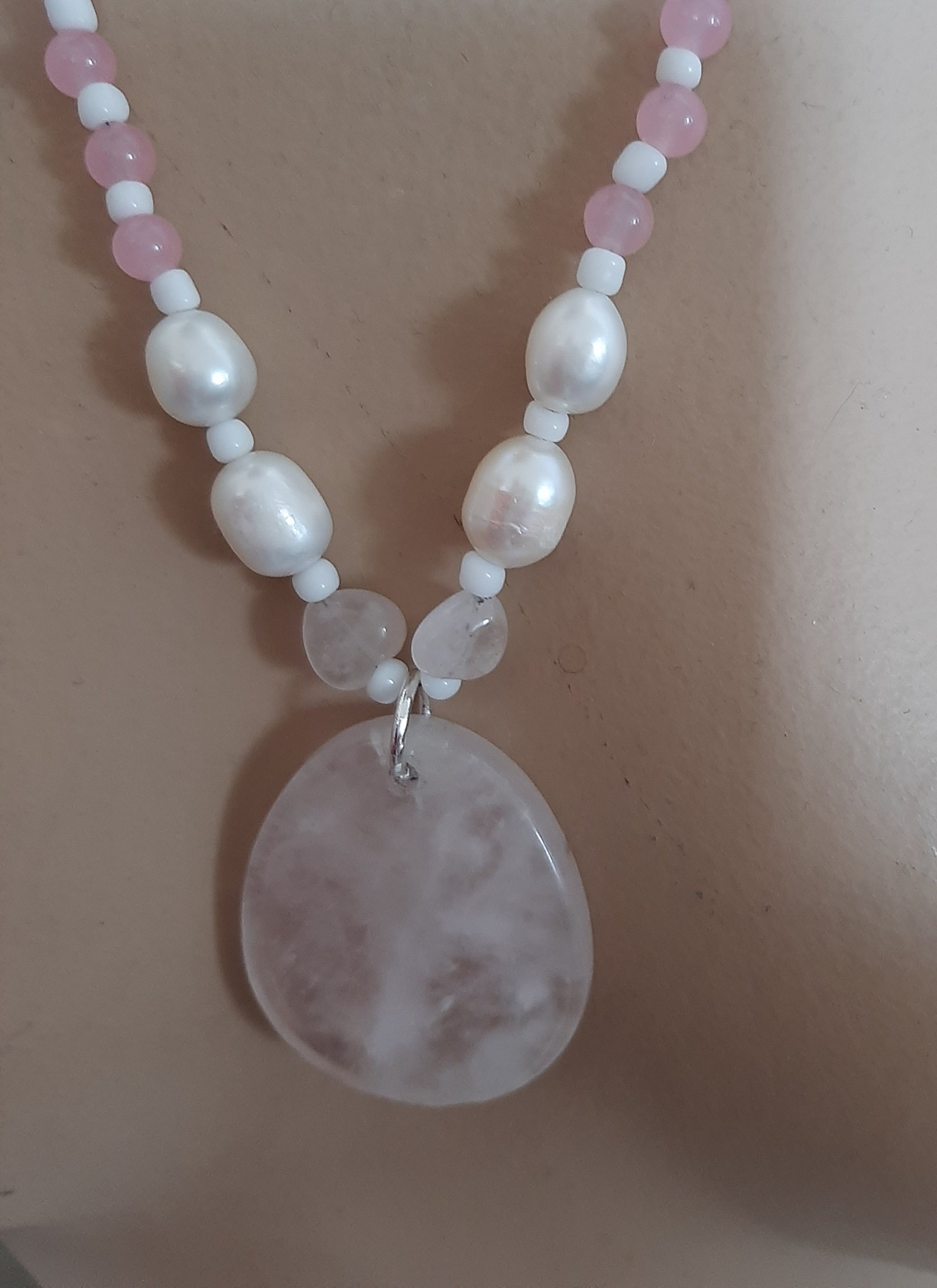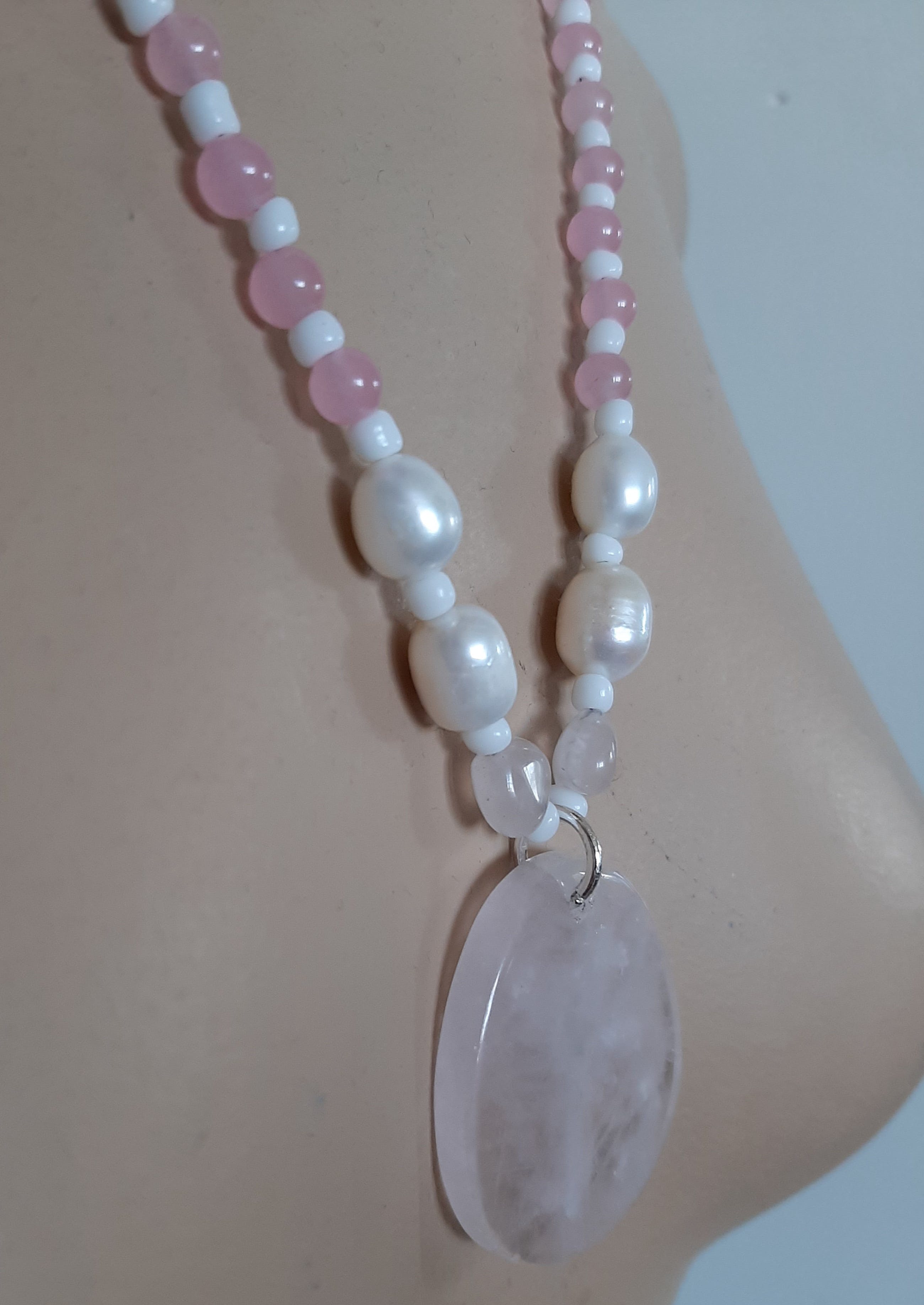 Zilveren slot, gemerkt 925 Echte Rozenkwarts (Love steen) hanger en twee hardjes,4 grote zoetwater parels,roze jade kralen, verder witte keramiek kralen.
