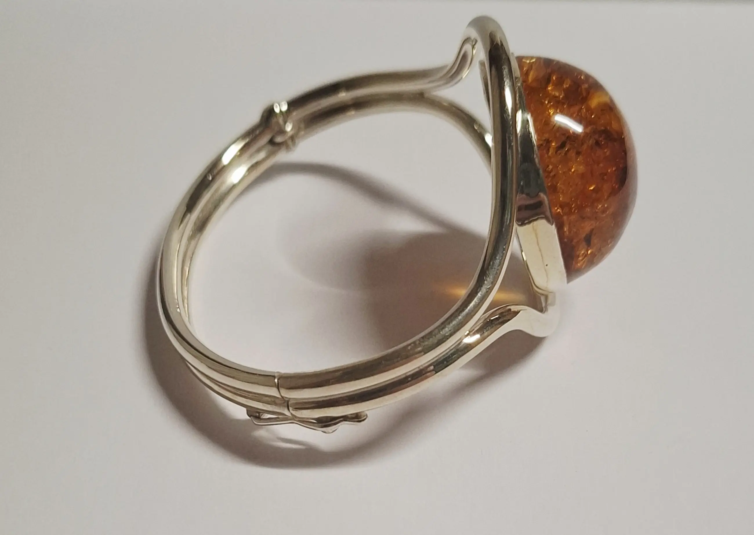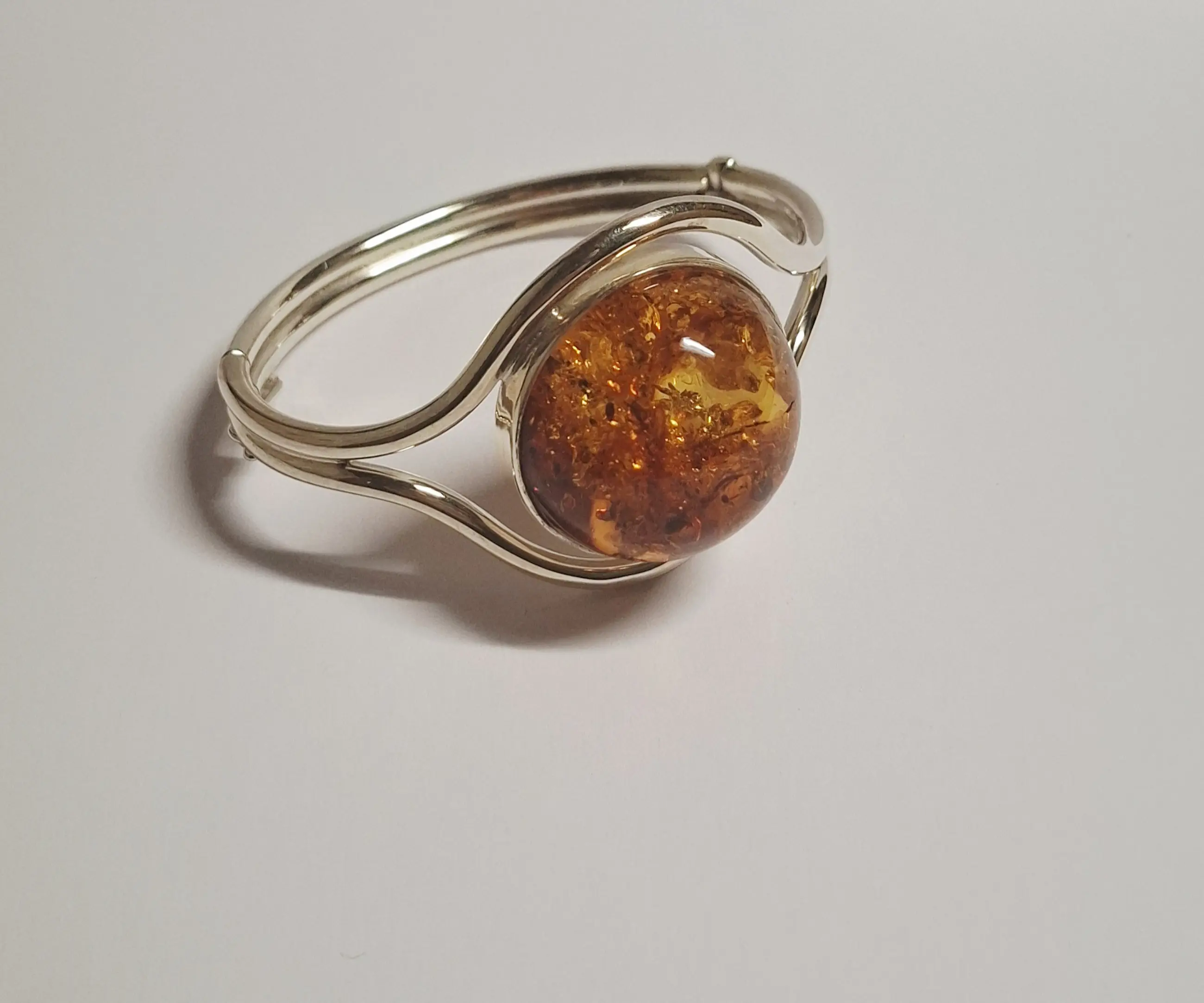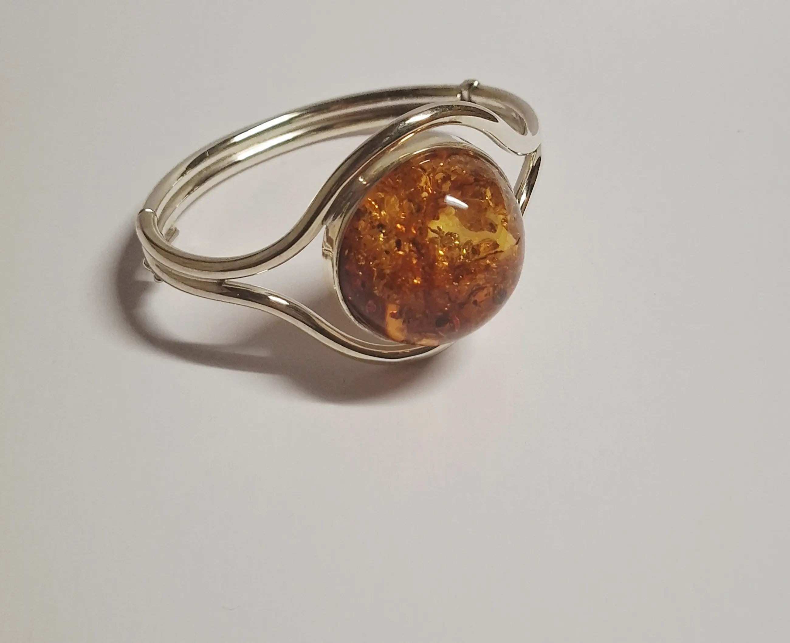 Een prachtige ambachtsman gemaakt 925 zilveren open armband met een grote natuurlijke Baltische ambersteen. Deze Art Nouveau geïnspireerd vintage armband is versierd met mooi gedetailleerde blad ornament. Het middelpunt van deze armband is de grote ovale oranje steen van rijke honing kleur met meerdere insluitsels.