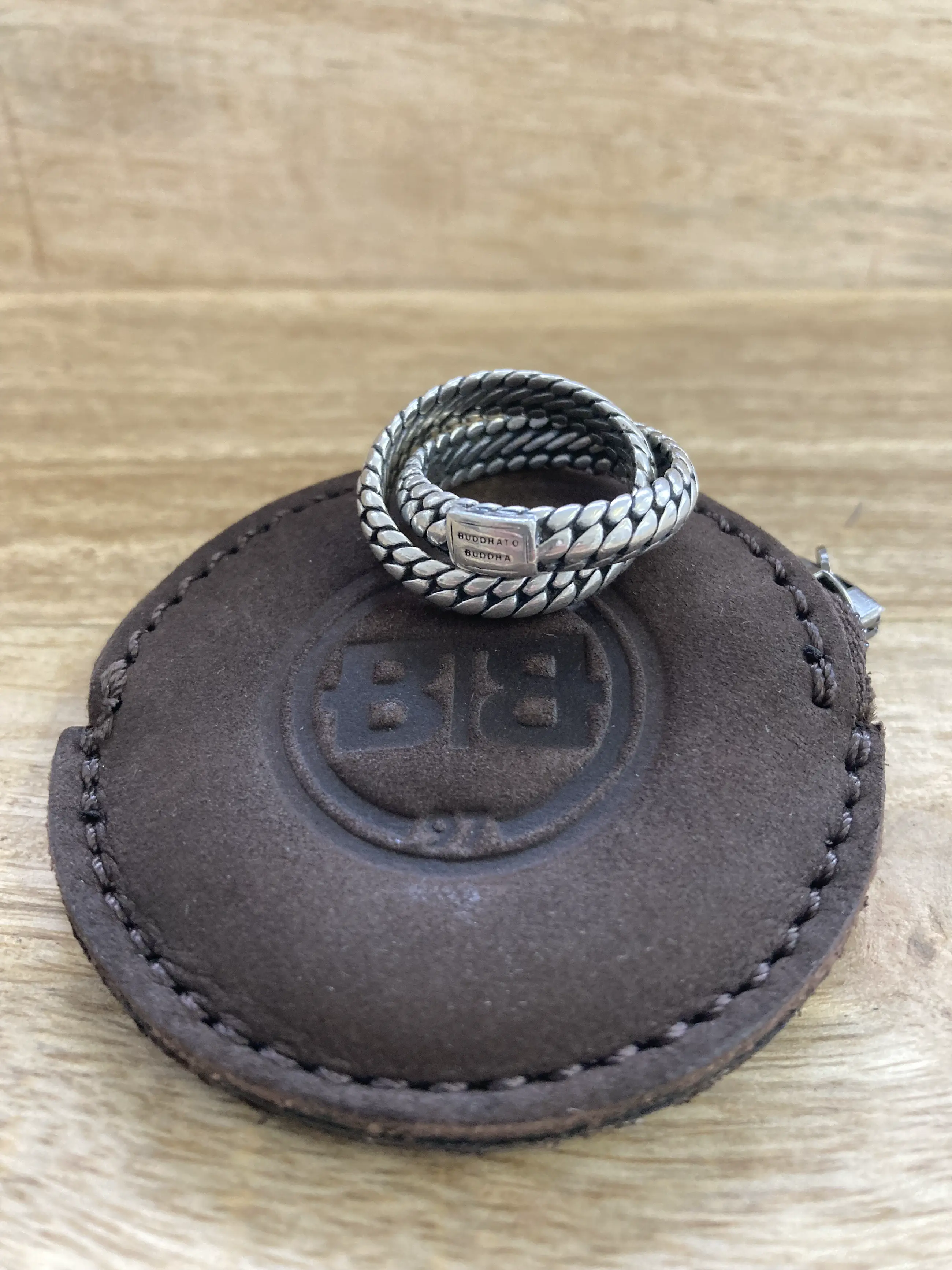 Zilveren Boeddha to Boeddha ring, tweedelig in elkaar gevlochten.