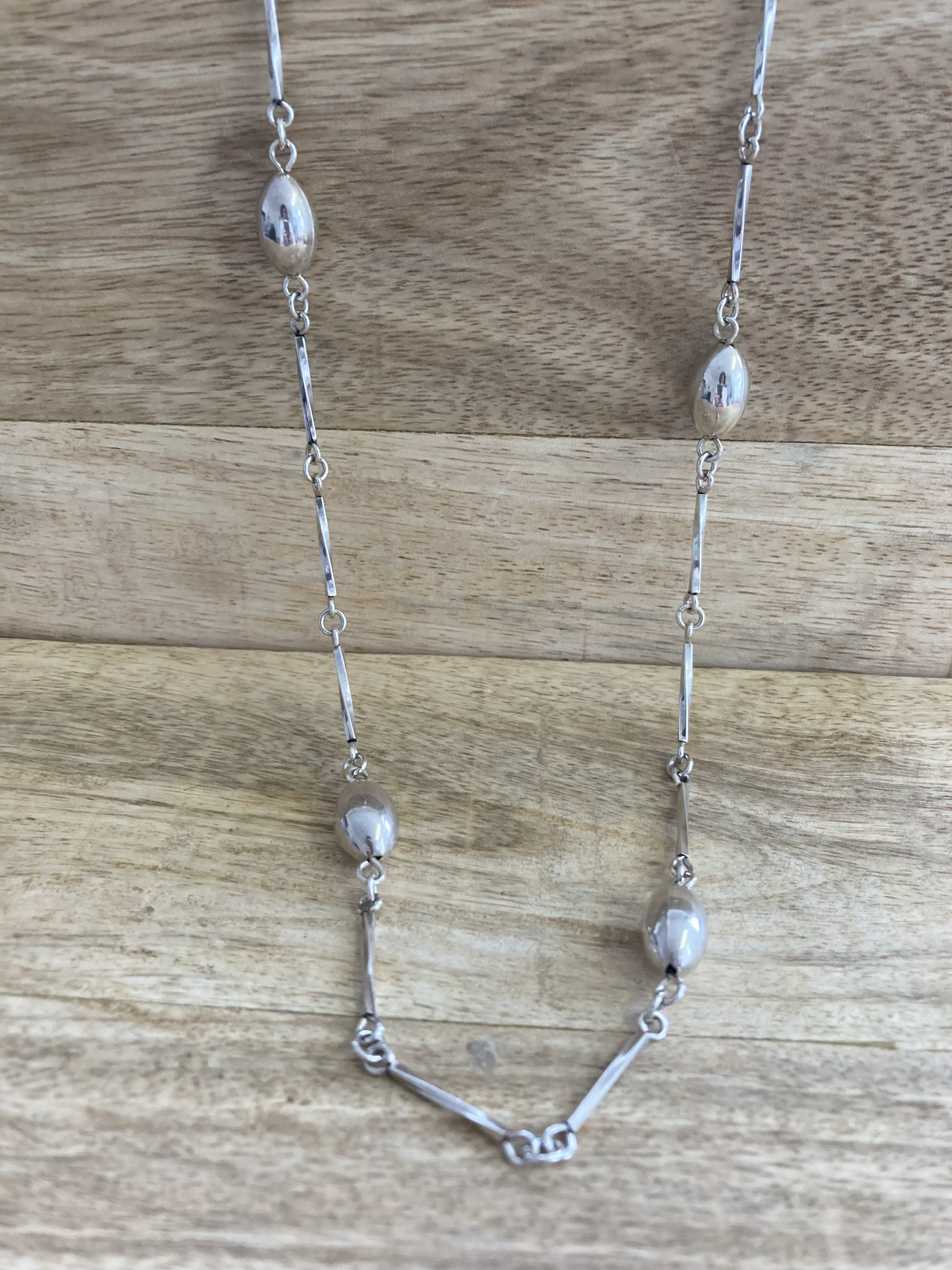 Zilveren ketting met gedraaide staafjes en zes koffieboonvormige schakels.