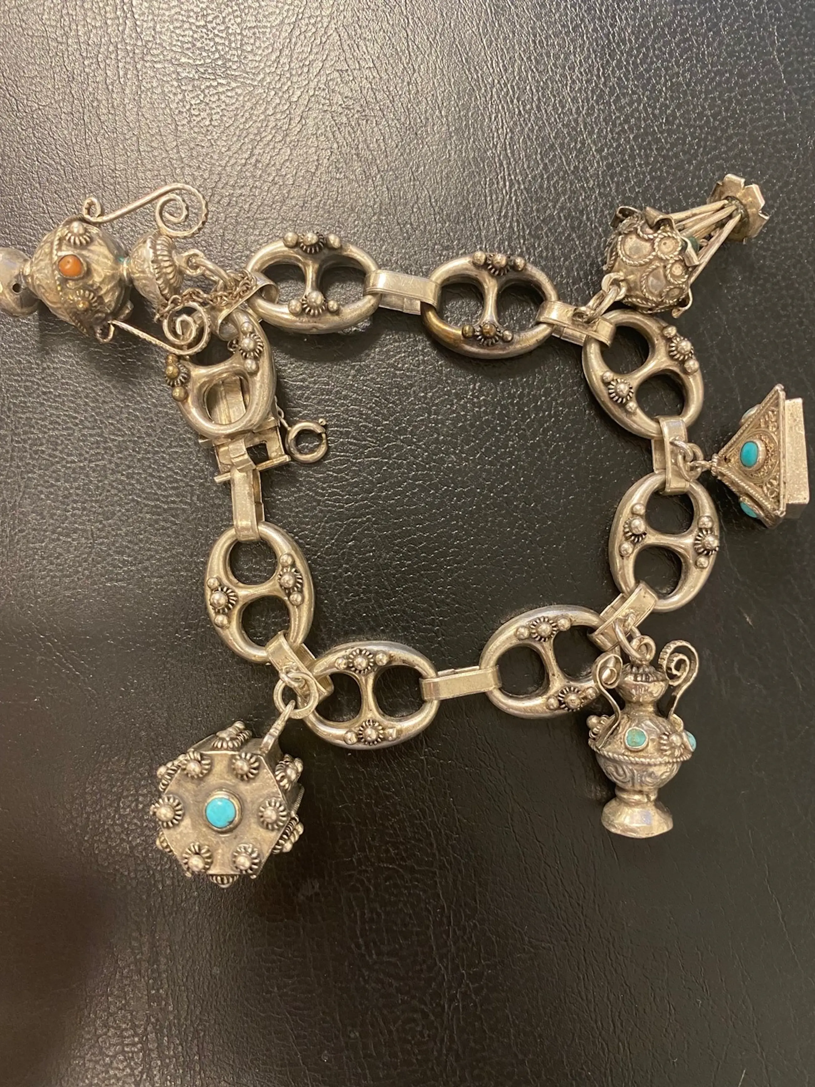 Zilveren Koffieboon Armband met Bedels Bezet met turkoois en knopen. Vermoedelijk Zeeuws Totaal gewicht 42.75 gram