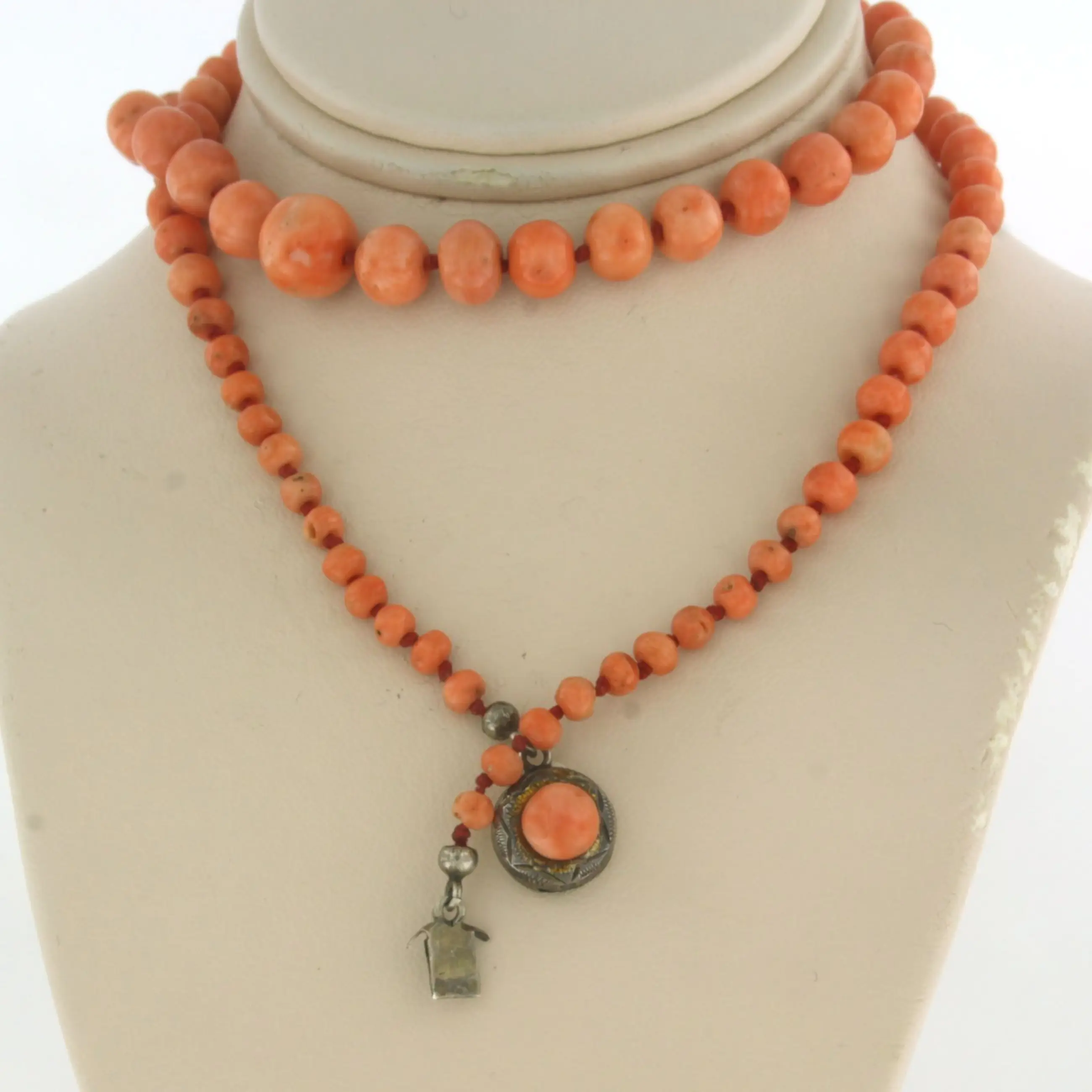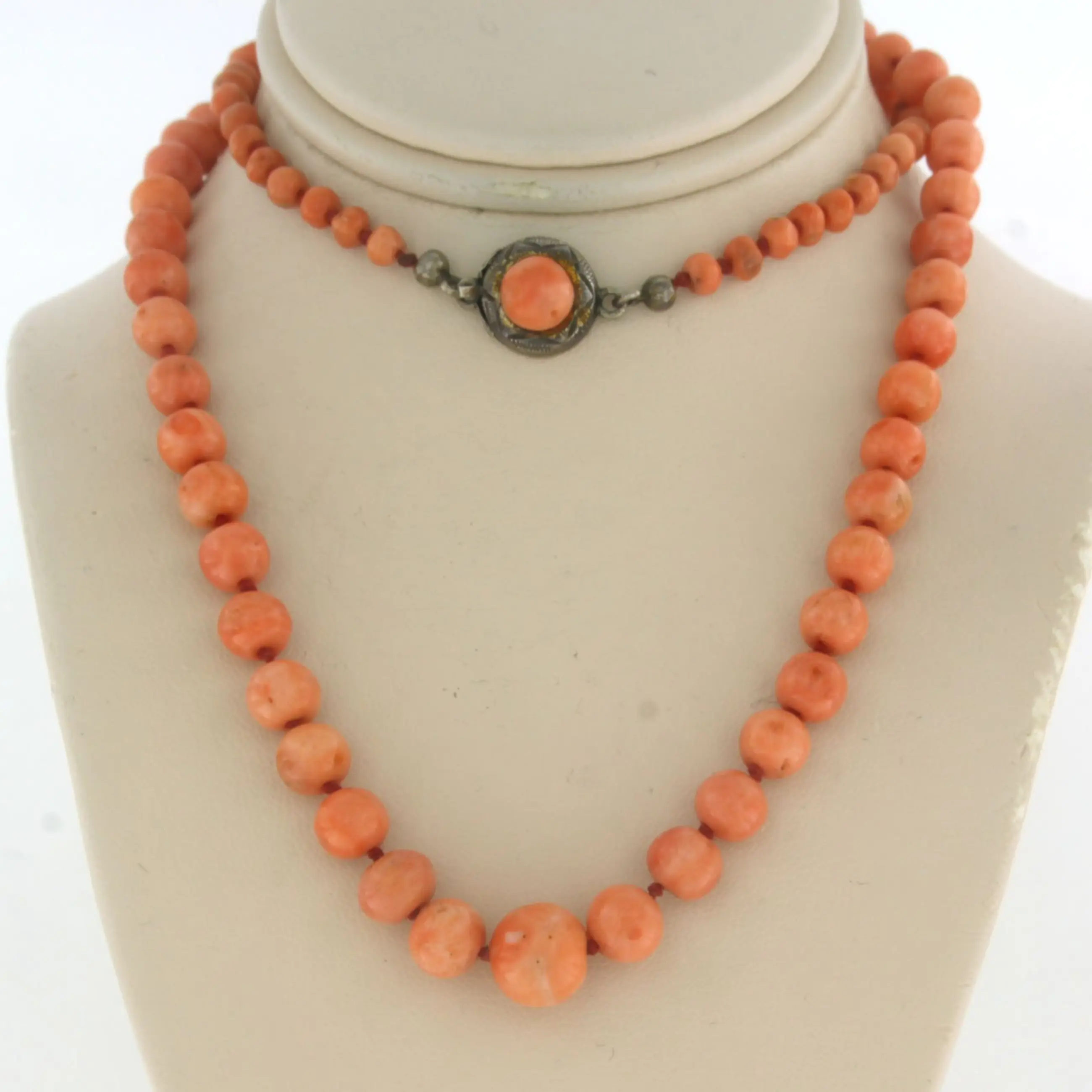 Zilveren slot aan een koraal kralen collier - 50 cm lang