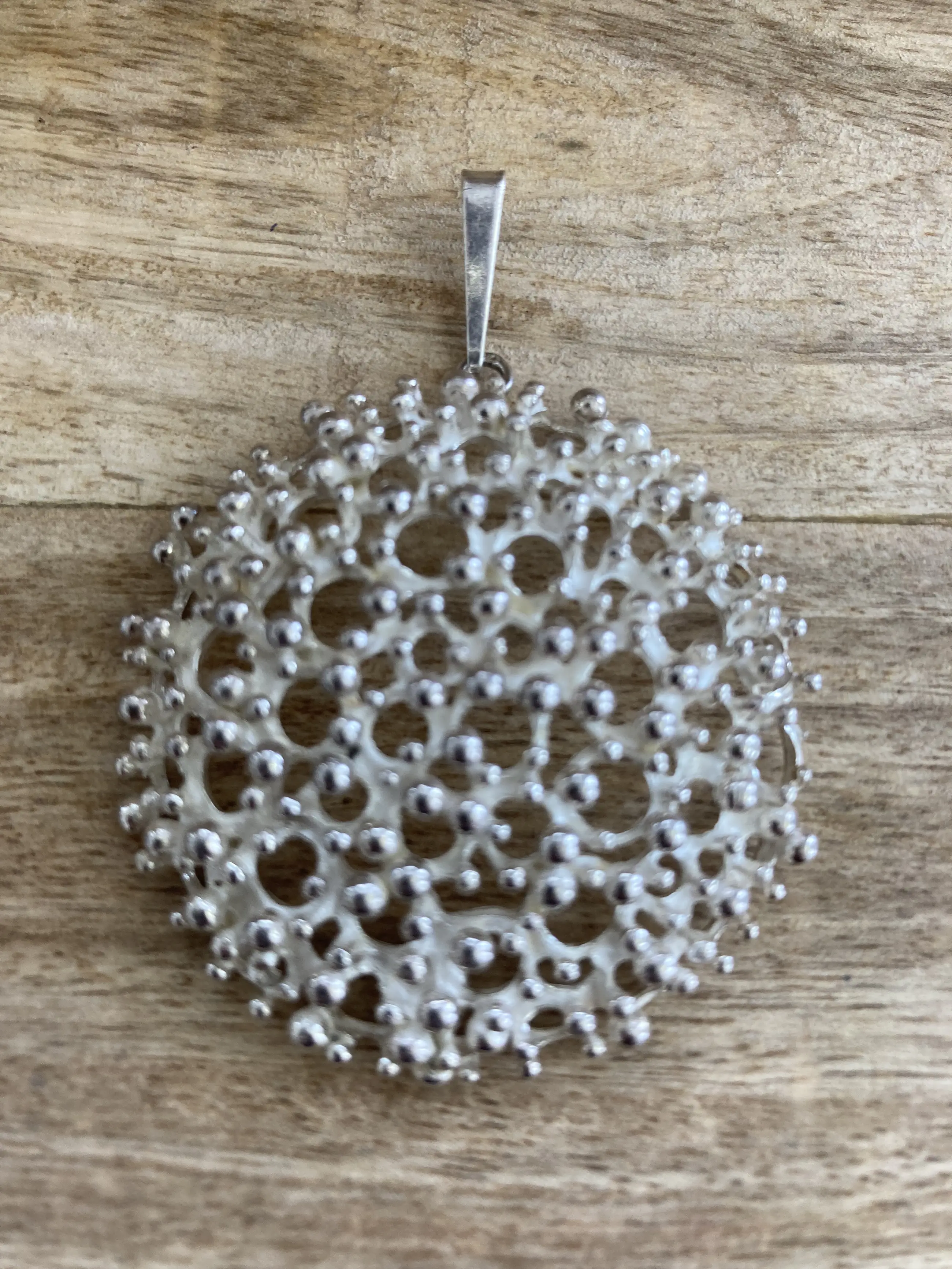 Zilveren opengewerkte hanger met kleine sparkly bolletjes.