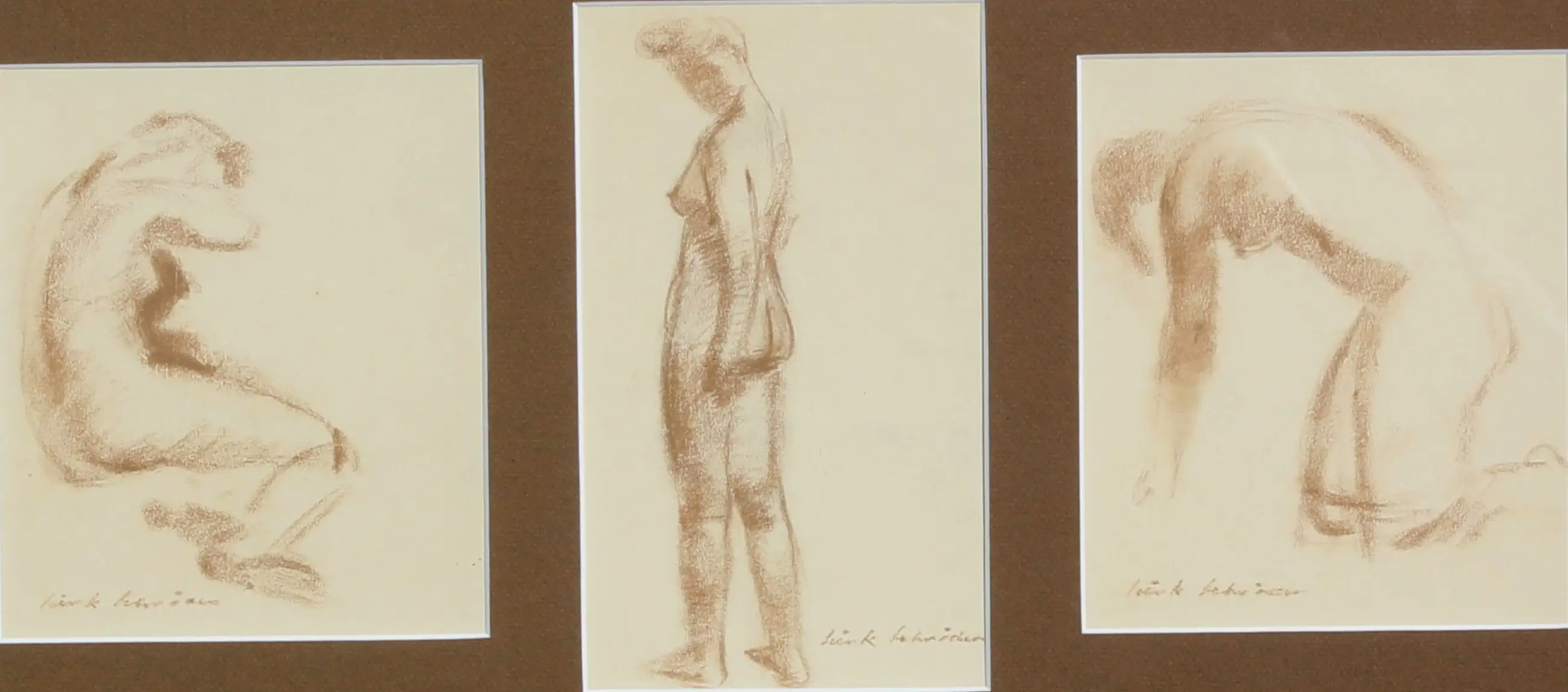 Twee krijttekeningen van Sierk Schröder. 'Naaktstudies'. Afmetingen lijst: H41 x b51cm. Afmetingen voorstellingen totaal: H17 x b33cm. De werken zijn, rechts onderaan, gesigneerd door de kunstenaar. De authenticiteit van het aangeboden werk wordt volledig gegarandeerd. Een certificaat van echtheid kan, op aanvraag, worden gemaild.