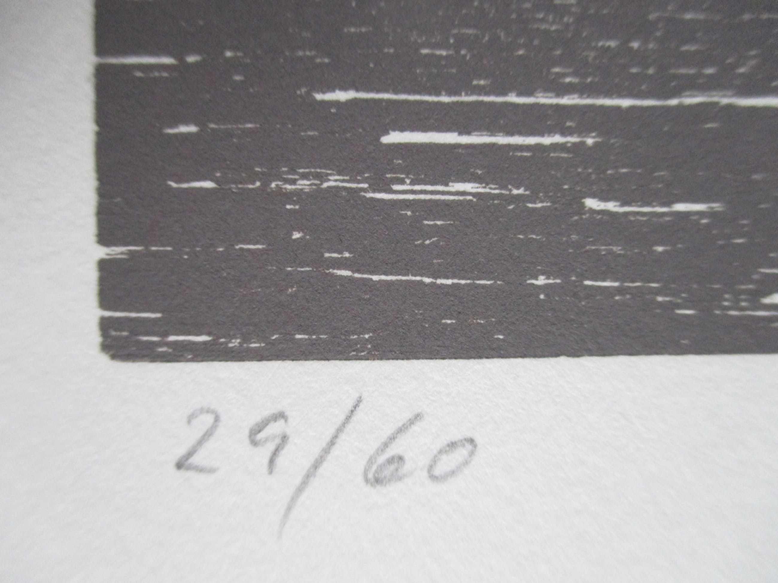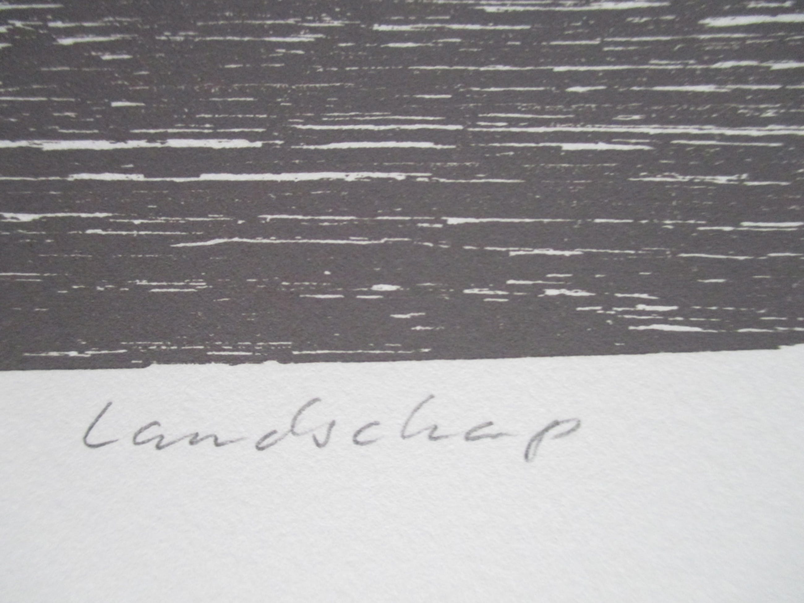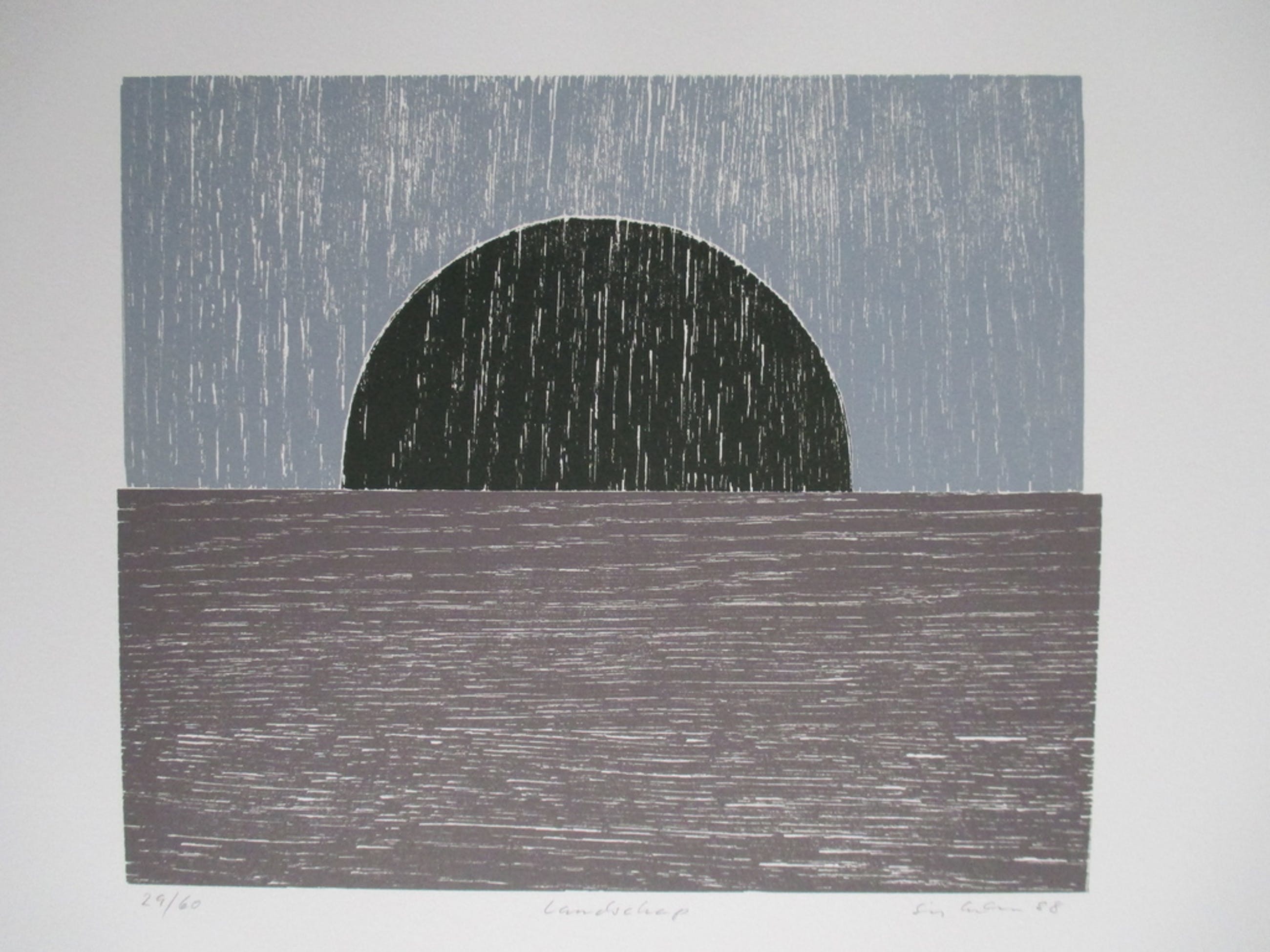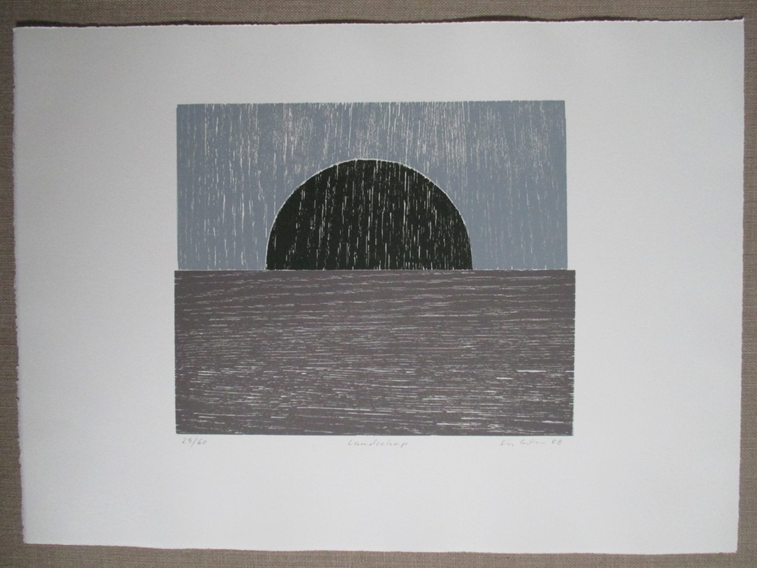Drie-kleuren houtsnede van Sigurdur Gudmundsson getiteld "Landschap" uit 1988. Gedateerd, genummerd 29/60 en gesigneerd in potlood. Gedrukt op 250 grams BFK Rives papier. In perfecte staat, nooit ingelijst geweest.