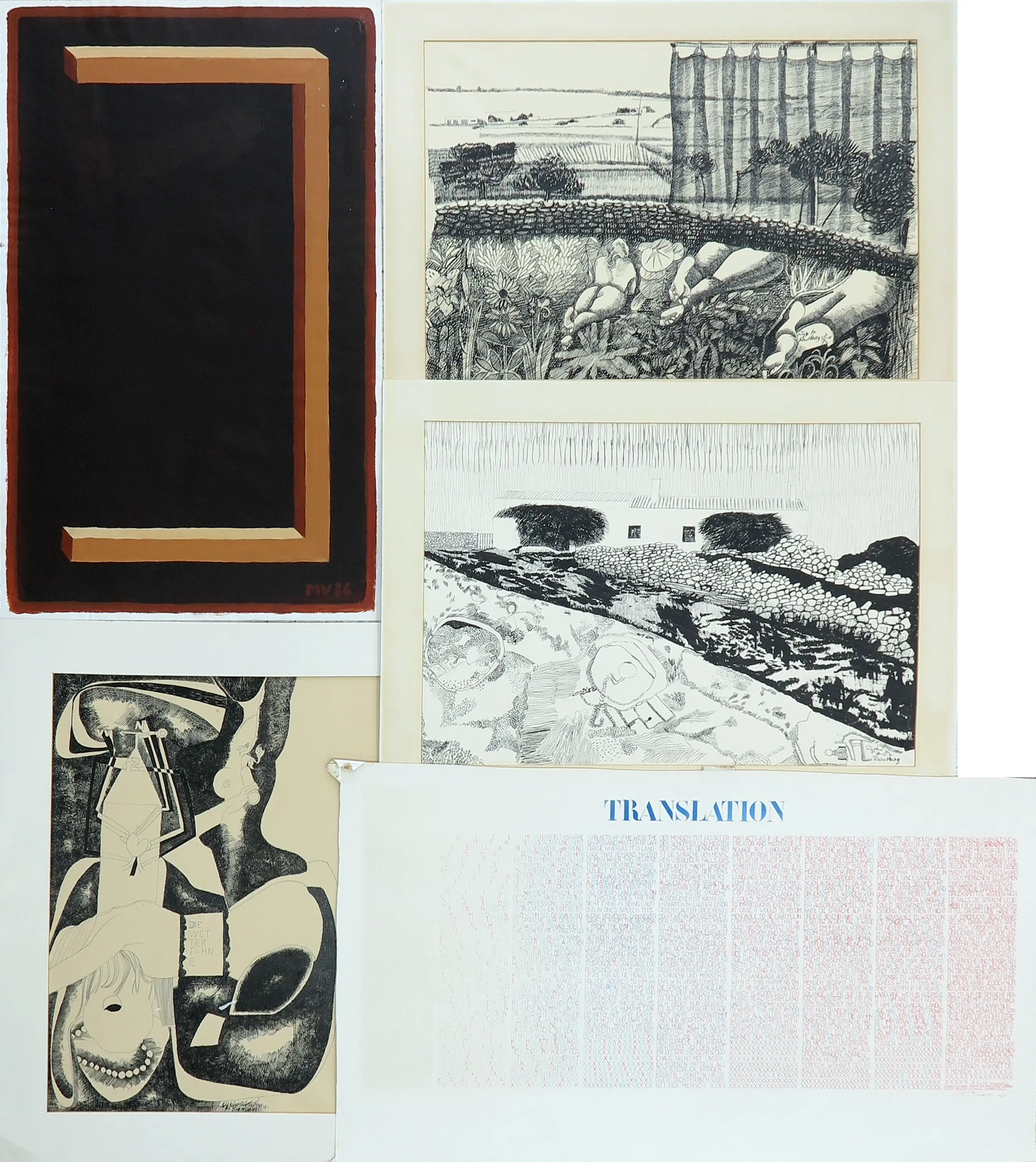 De pentekeningen hebben enkele kleine plekjes door papier dat aan de inkt is blijven plakken. De andere twee werken hebben ook wat kleine imperfecties. | |||||||||||