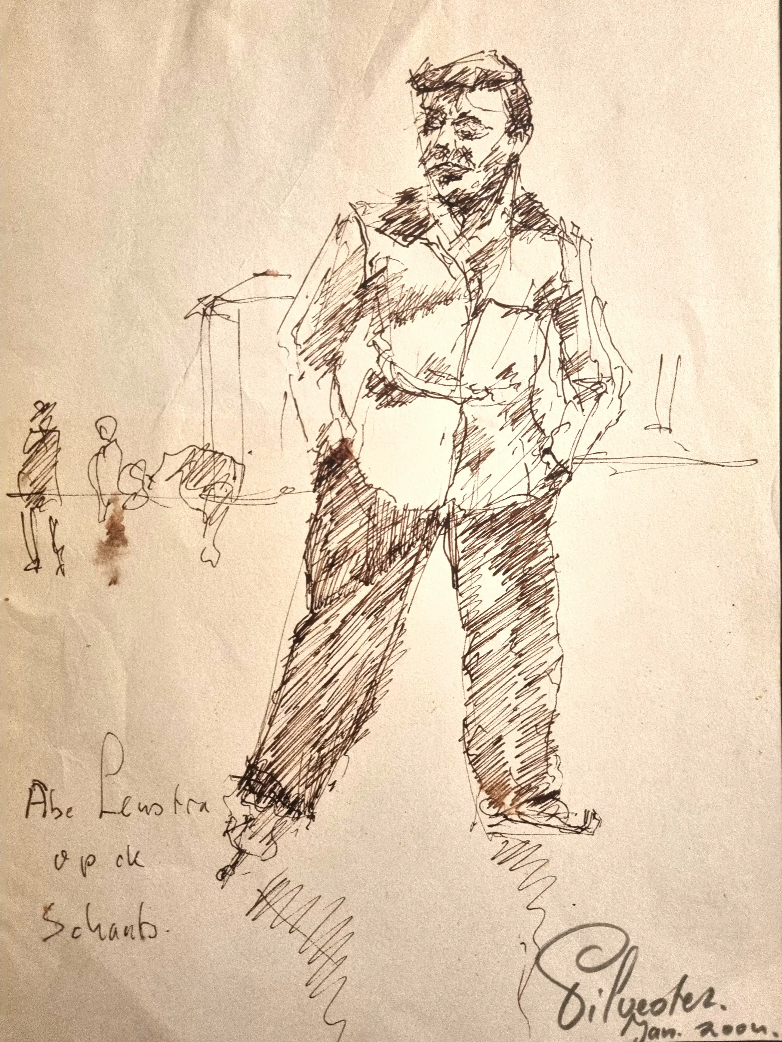Abe Lenstra was niet alleen een begenadigd voetballer, ook kon hij als Fries goed uit de voeten op de schaats. Op deze schets treffend neergezet door Silvester Peperkamp.