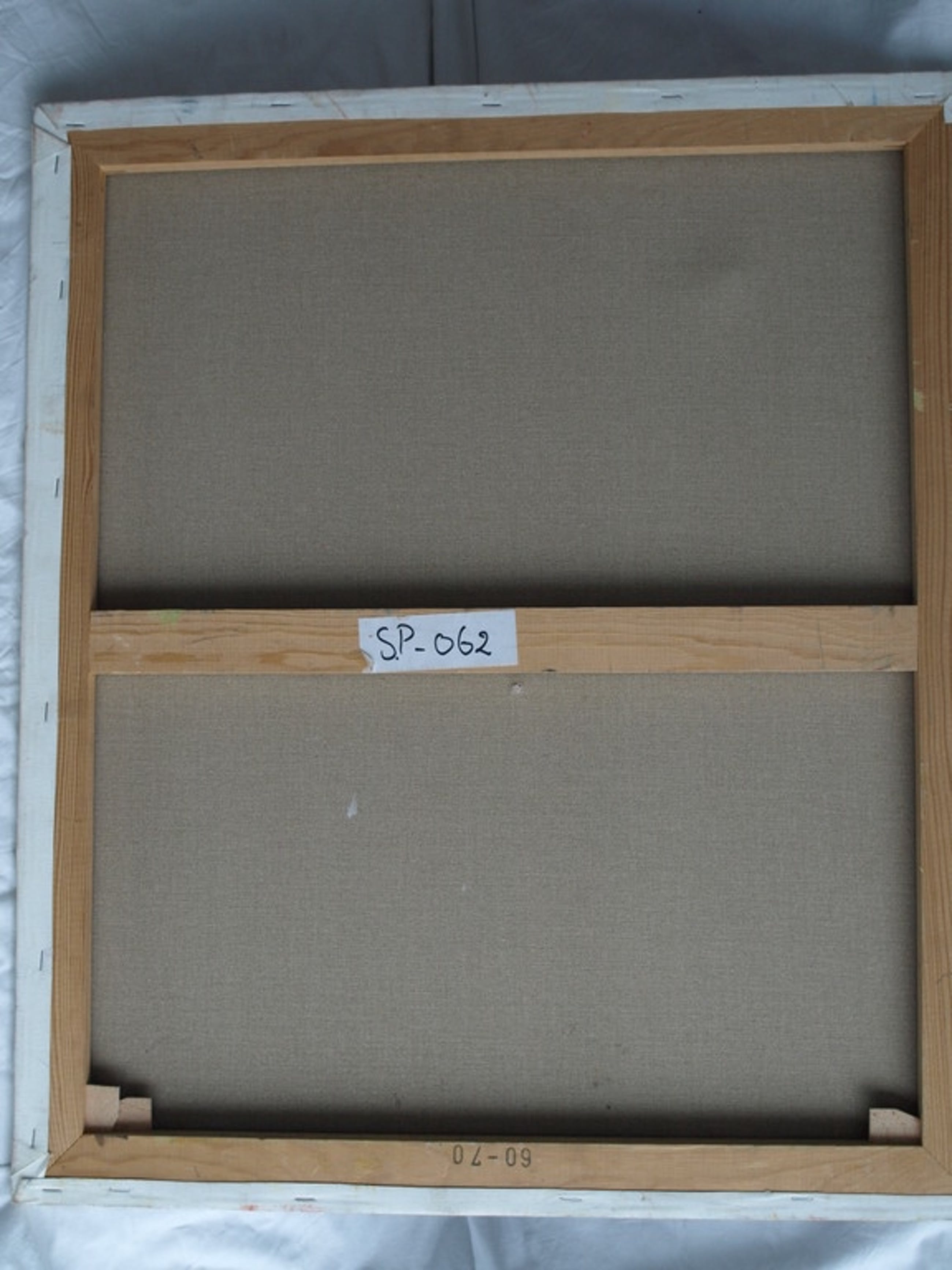 -Het werk is niet ingelijst. Het doek is bevestigd op een houten raam en kan ook zo aan de muur.