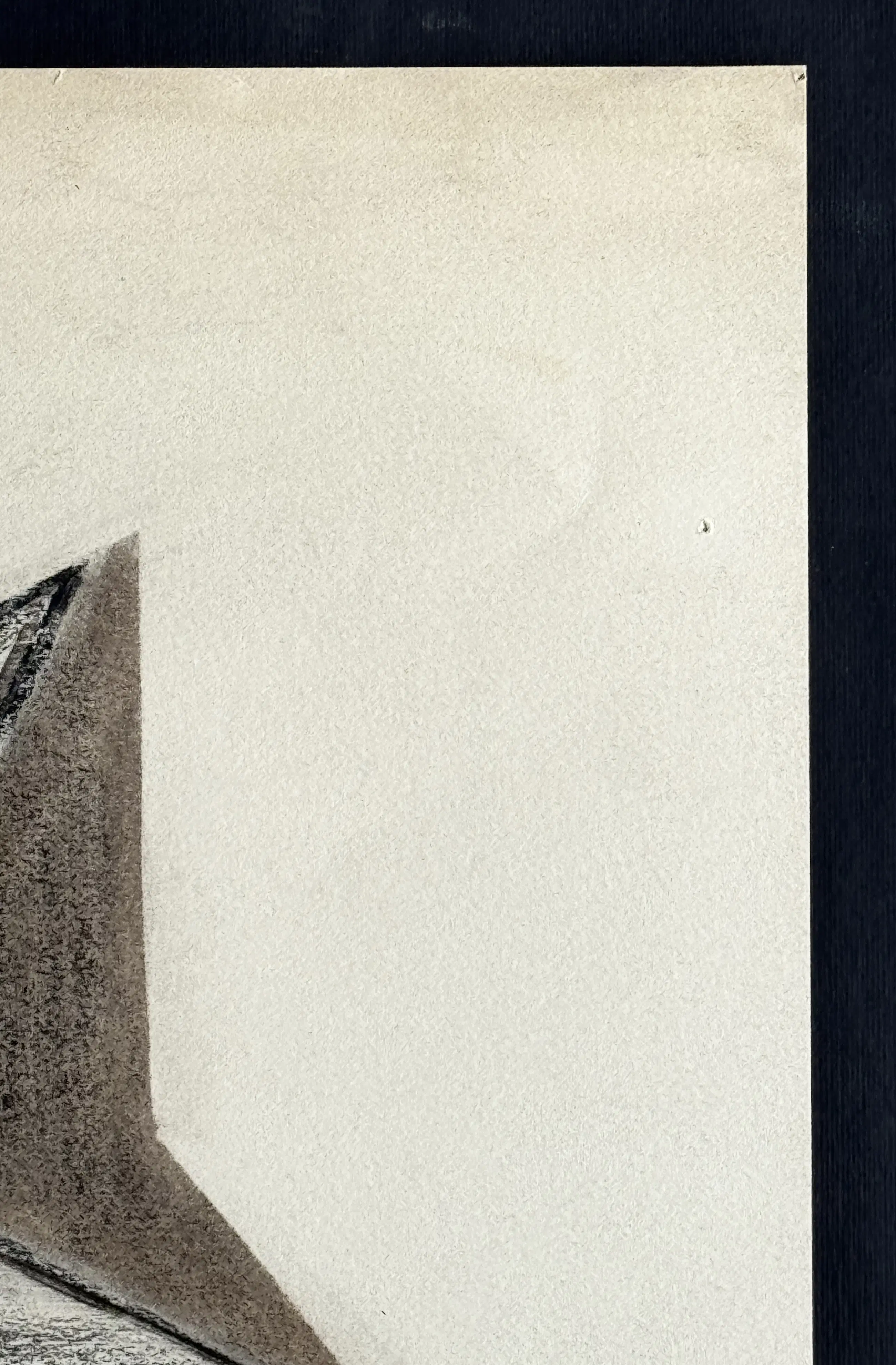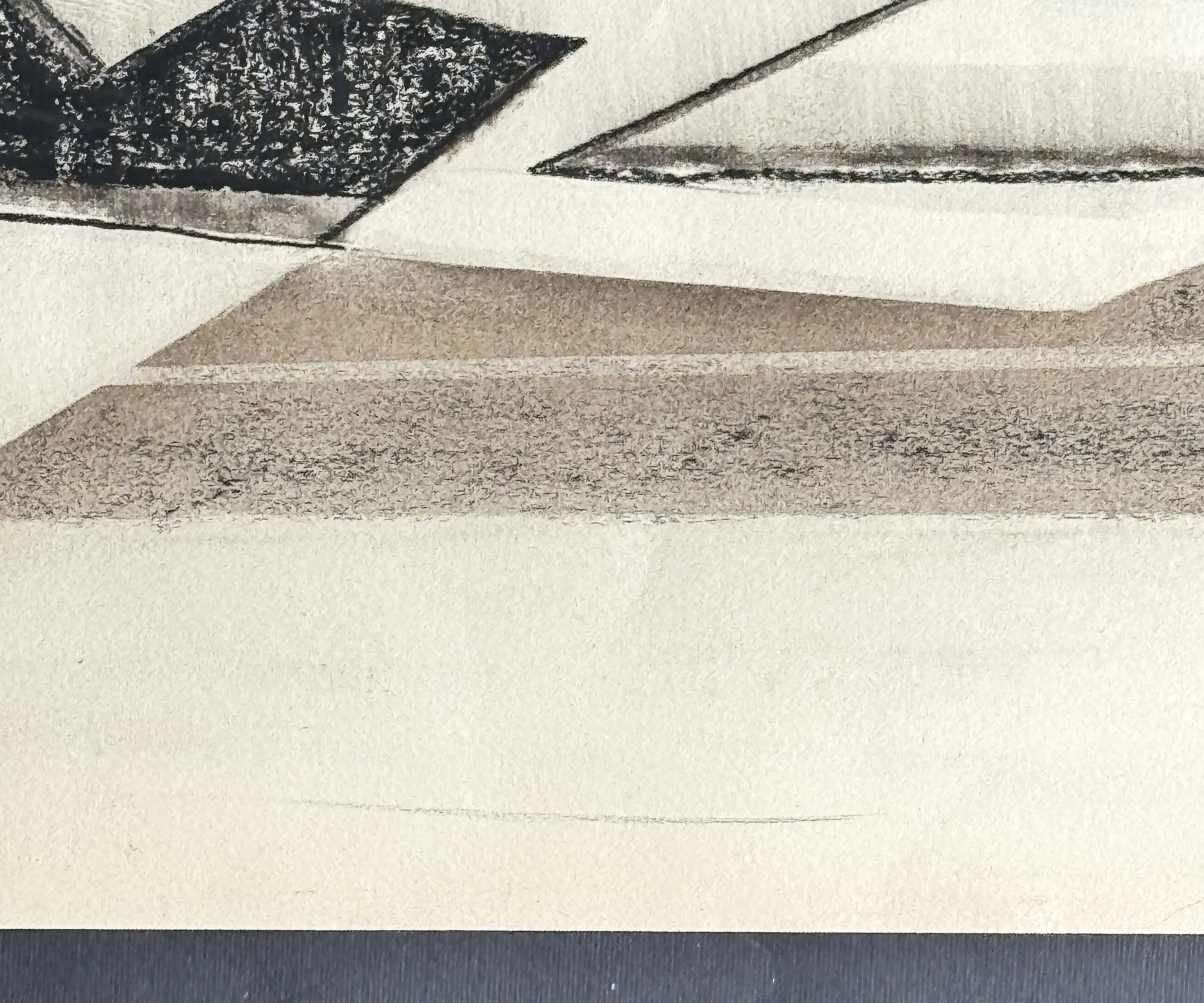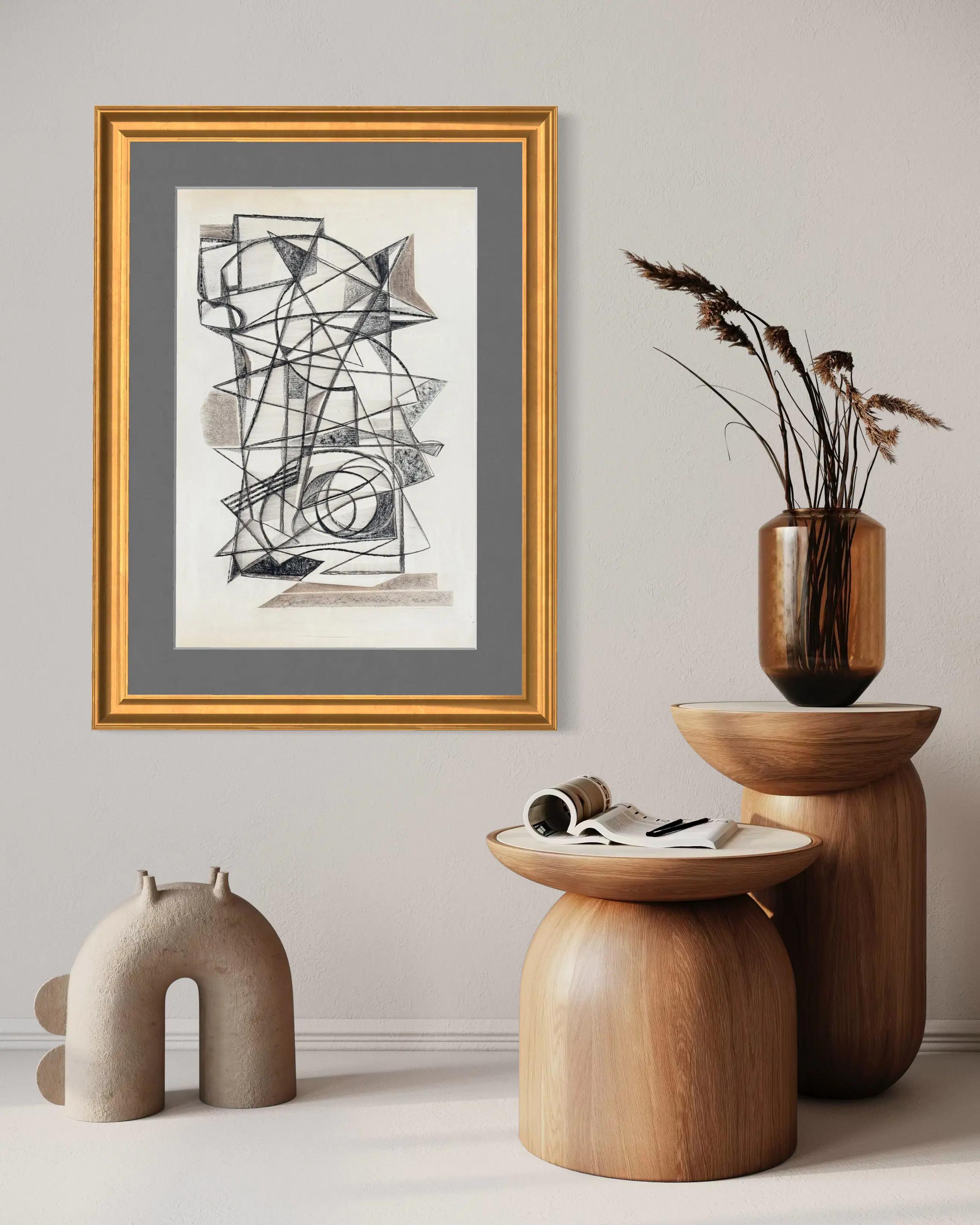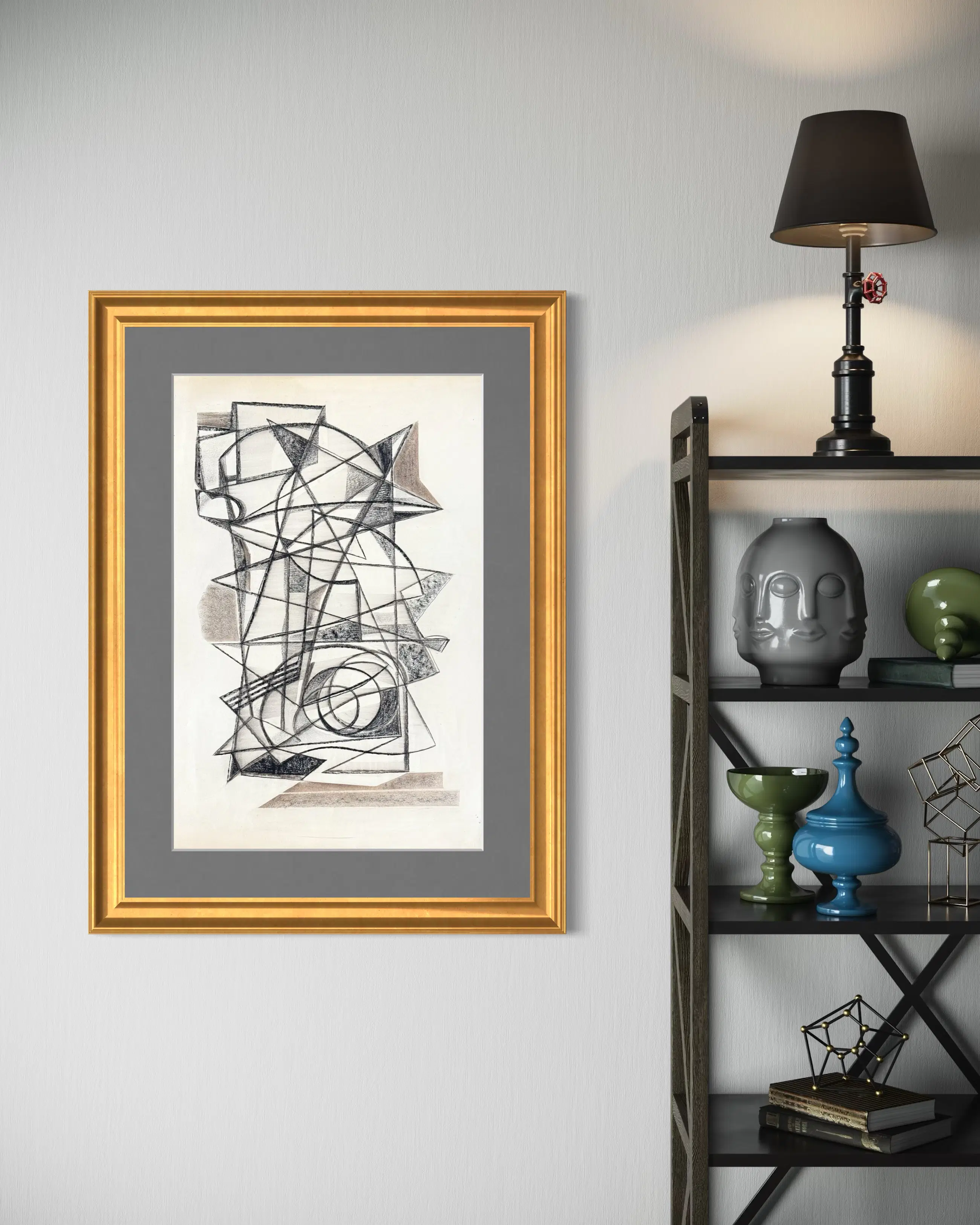 Dit werk op papier van Silvin Bronkart, gedateerd 1954, behoort tot de meest productieve periode van de kunstenaar. De tekening, gekenmerkt door zijn strakke geometrie, ontvouwt zich in een netwerk van elkaar kruisende lijnen en gestructureerde volumes, waar de spanning tussen evenwicht en beweging de meesterlijke hand van de kunstenaar onthult. De nuances van grijs en bruin, bereikt door het samenspel van potlood en grafiet, geven de compositie een subtiele diepte en een innerlijke levendigheid die kenmerkend zijn voor Bronkart's artistieke taal.