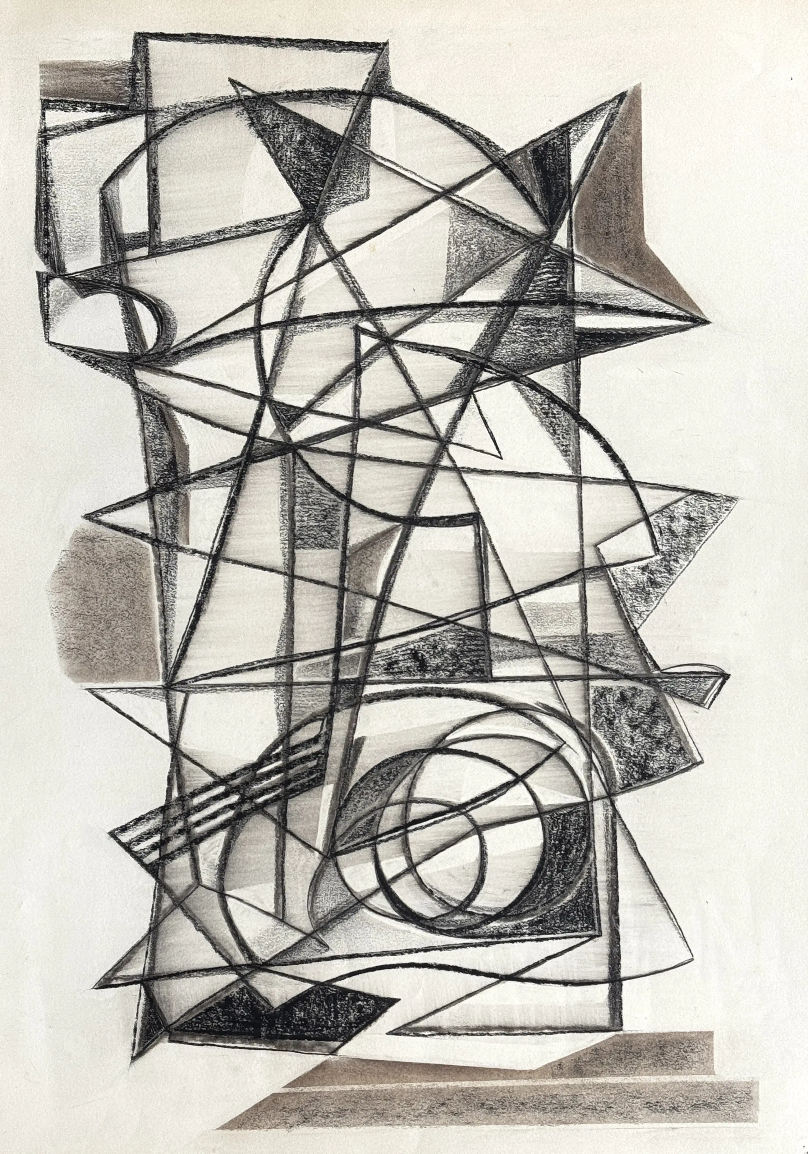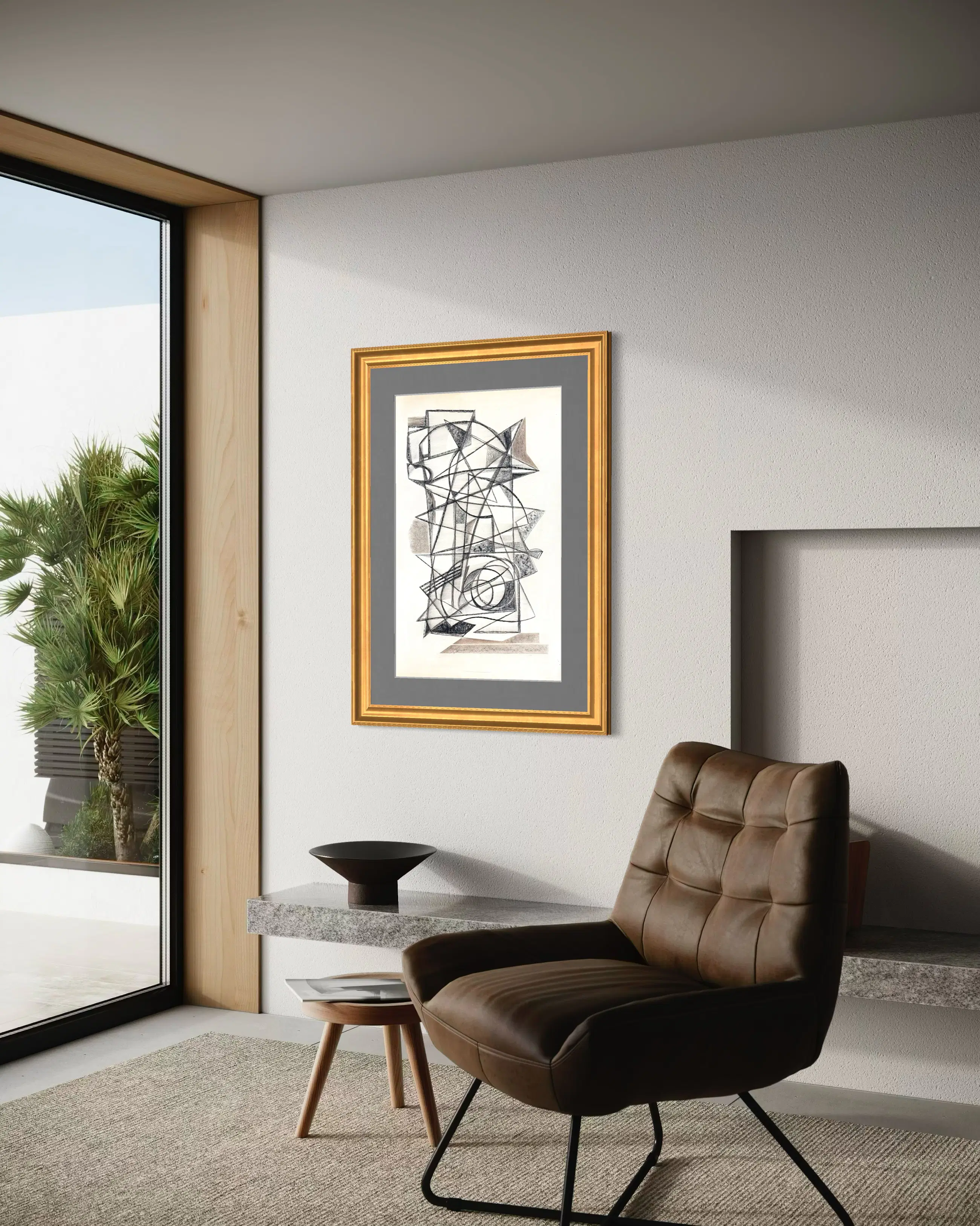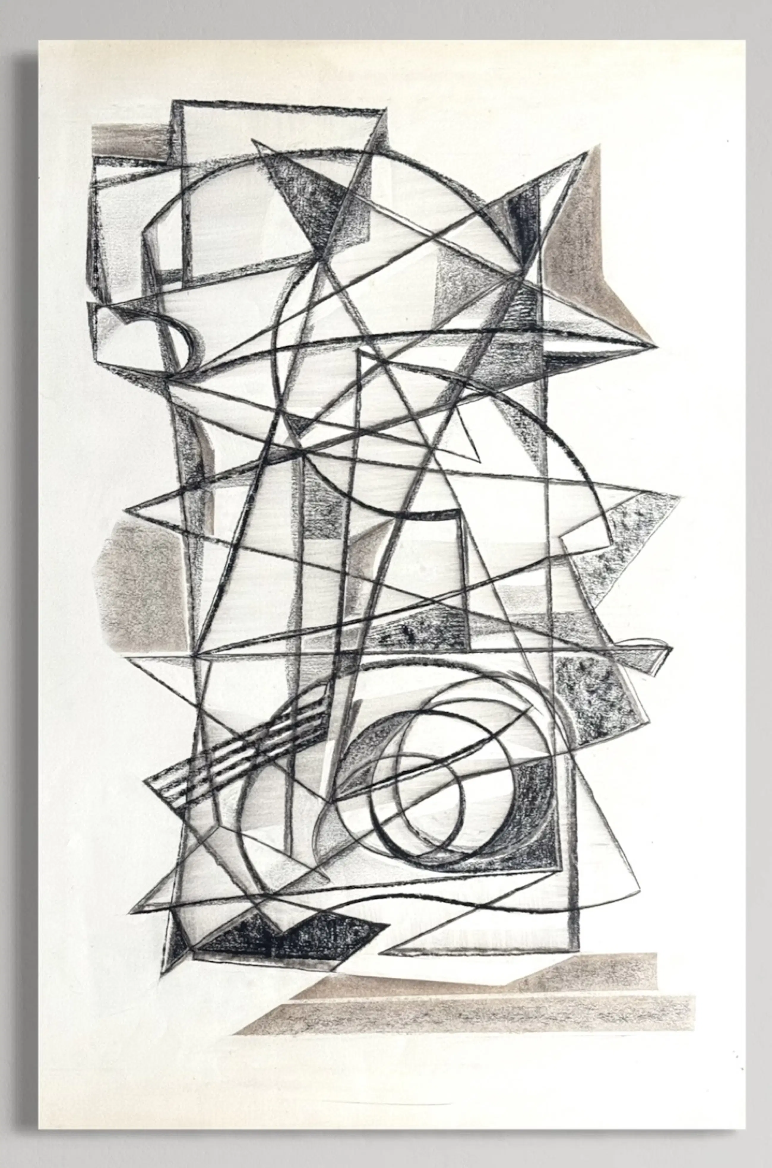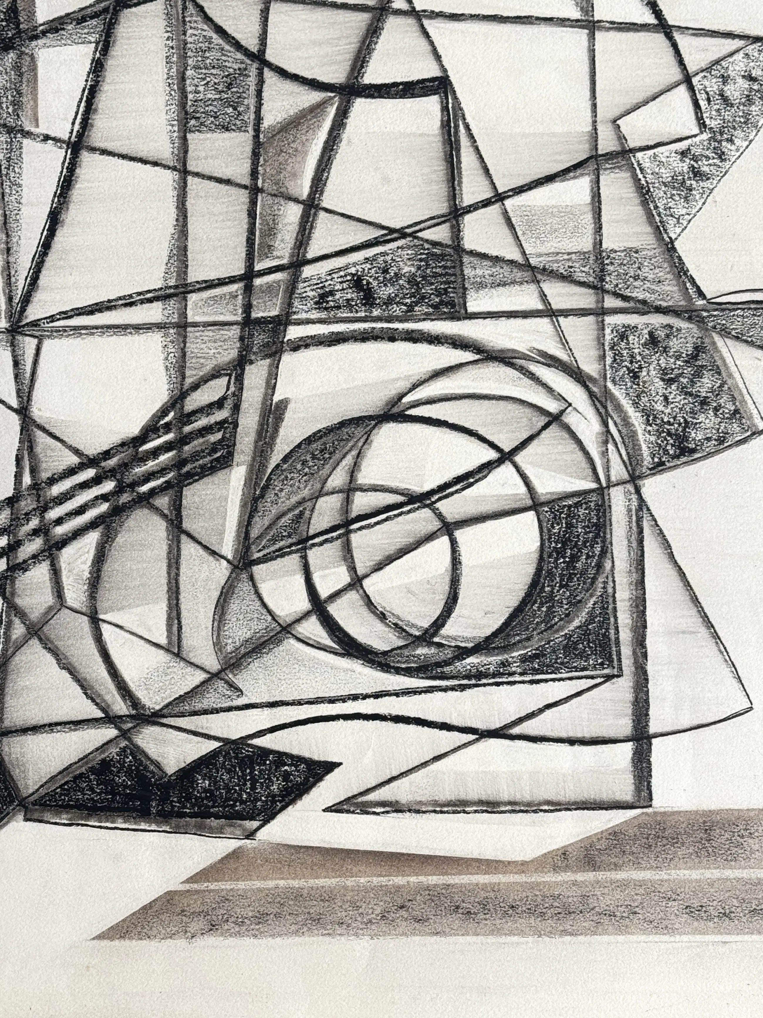 Dit werk op papier van Silvin Bronkart, gedateerd 1954, behoort tot de meest productieve periode van de kunstenaar. De tekening, gekenmerkt door zijn strakke geometrie, ontvouwt zich in een netwerk van elkaar kruisende lijnen en gestructureerde volumes, waar de spanning tussen evenwicht en beweging de meesterlijke hand van de kunstenaar onthult. De nuances van grijs en bruin, bereikt door het samenspel van potlood en grafiet, geven de compositie een subtiele diepte en een innerlijke levendigheid die kenmerkend zijn voor Bronkart's artistieke taal.