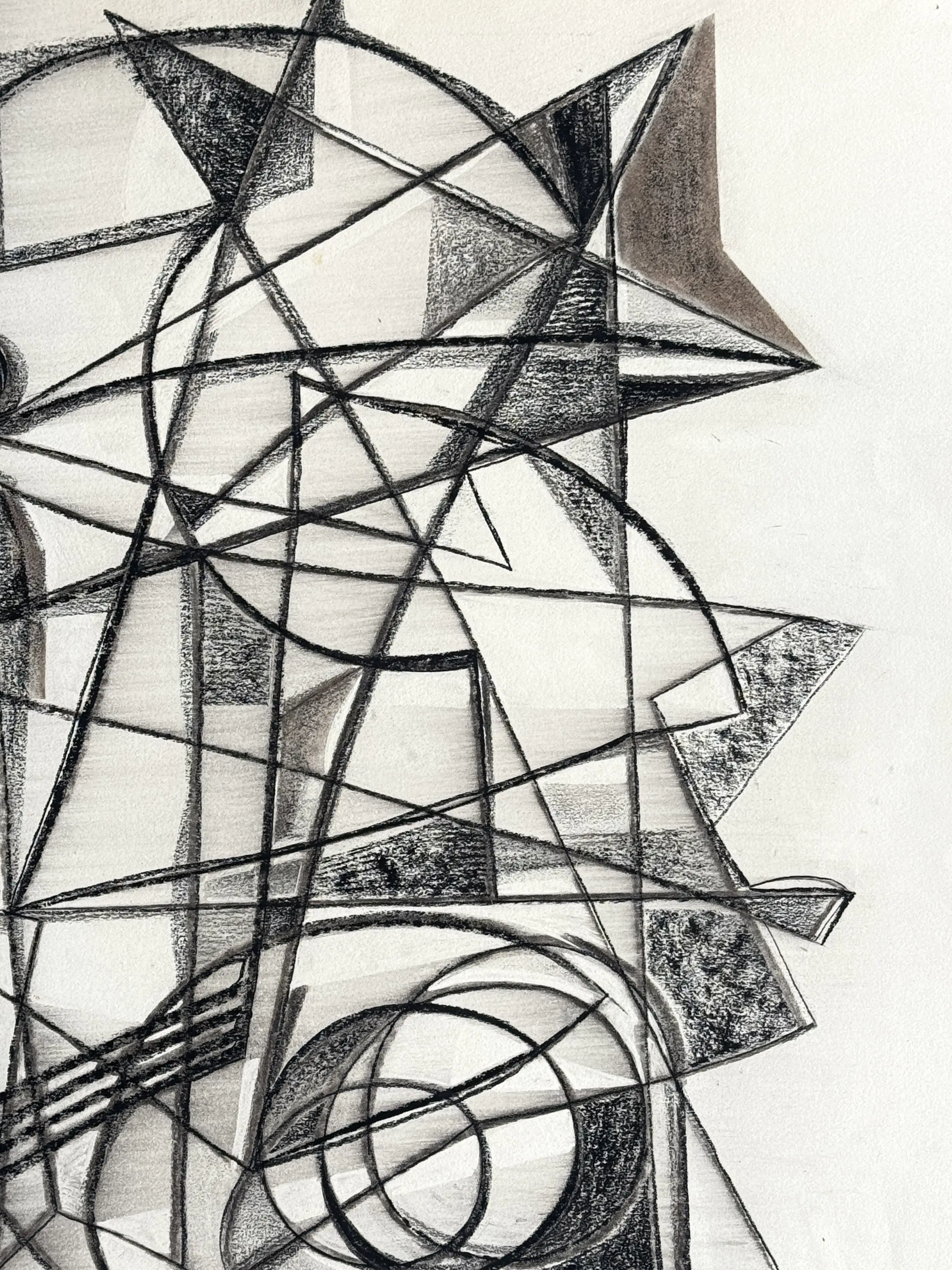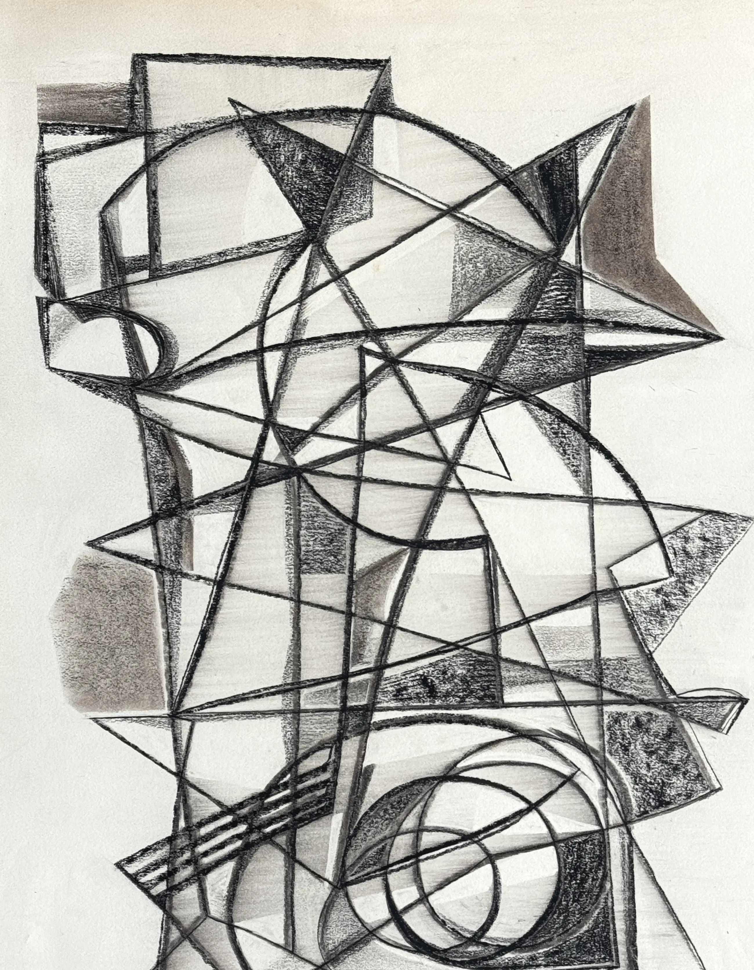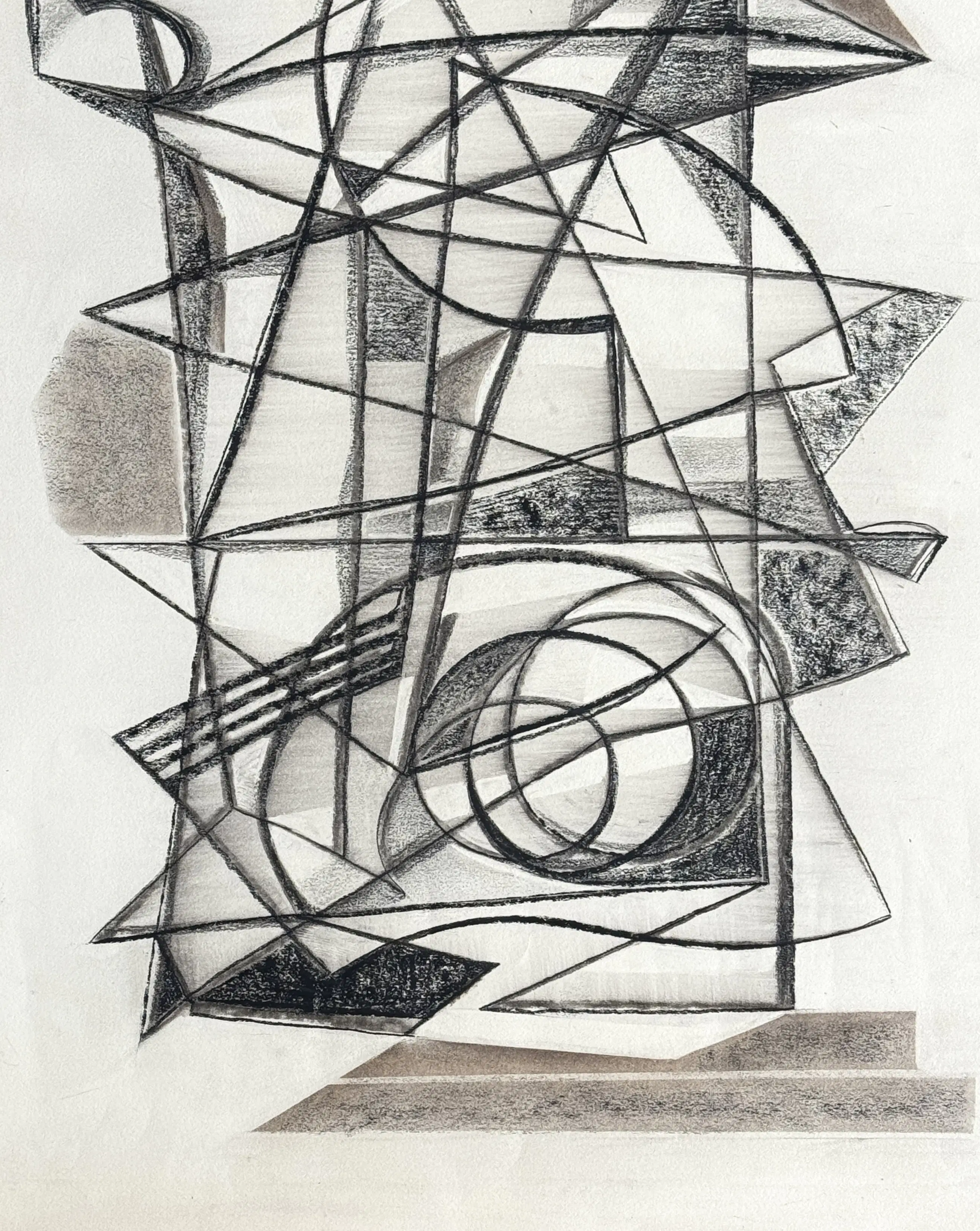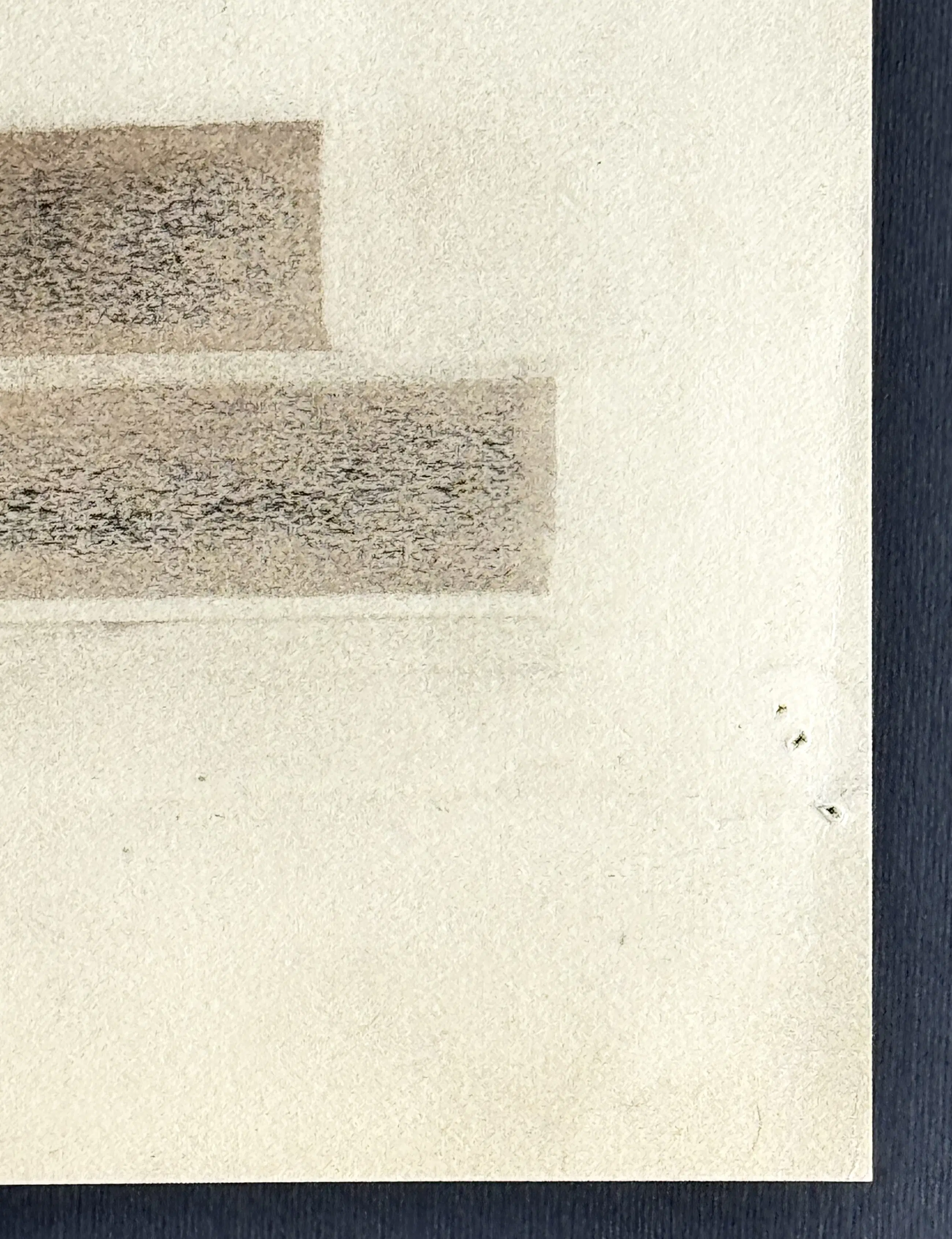 Dit werk op papier van Silvin Bronkart, gedateerd 1954, behoort tot de meest productieve periode van de kunstenaar. De tekening, gekenmerkt door zijn strakke geometrie, ontvouwt zich in een netwerk van elkaar kruisende lijnen en gestructureerde volumes, waar de spanning tussen evenwicht en beweging de meesterlijke hand van de kunstenaar onthult. De nuances van grijs en bruin, bereikt door het samenspel van potlood en grafiet, geven de compositie een subtiele diepte en een innerlijke levendigheid die kenmerkend zijn voor Bronkart's artistieke taal.