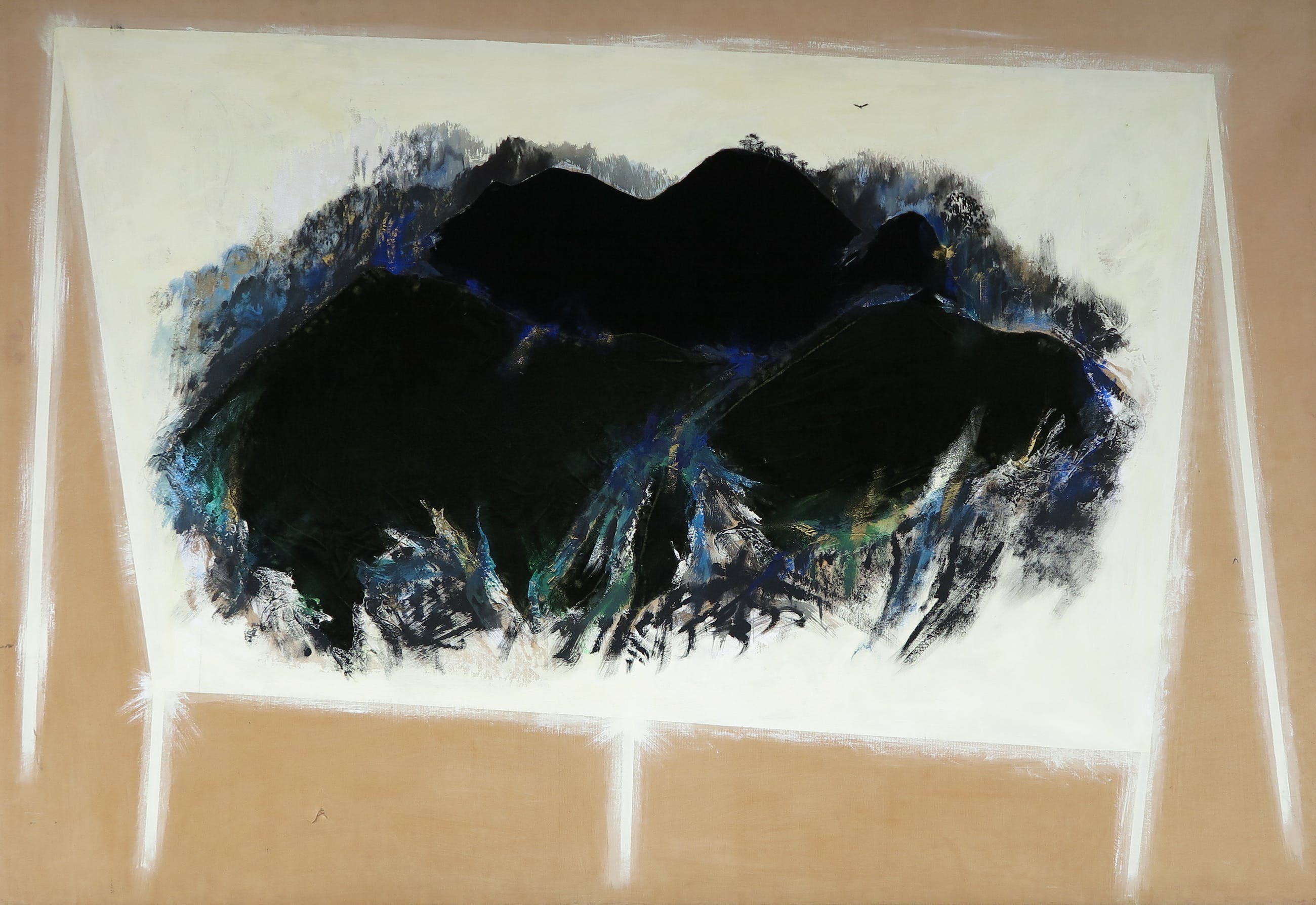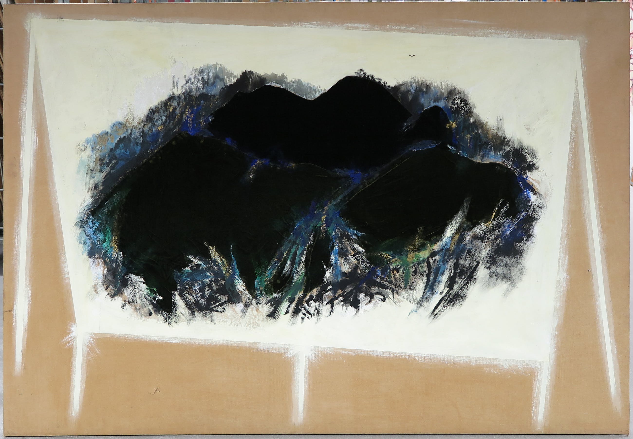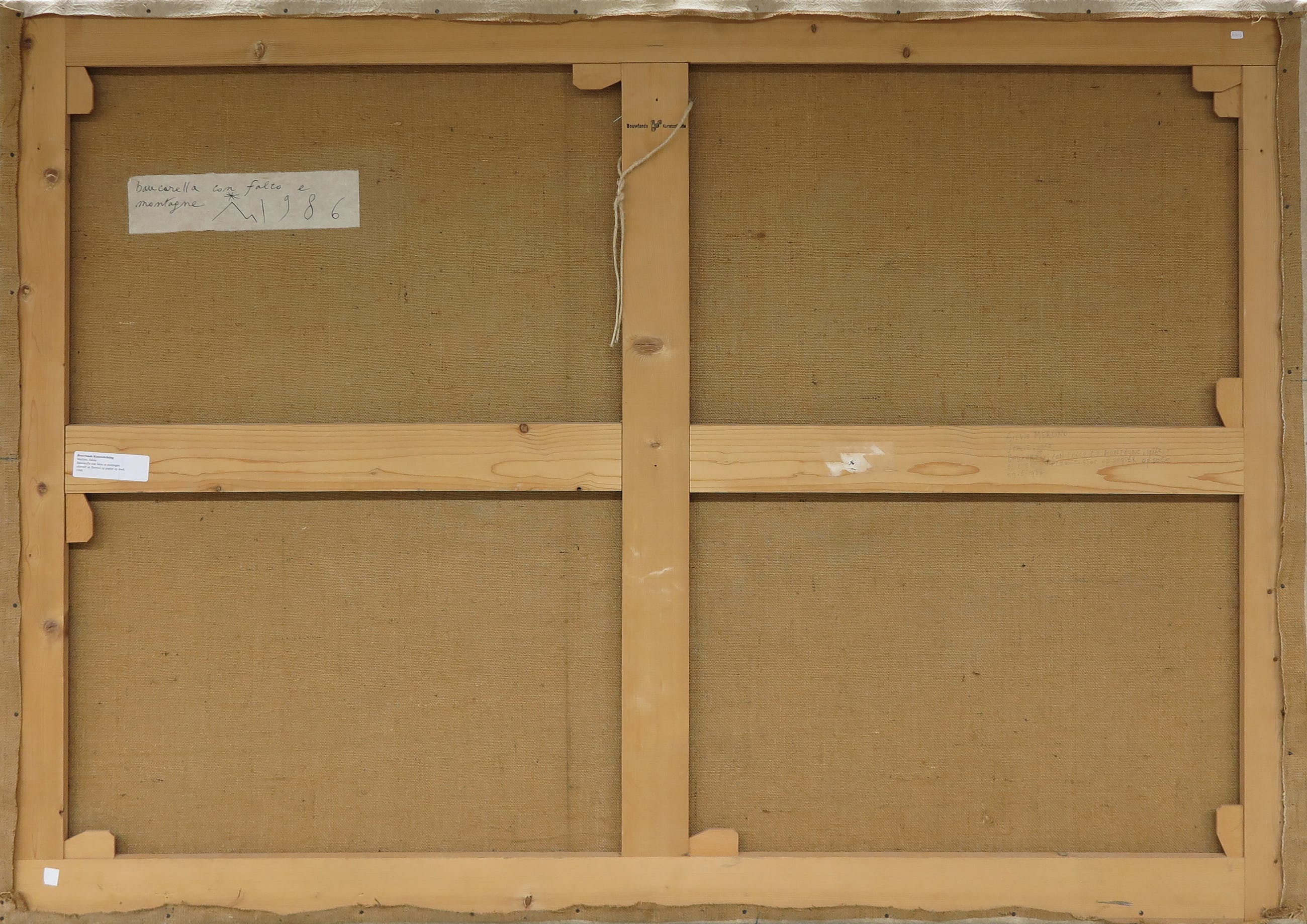 Zeer groot werk van de Italiaanse kunstenaar Silvio Merlino, uitgevoerd in gemengde techniek (o.a. fluweel, olieverf en kraftpapier op jute).