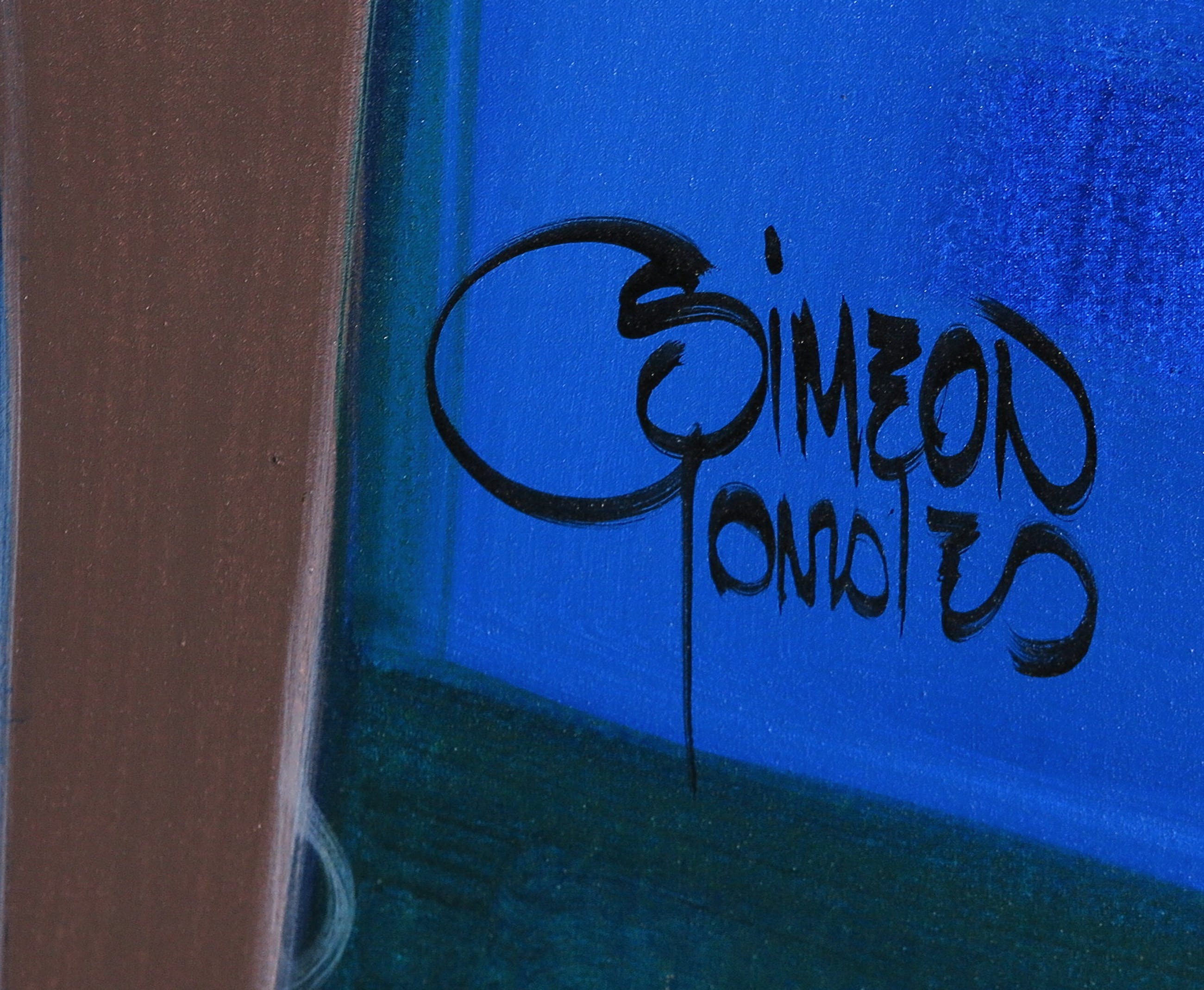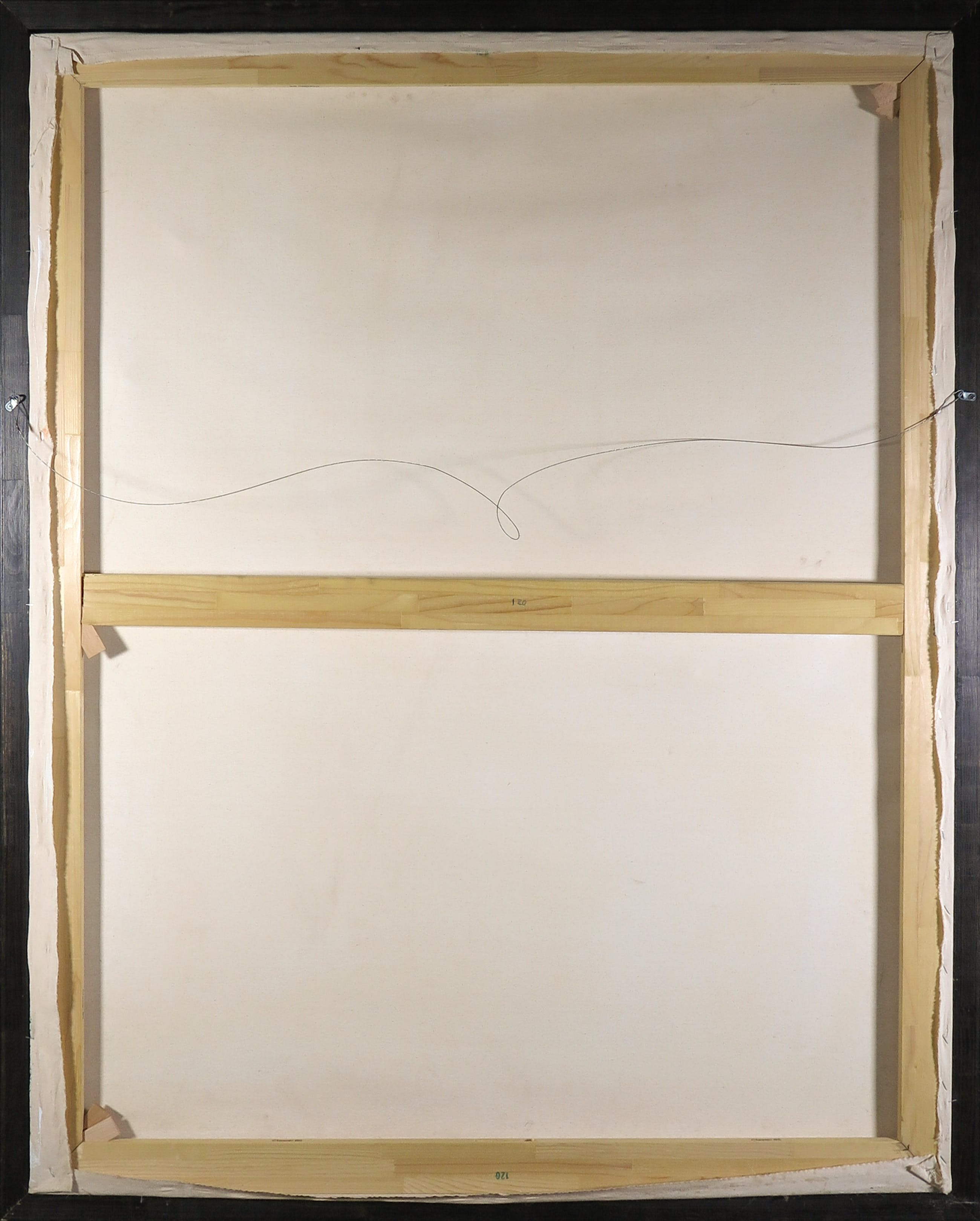 | Het doek heeft een lichte kras in het groene vlak tussen de 'benen' en het doek is hier en daar een beetje ingedeukt, waaronder langs de bovenste rand. Het doek moet opnieuw gespannen worden, het hangt een beetje losjes. Licht oppervlaktevuil. | |