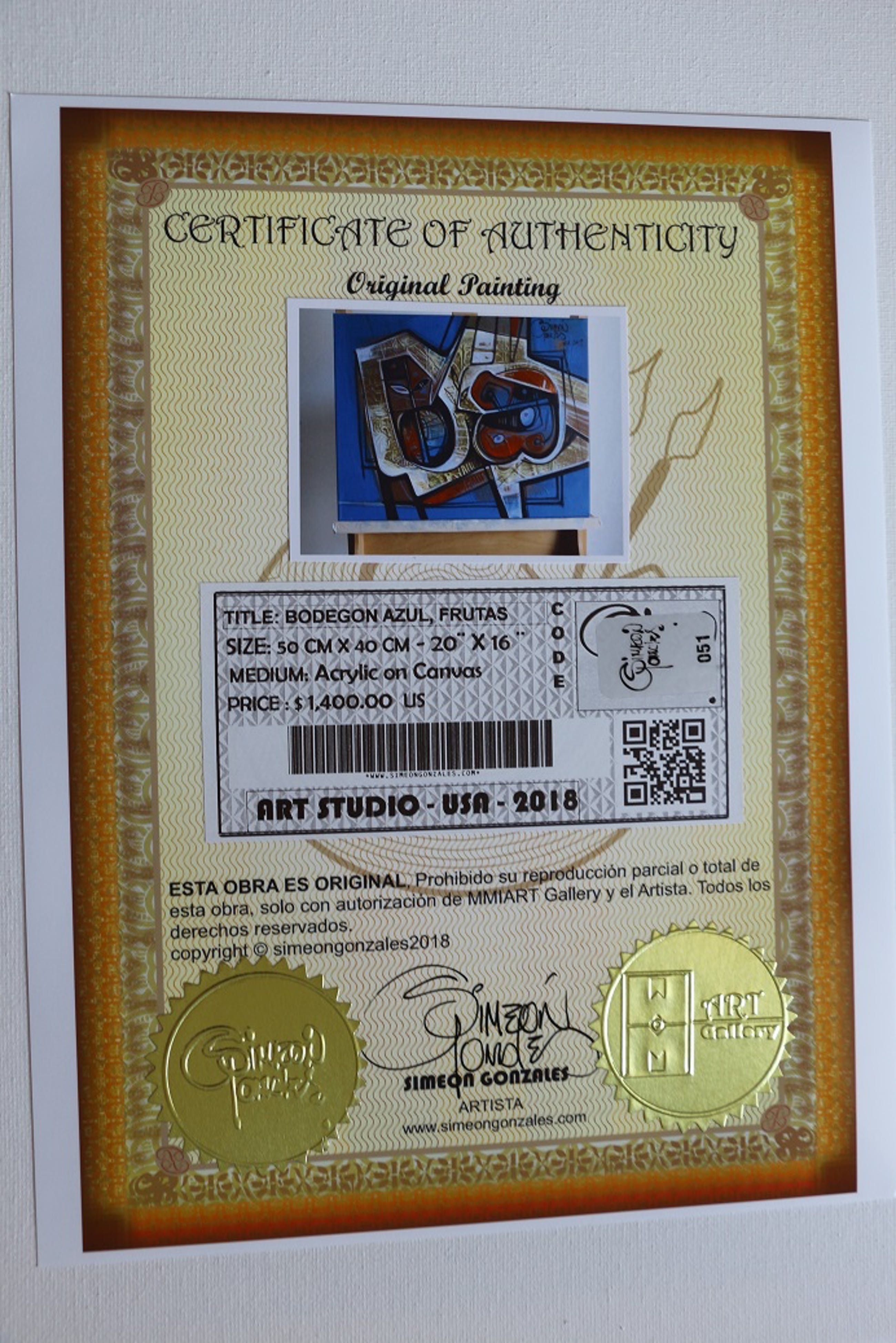 Dit prachtige werk genaamd" Bodegon Azul Frutas " is een Acrylschilderij vervaardigd door Simeon Gonzales in het voorjaar van 2018 in zijn atelier in Miami USA , afmeting 50 cm x 40 cm , het is gespannen op een spielatten frame .Gesigneerd aan de voorzijde + certificaat van echtheid 2018 .