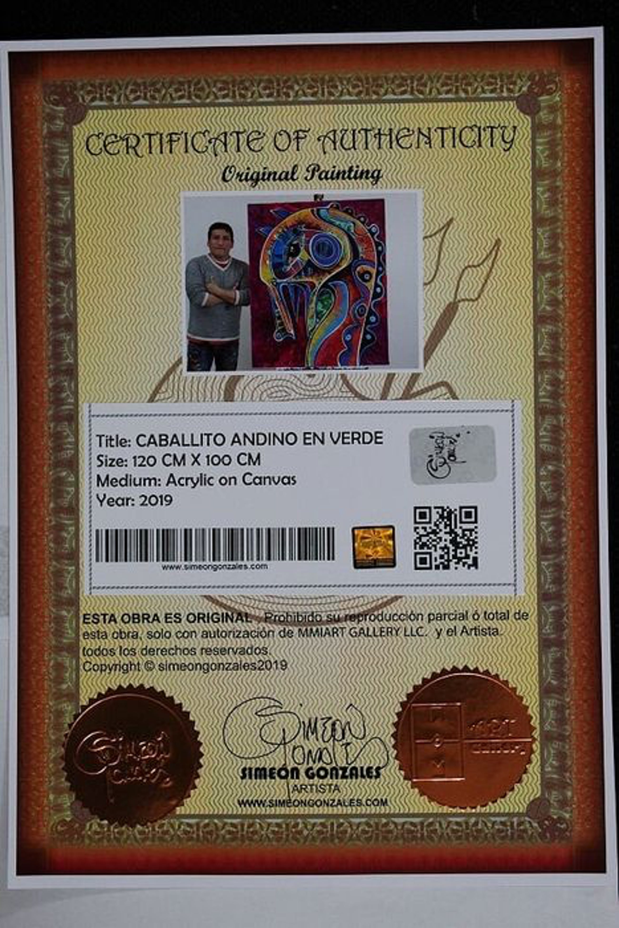 ” Cabalito Andino en Verde ” Acrylschilderij van Simeon Gonzales (Peru) 120 cm x 115 cm , gesigneerd aan de voorzijde + certificaat van echtheid 2019, met 2 stickers en code.Het schilderij zal opgerold worden verzonden in een veilige tube, het kan ook op aanvraag opgespannen worden op een stevig houten spieraam .Uiteraard kan het eerst bezichtigd worden en ook afgehaald worden in Terneuzen, van harte welkom! Telefoon: 0115 620556 , 06-31957298 op afspraak op een dag en tijd die u het beste uitkomt.
