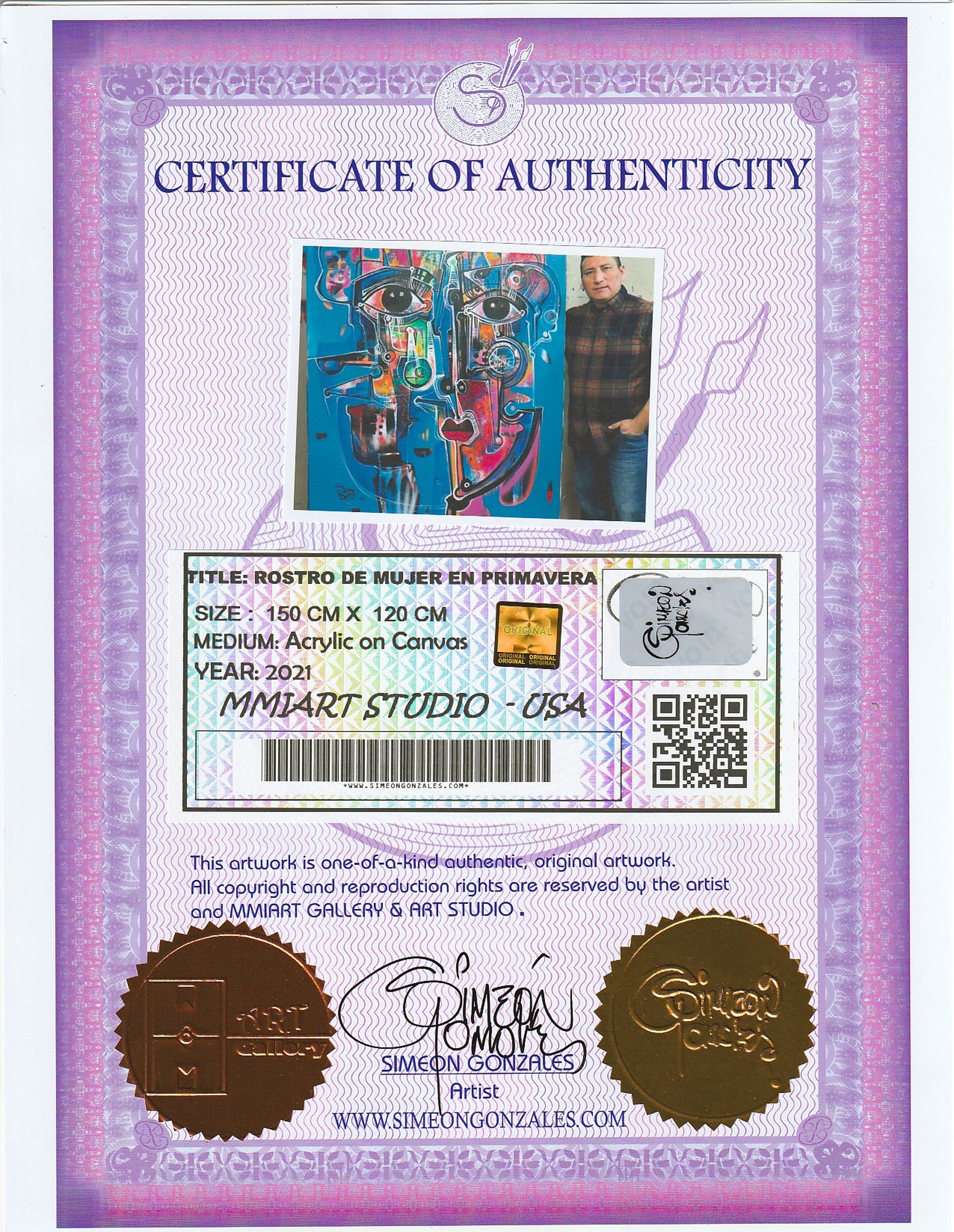 " Rostro de Mujer en Primavera " Acrylschilderij van Simeon Gonzales 150 cm x 120 cm , gesigneerd aan de voorzijde + certificaat van echtheid 2018, met 2 stickers en code. Het schilderij zal opgerold worden verzonden. het kan ook op aanvraag opgespannen worden op een stevig houten spieraam , uiteraard kan het altijd eerst bezichtigd worden in Terneuzen, van harte welkom!