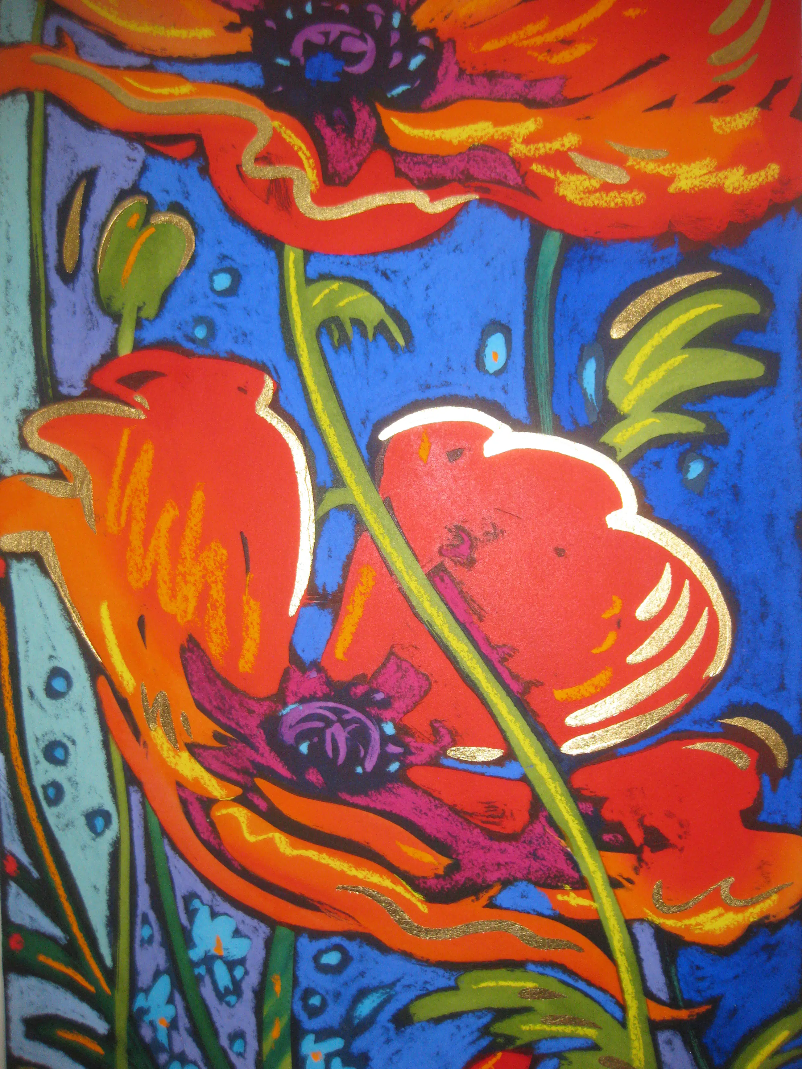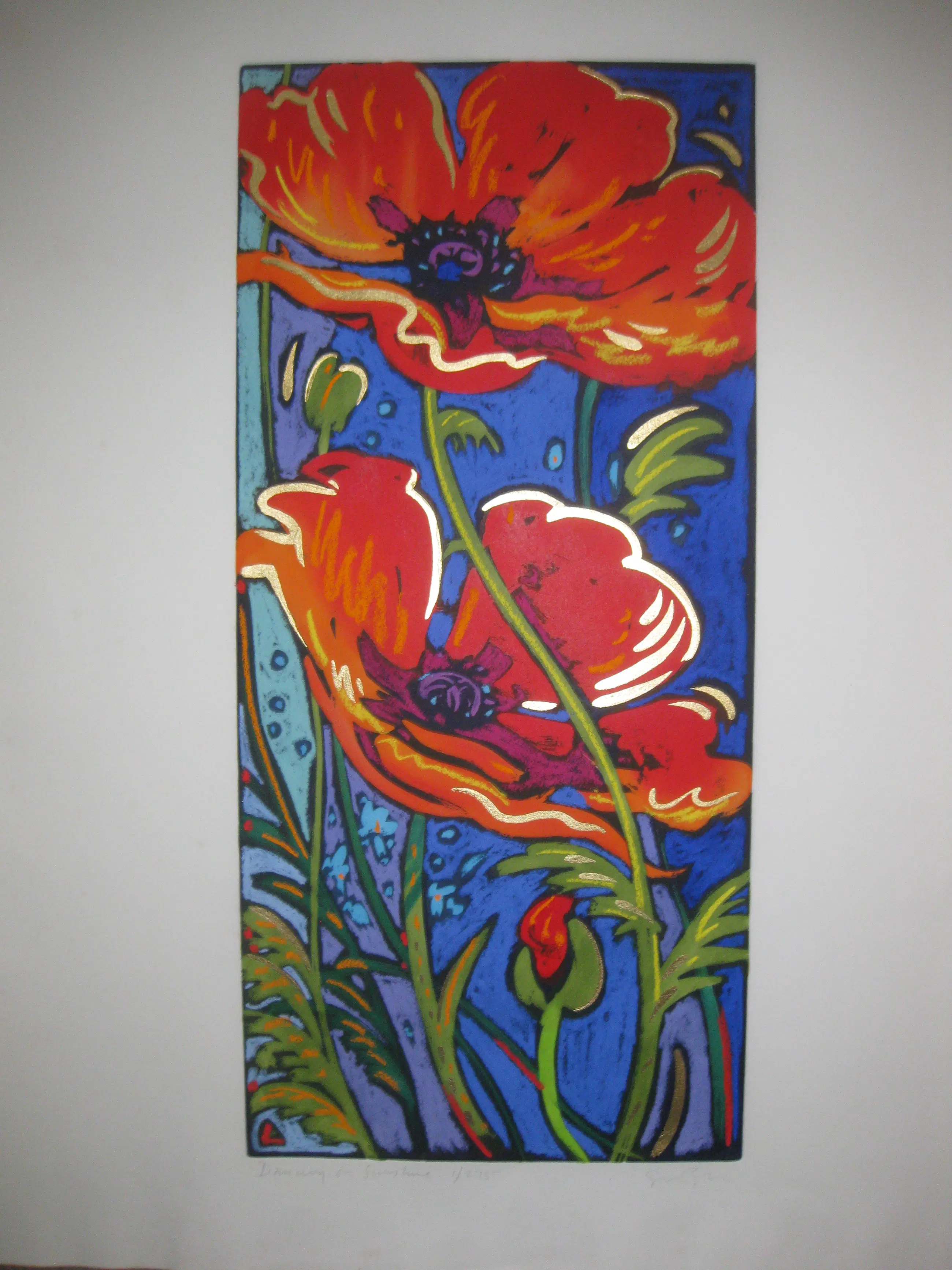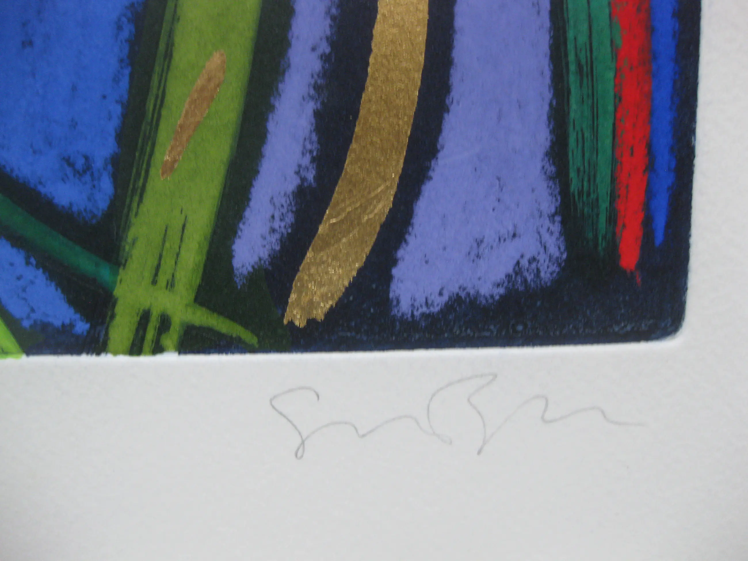 We hebben het hier over een bijzonder sprankelende ets/aquatint. De kleuren spatten van het papier af. Het gebruik van de kleur goud maakt het nog stralender.