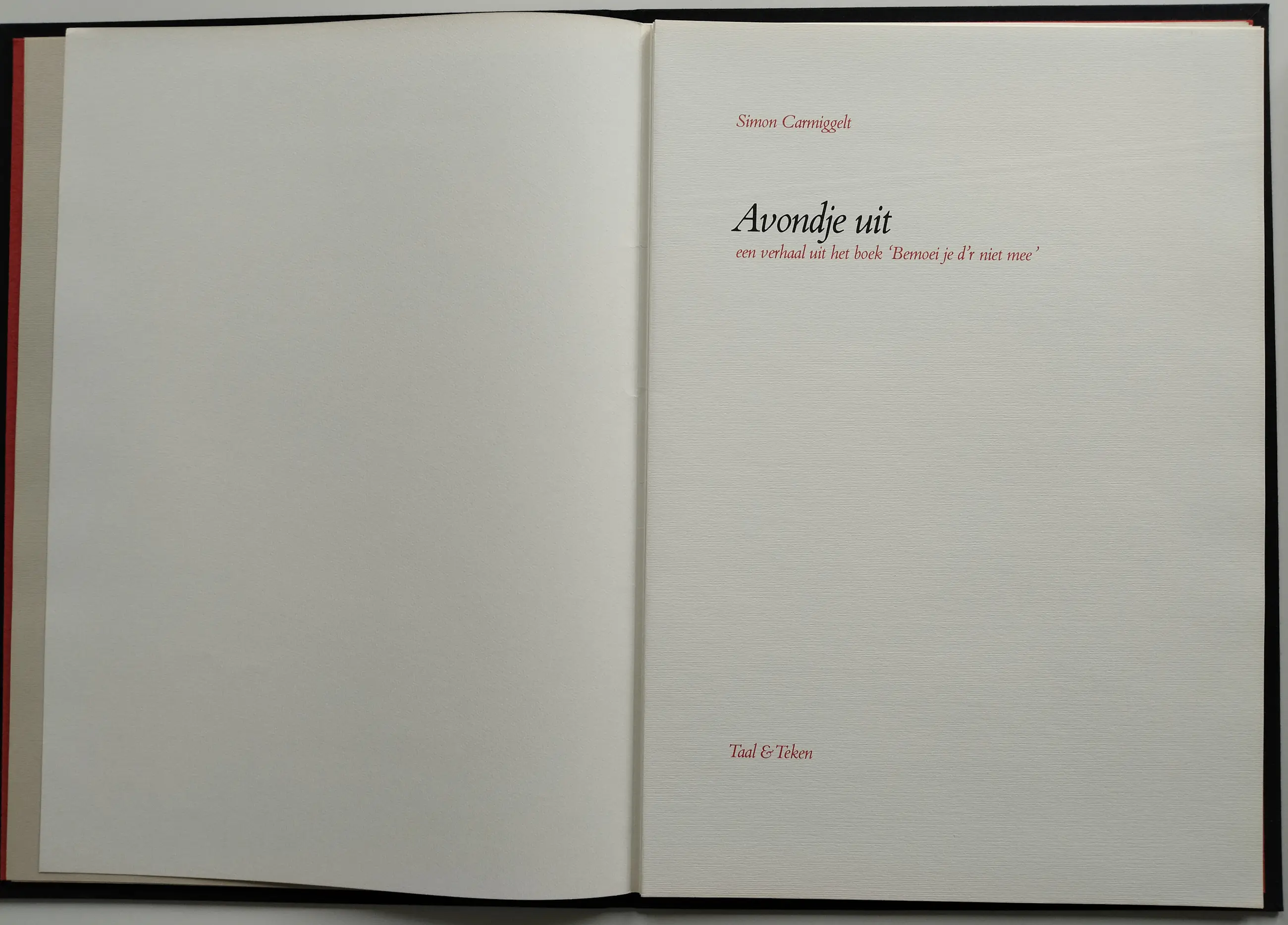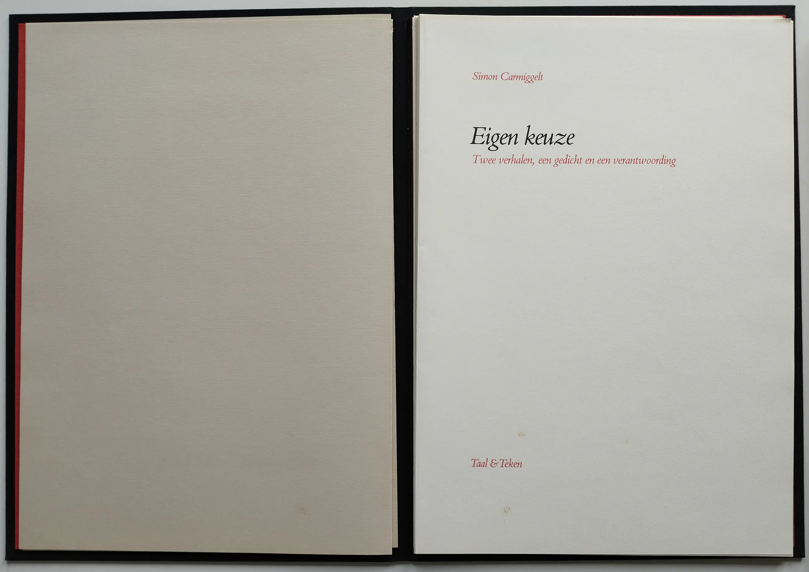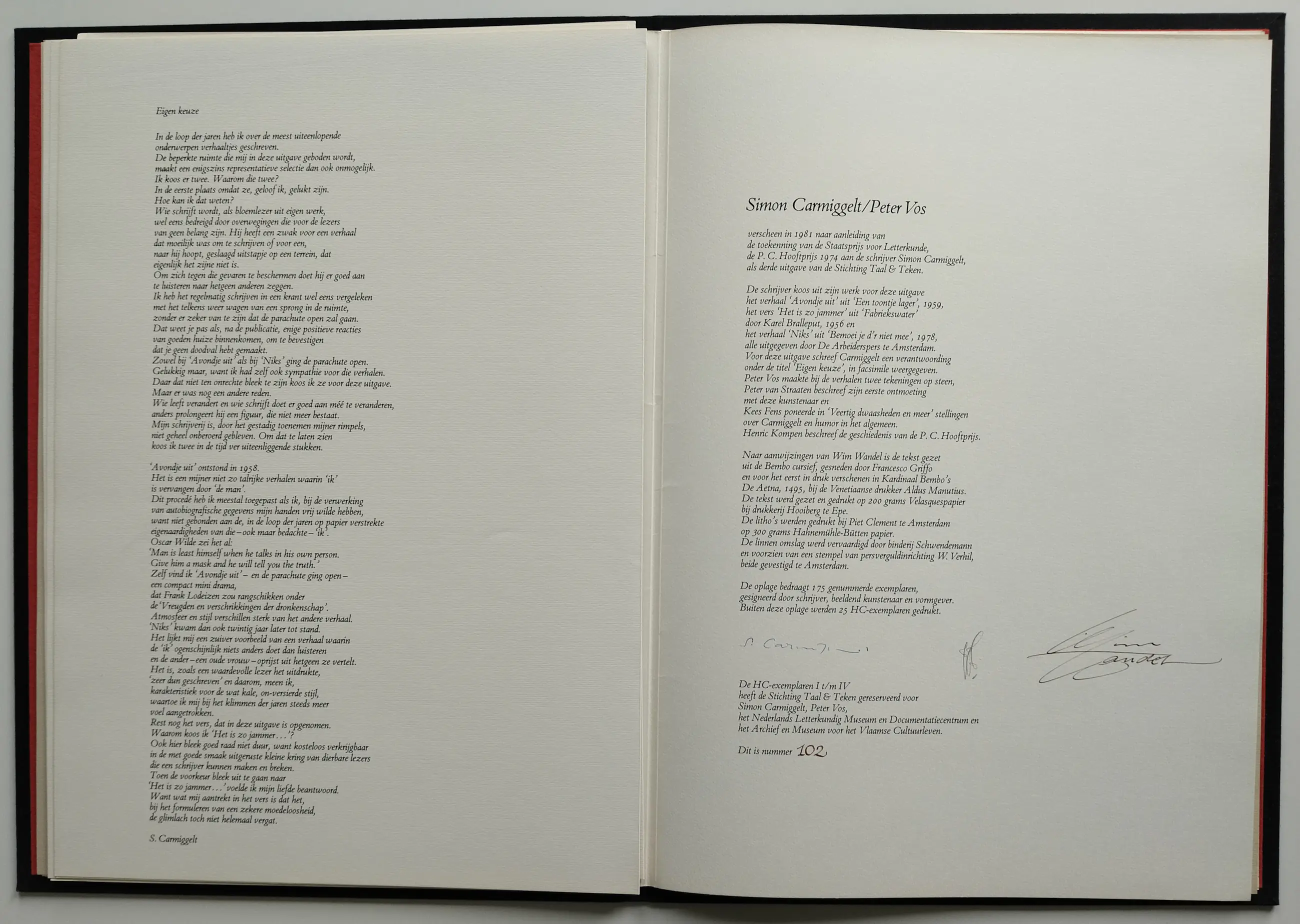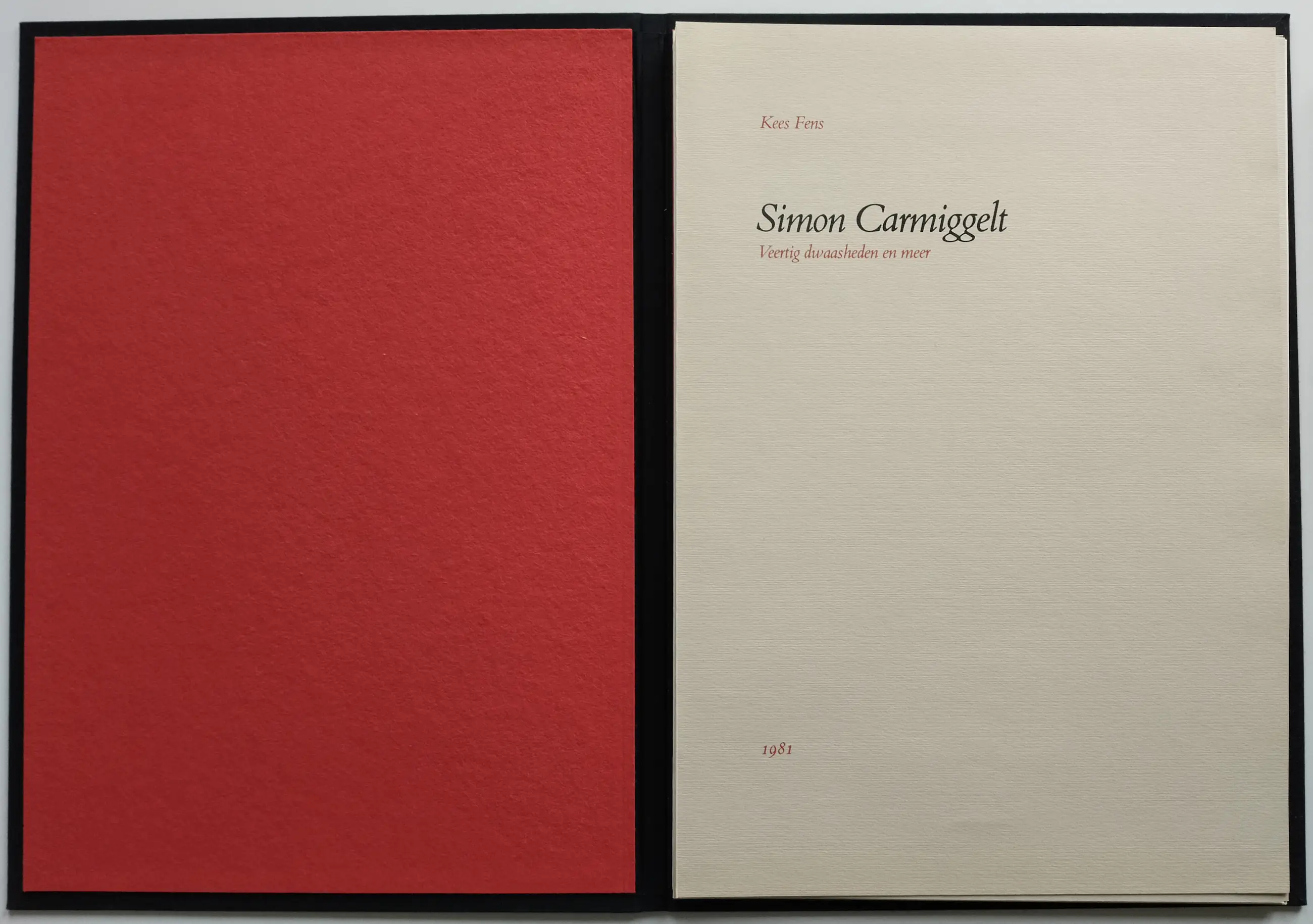 Simon Carmiggelt / Peter Vos Map Taal & Teken, uit 1981, met div tekst bladen van Simon Carmiggelt. Gedrukt in totaal 200 stuks. Dit is nummer 102. De map is gesigneerd door Simon Carmiggelt , Peter Vos en Wim Wandel. Afmeting map 52 x 37 cm (h x b) De 2 litho’s van Peter Vos ontbreken. Op een voorblad zijn 2 vlekjes zichtbaar. Overig in goede staat.