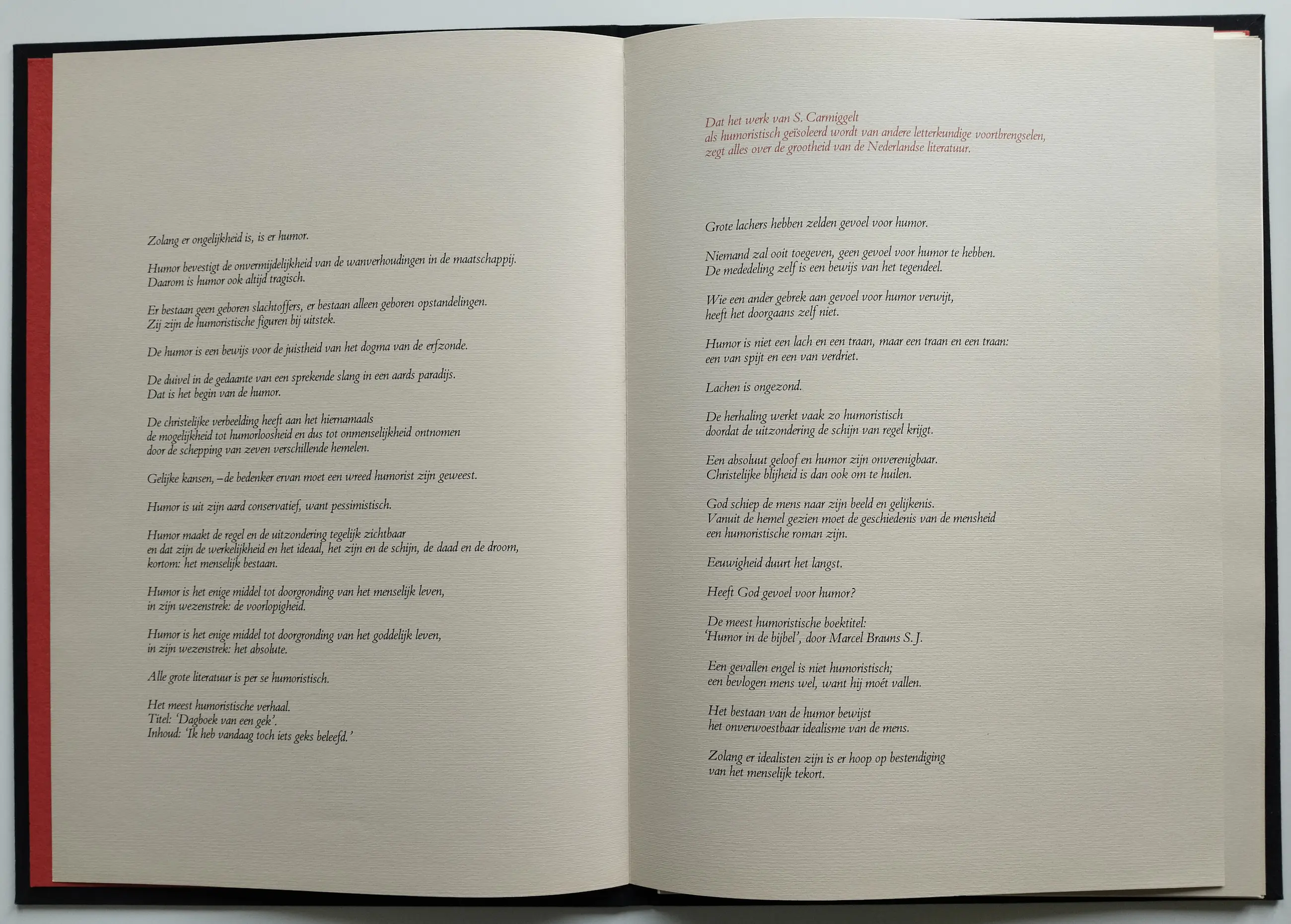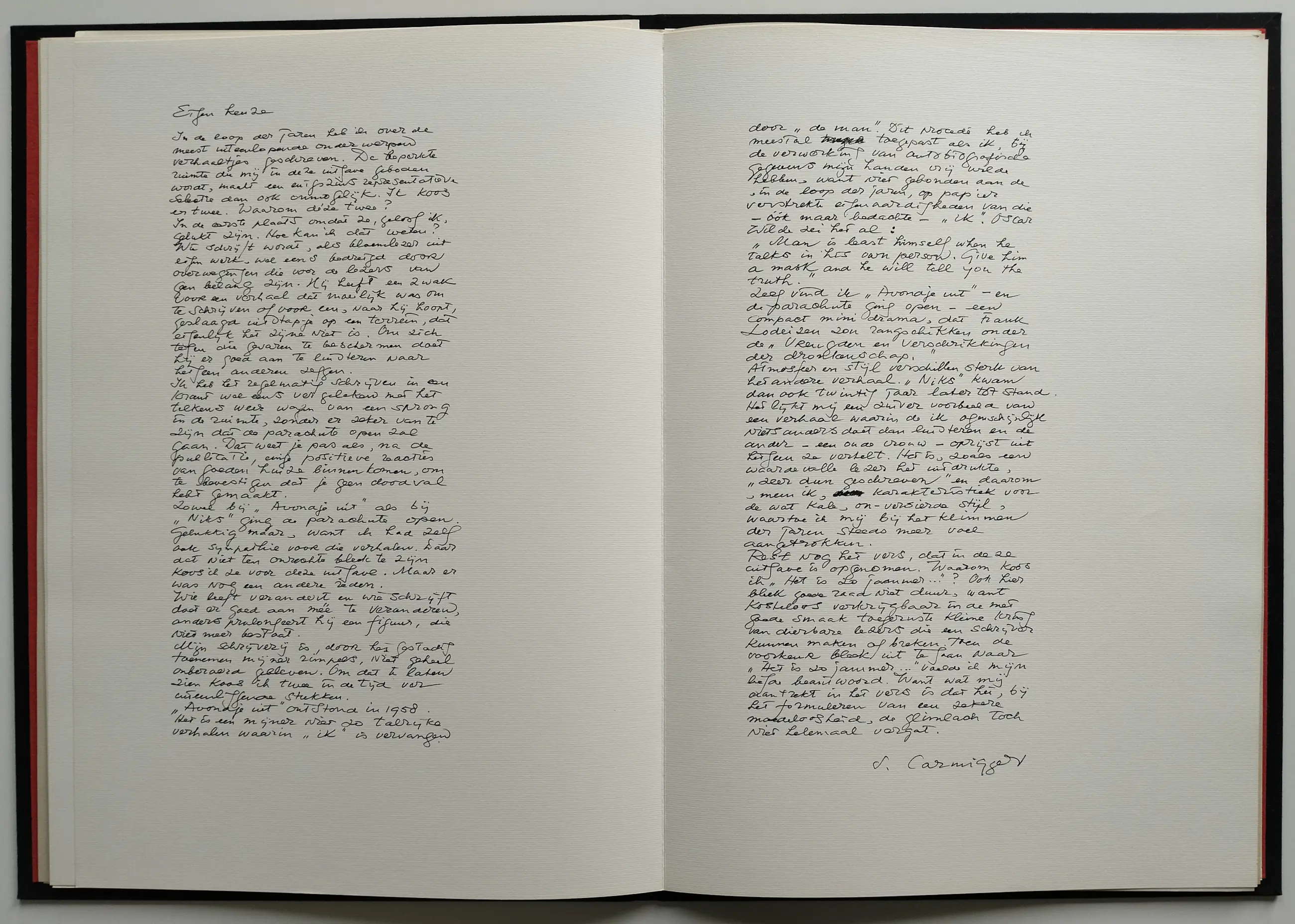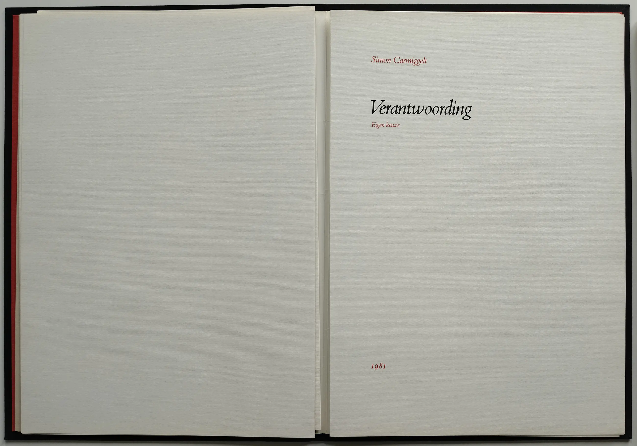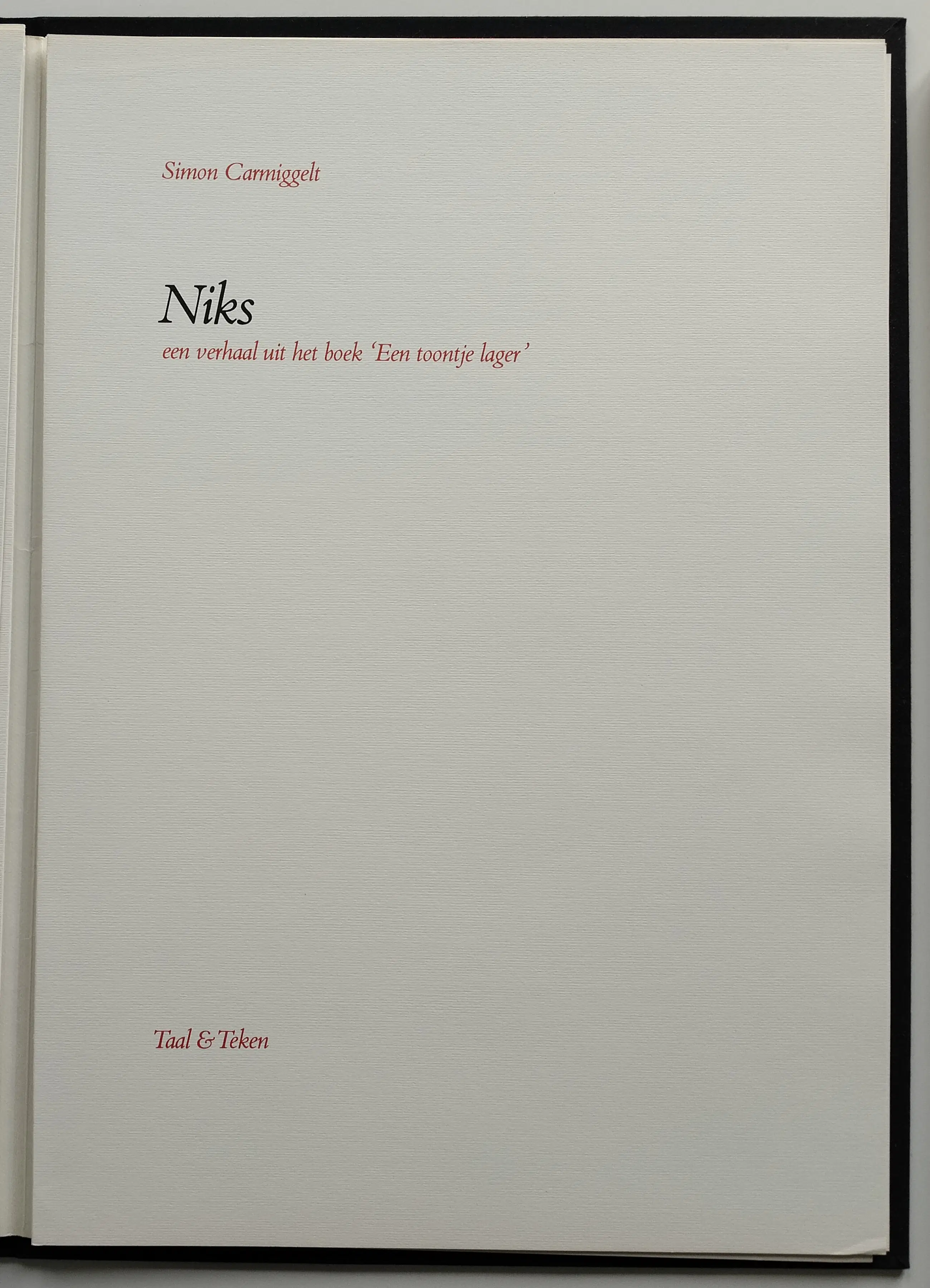 Simon Carmiggelt / Peter Vos Map Taal & Teken, uit 1981, met div tekst bladen van Simon Carmiggelt. Gedrukt in totaal 200 stuks. Dit is nummer 102. De map is gesigneerd door Simon Carmiggelt , Peter Vos en Wim Wandel. Afmeting map 52 x 37 cm (h x b) De 2 litho’s van Peter Vos ontbreken. Op een voorblad zijn 2 vlekjes zichtbaar. Overig in goede staat.