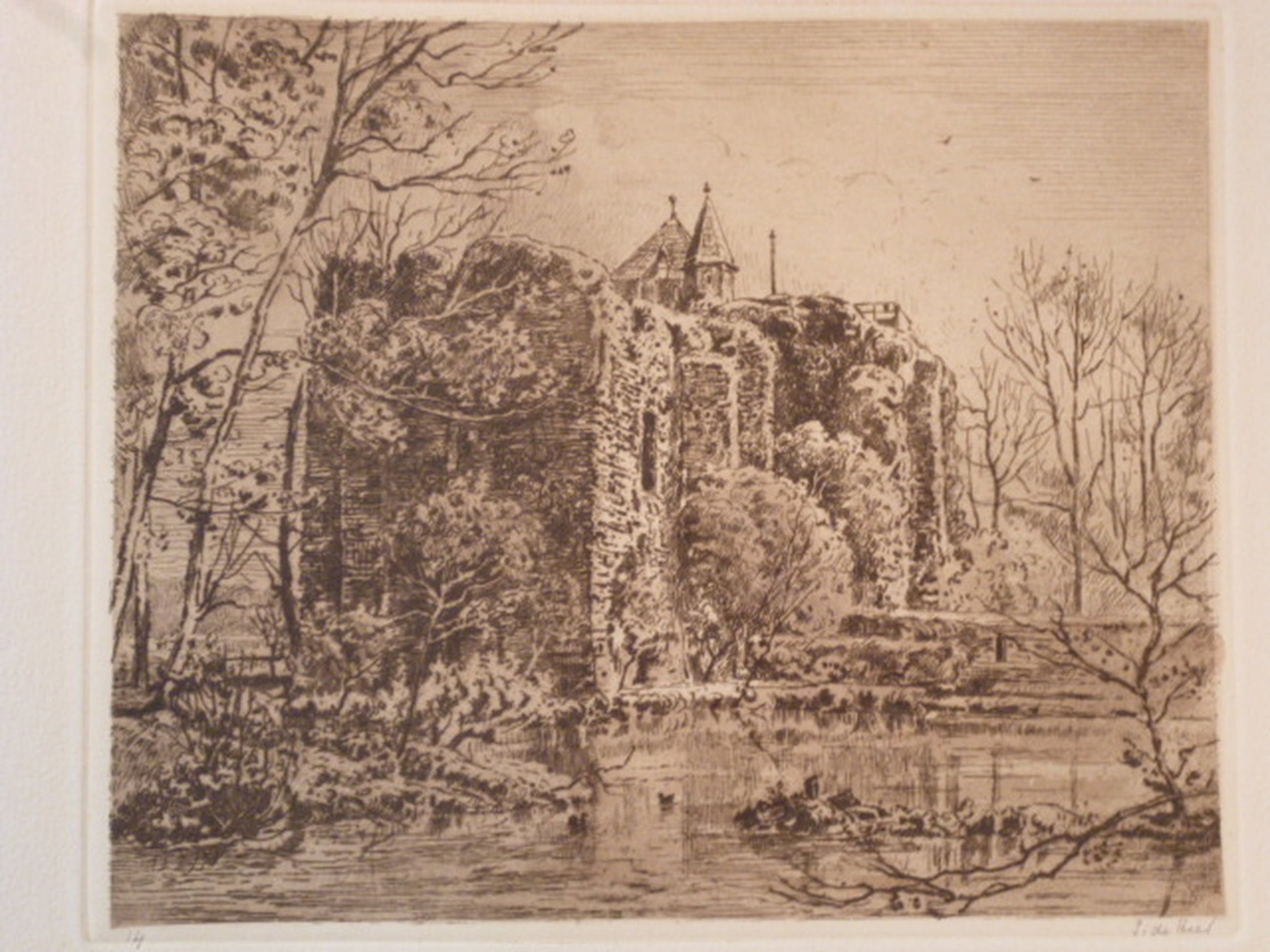 Ets voorstellende de ruïne van Brederode bij Santpoort. Potlood gesigneerd rechtsonder.