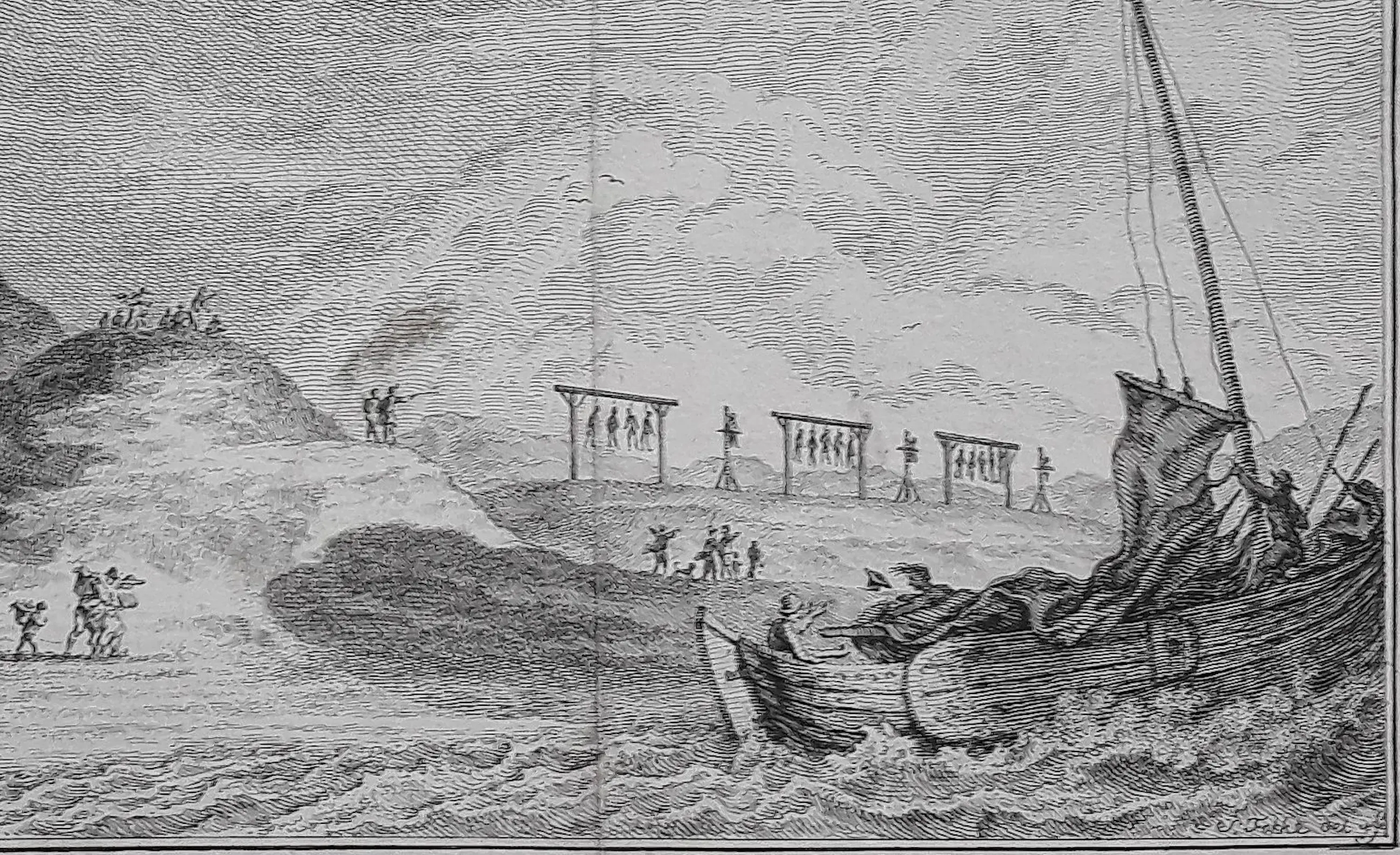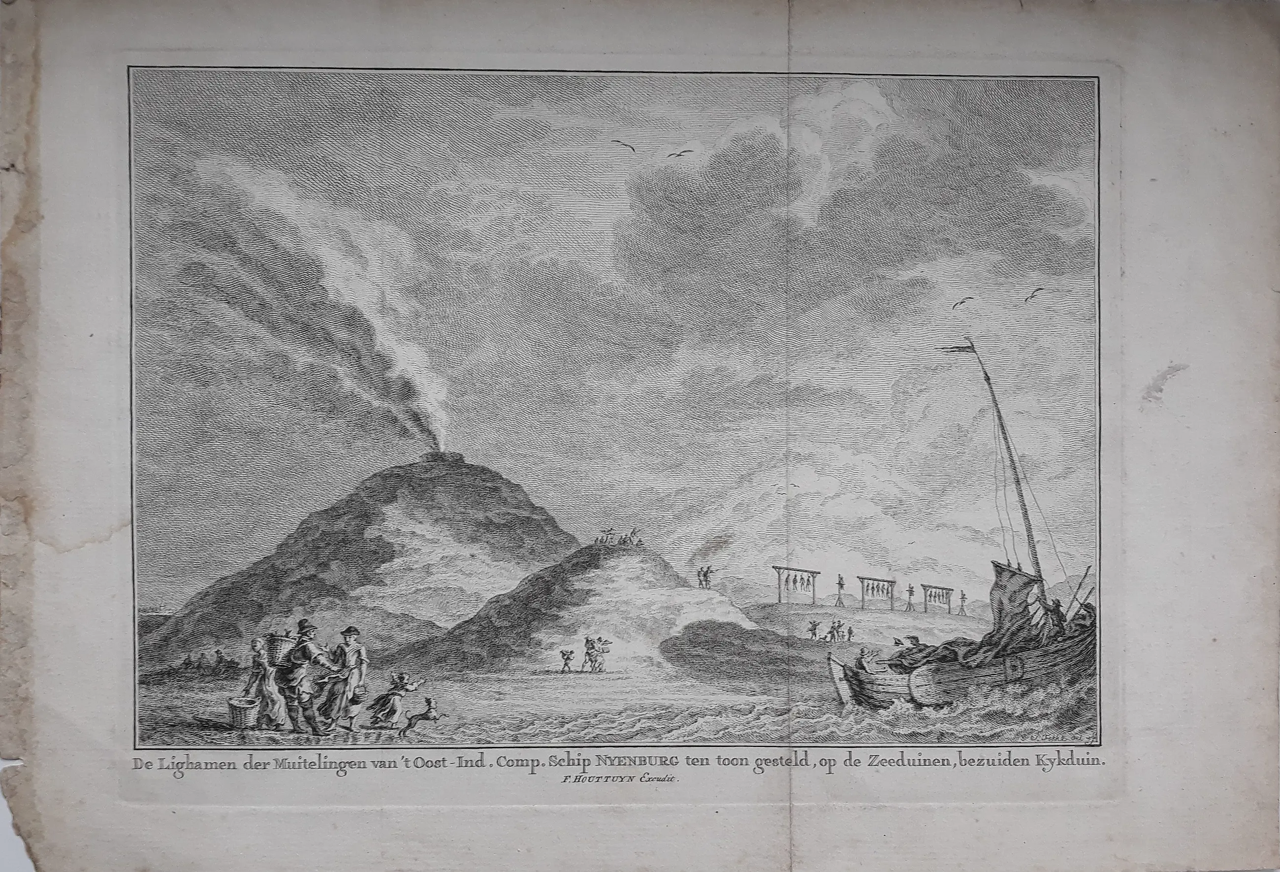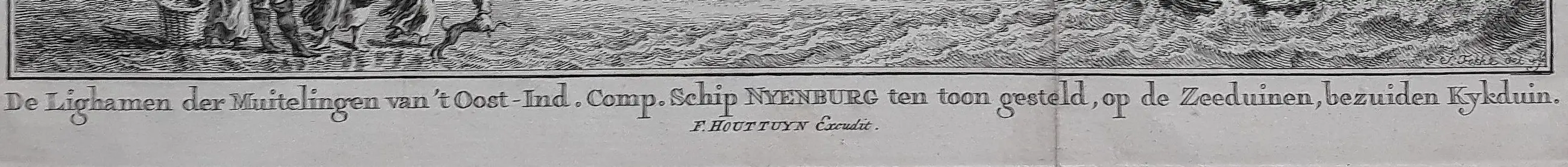 Titel: De lighamen der muitelingen van 't Oost-Ind. Comp. schip Nyenburg ten toon gesteld, op de zeeduinen, bezuiden Kykduin.