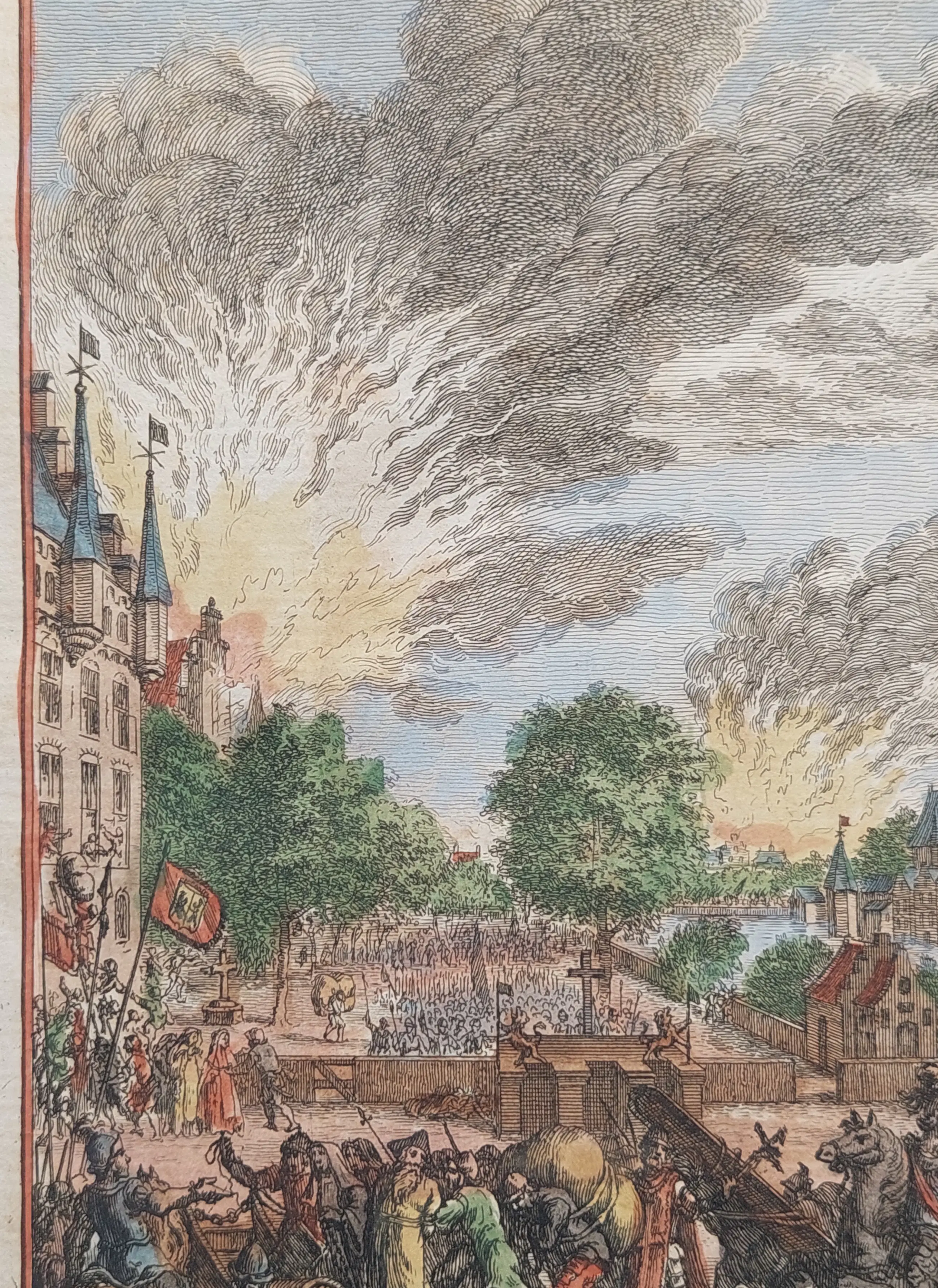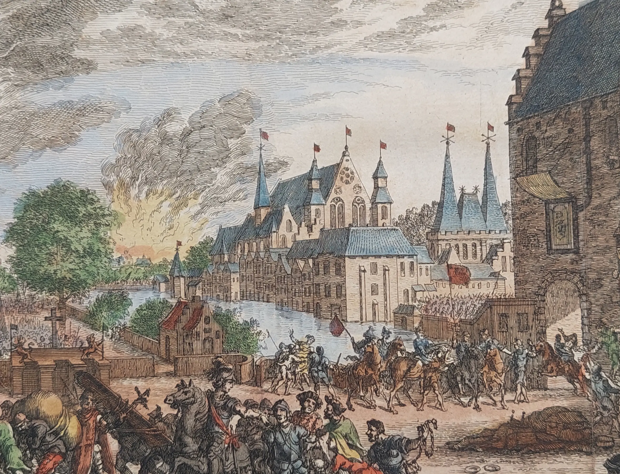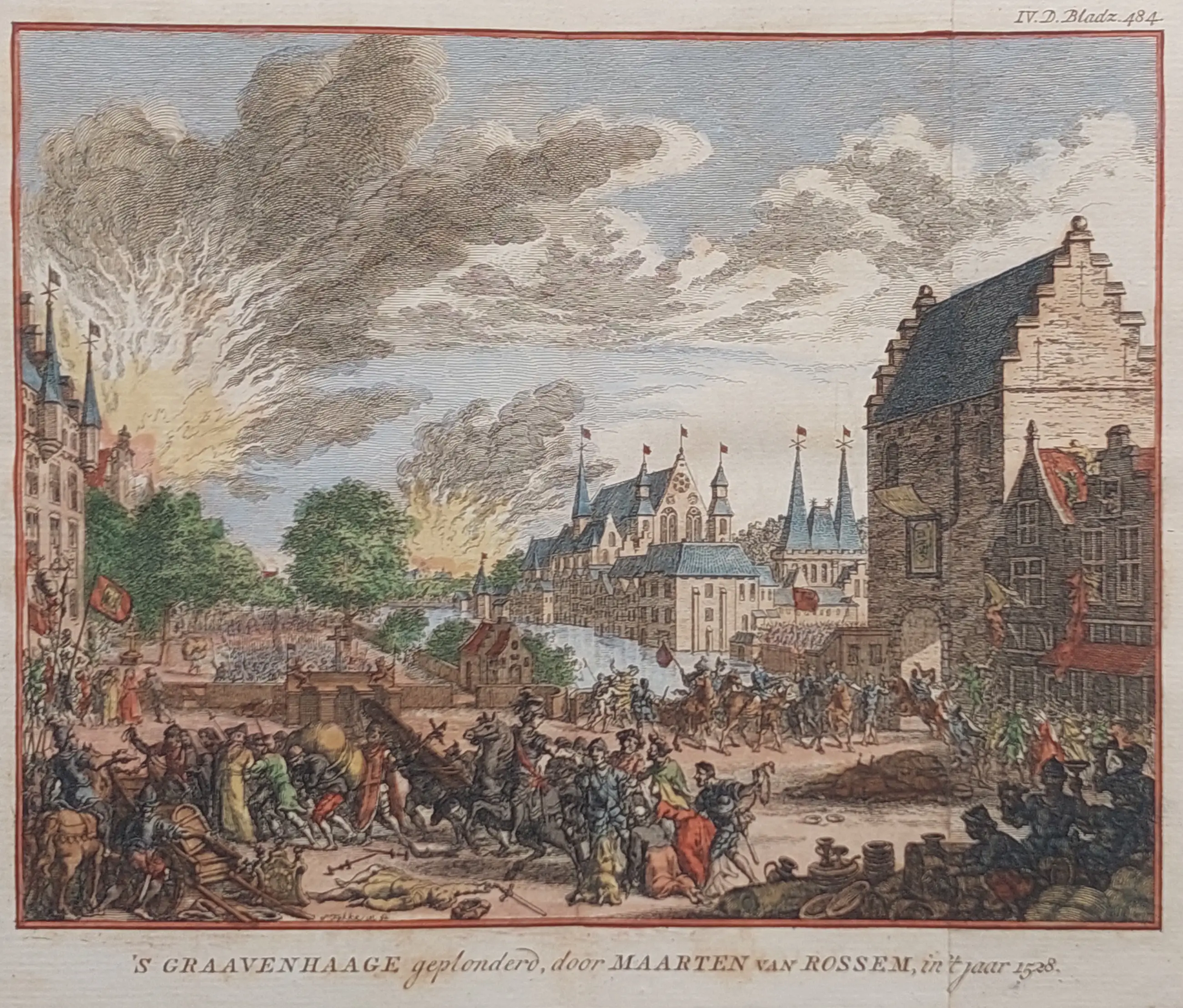Prachtige gravure van plundering van Den Haag door Maarten van Rossum in 1528. Mooi beeld op de Hofvijver, het Binnenhof en de Gevangenenpoort.