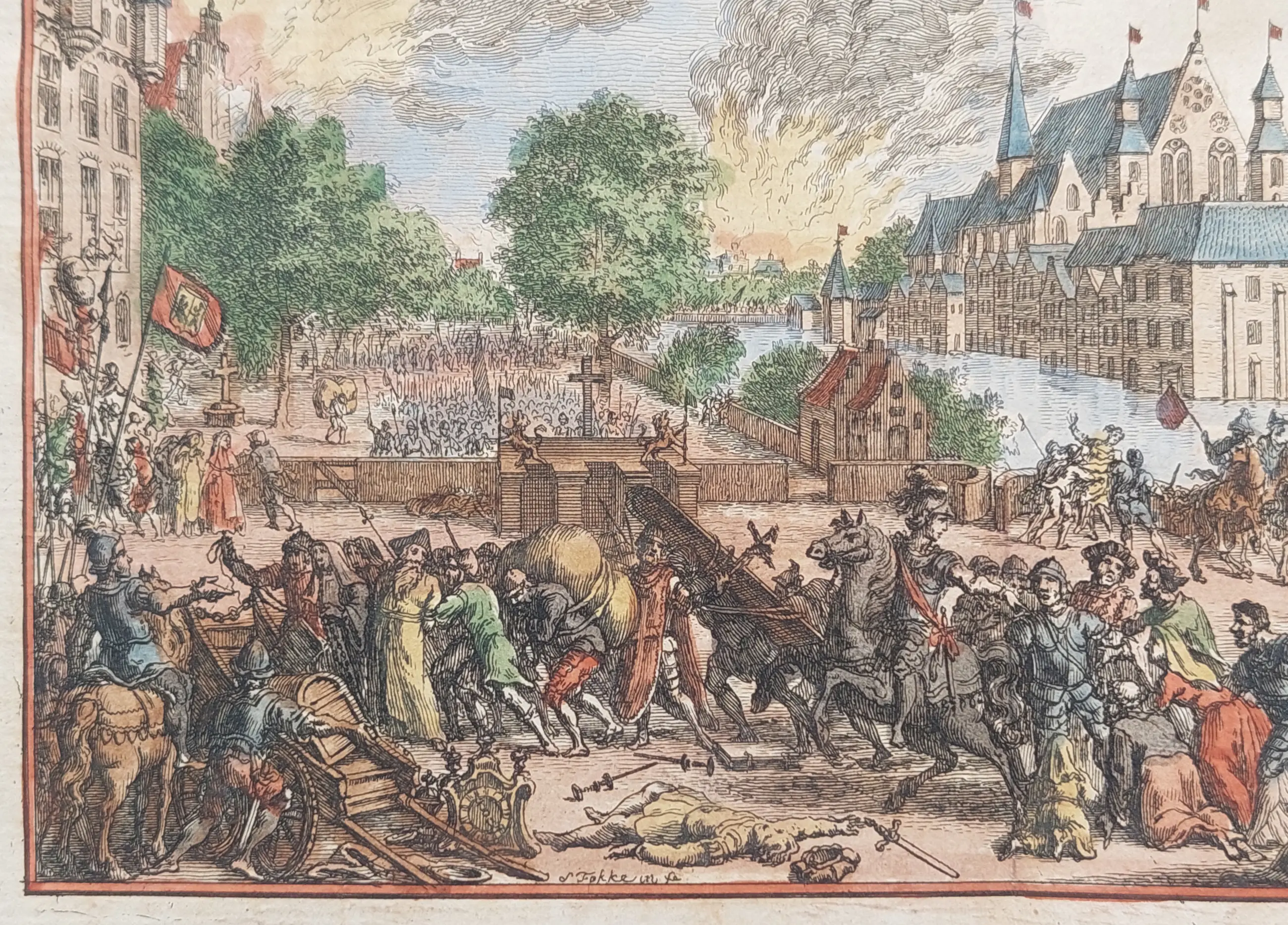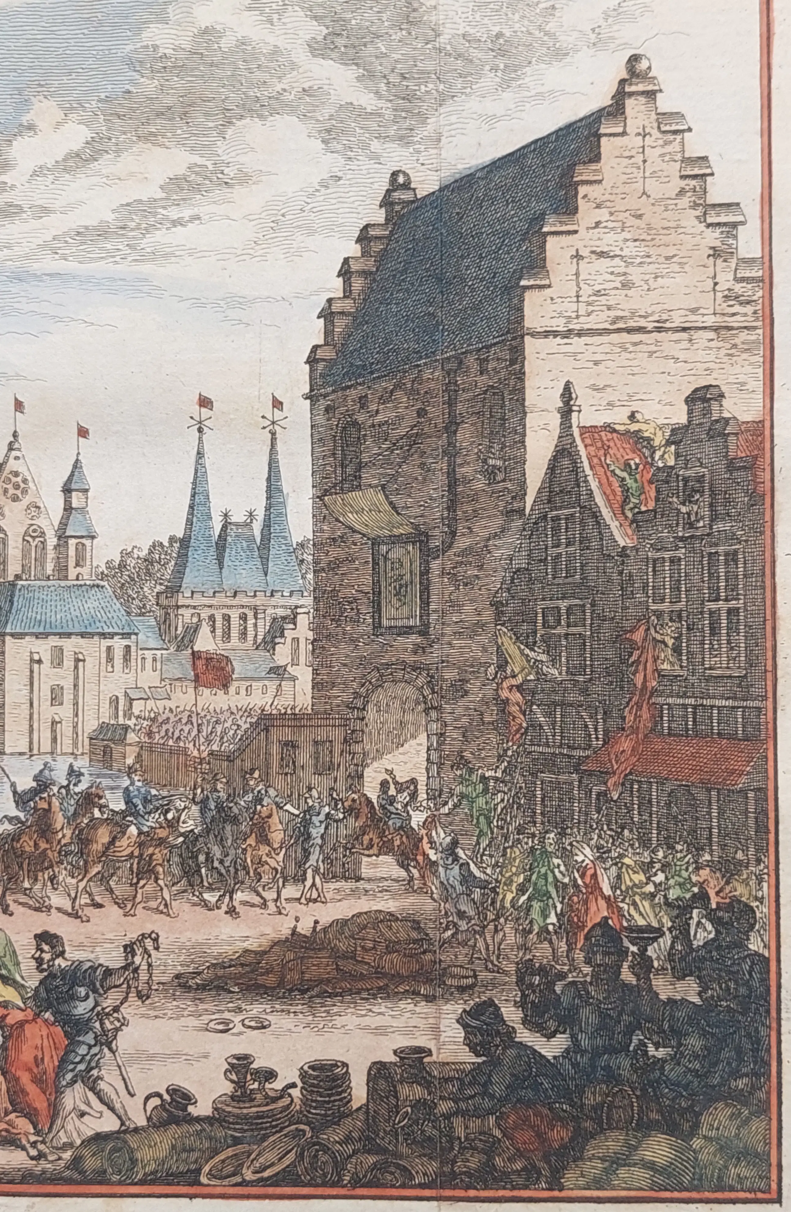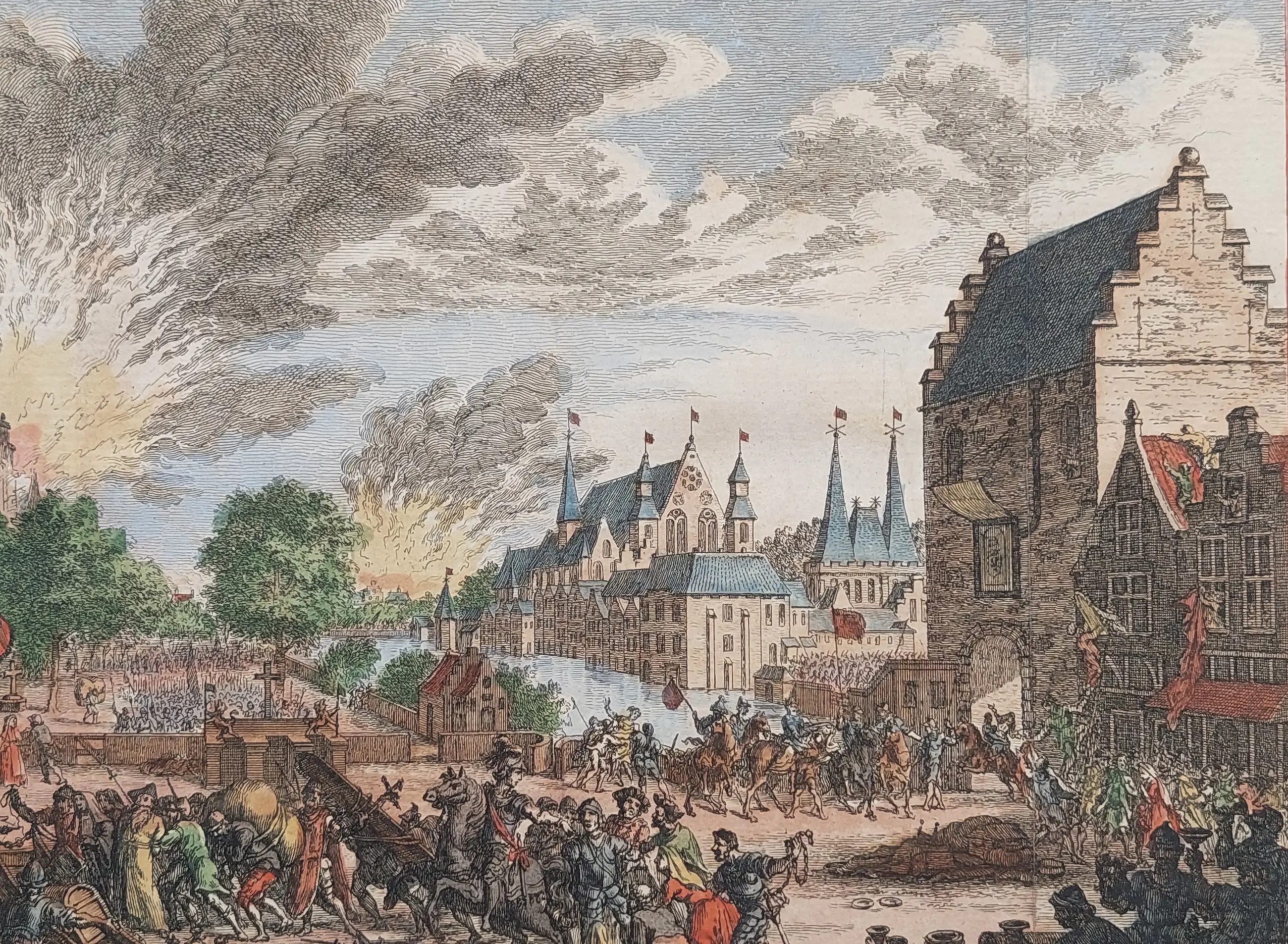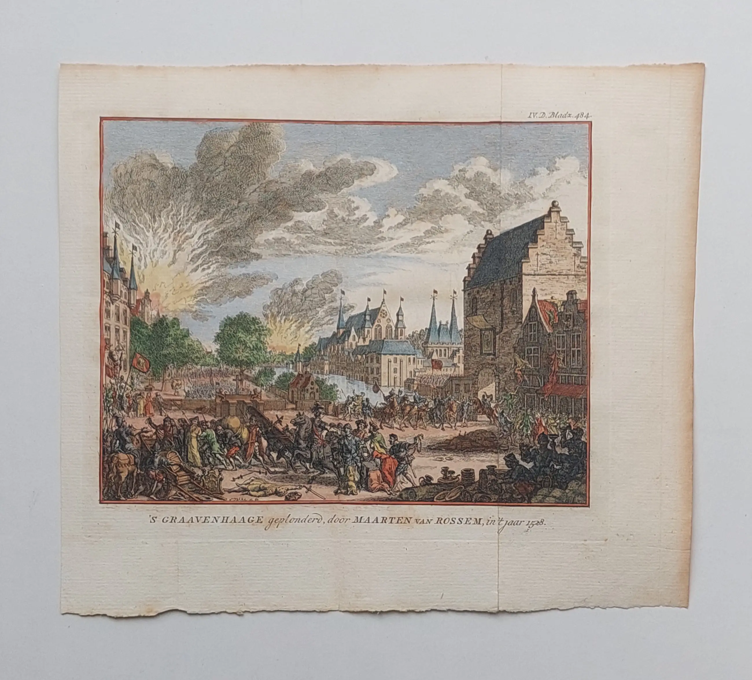 Prachtige gravure van plundering van Den Haag door Maarten van Rossum in 1528. Mooi beeld op de Hofvijver, het Binnenhof en de Gevangenenpoort.