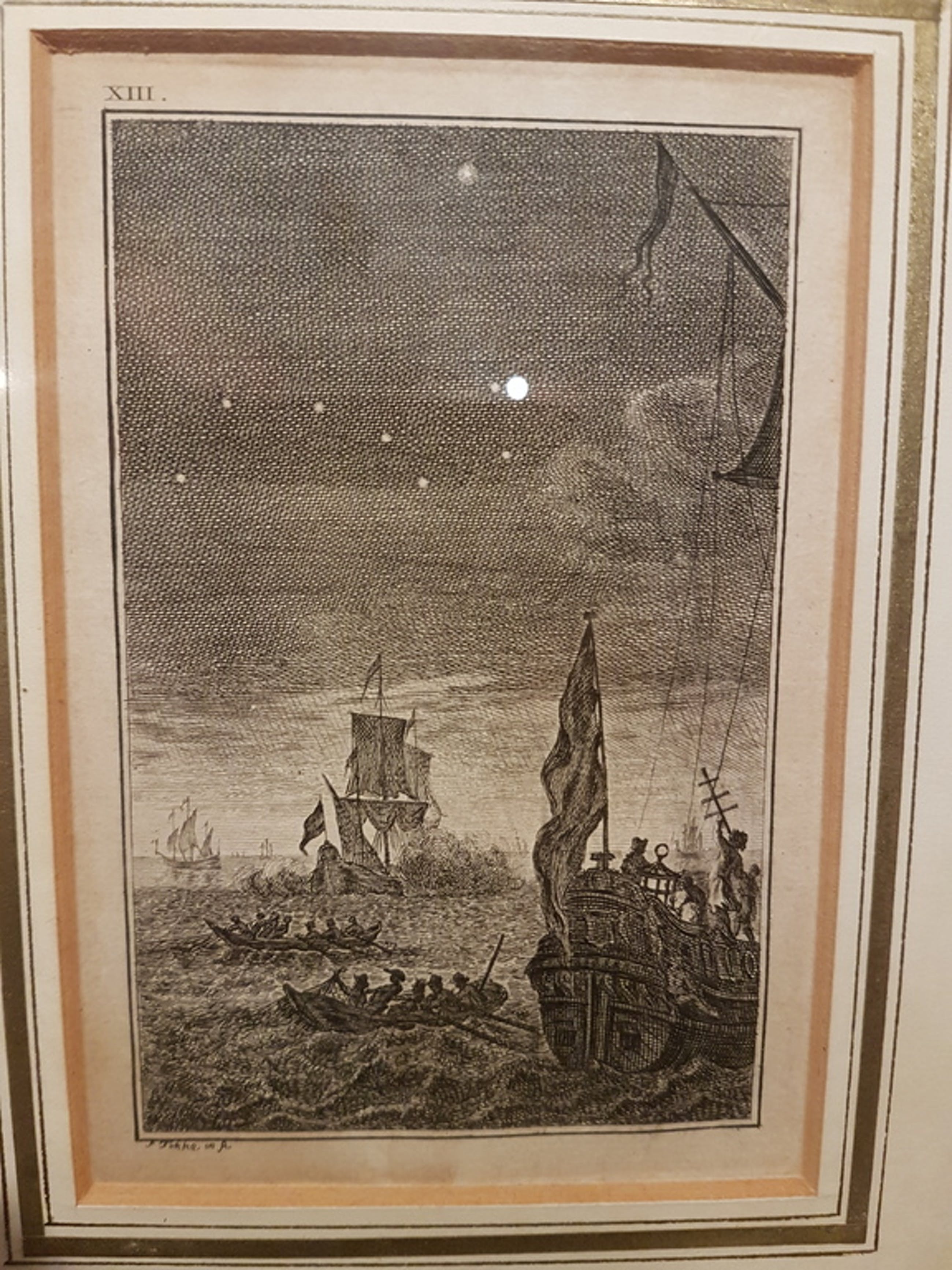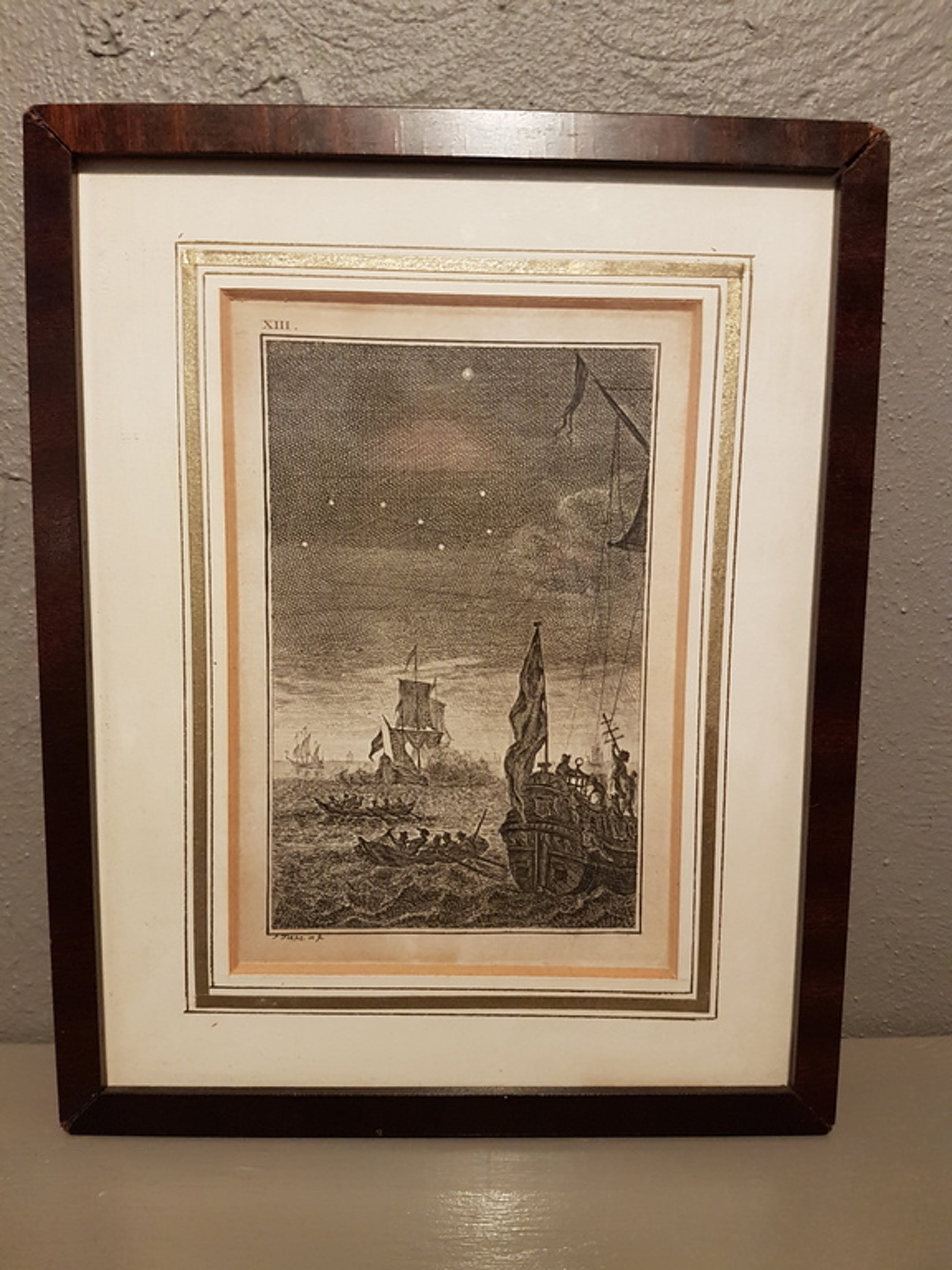 Mooie ingelijste antieke gravure van Simon Fokke (1712-1784) voorstellende schepen op zee met sterrenhemel.