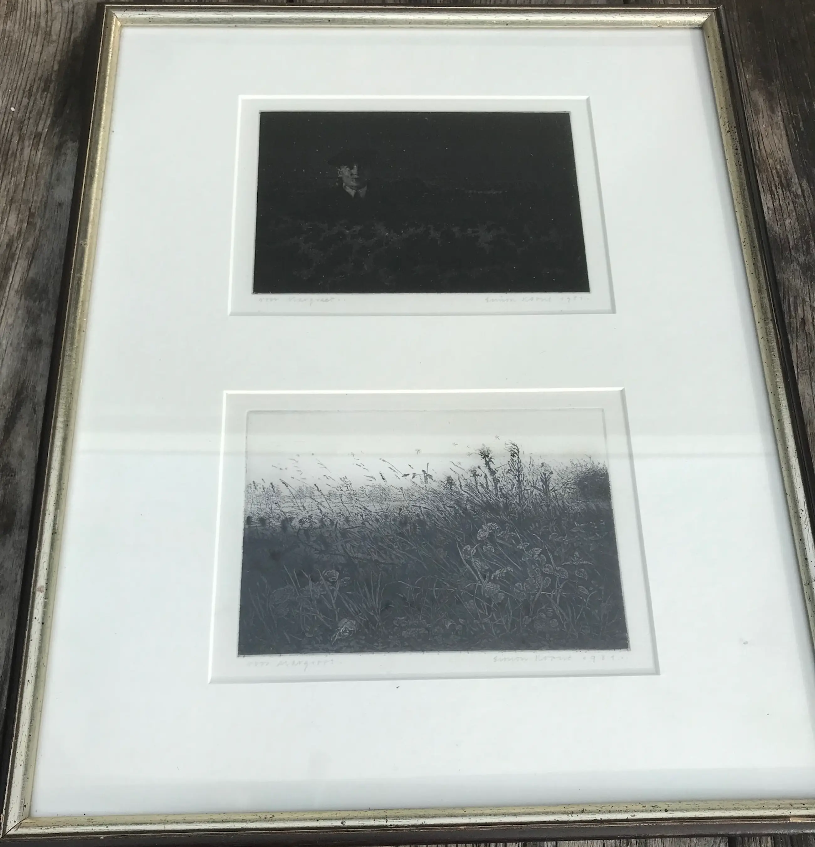 Twee etsen van Simon Koene in één lijst. Beide etsen 11x16cm. Voor Margreet. Niet genummerd. Hand gesigneerd. In mooie strakke lijst. Onbeschadigd.