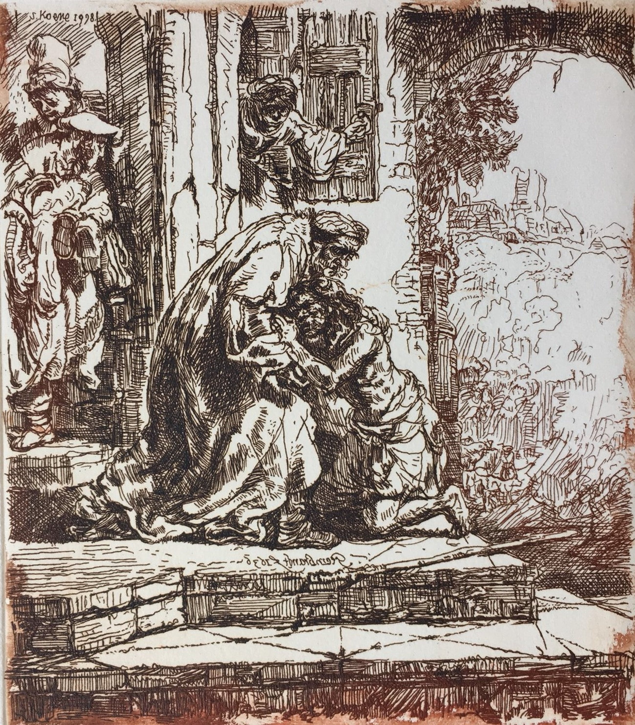Uit de serie: 'Studies naar Rembrandt'. Linksboven in de etsplaat gesigneerd: S. Koene 1998 Rechtsonder met potlood gesigneerd: Simon Koene 1998