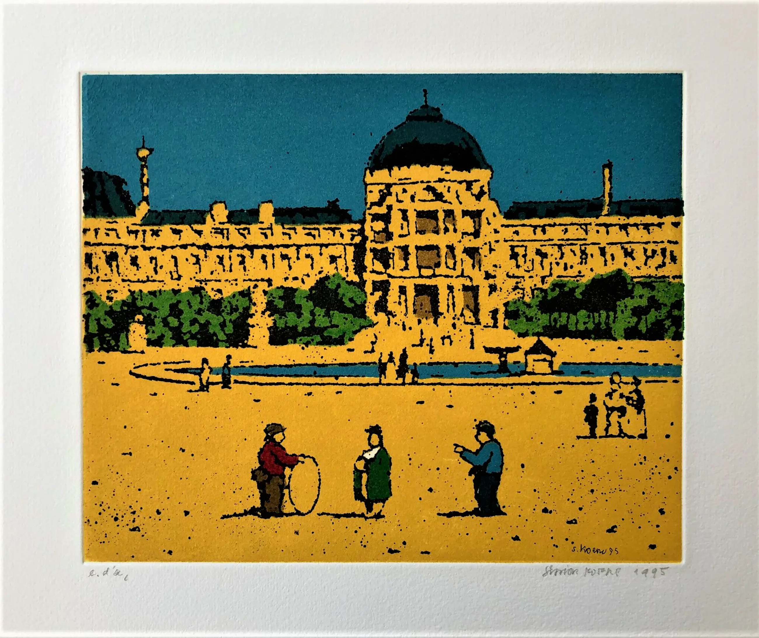 Illustratie bij een bibliofiele uitgave van 'Muzikale Beelden' van Willem Wilmink Épreuve d'artiste. Kleurenets. Eén exemplaar van twee. Rechtsonder in de etsplaat gesigneerd: S. Koene '95 Rechtsonder met potlood gesigneerd: Simon Koene 1995