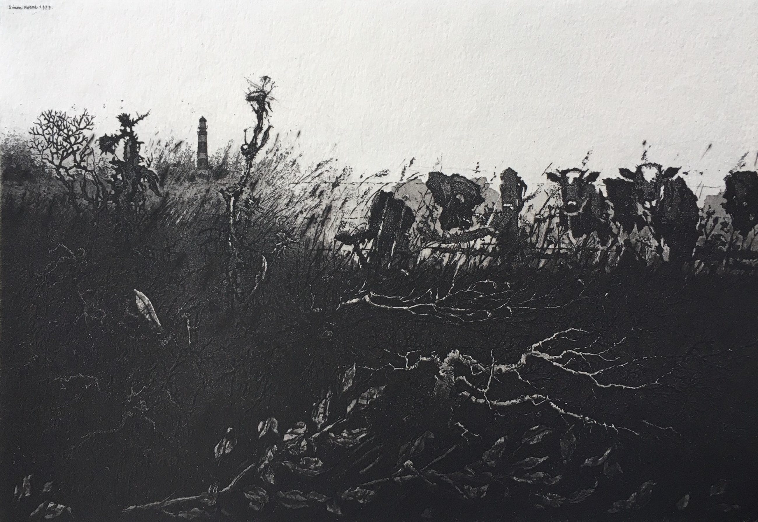 Linksboven in de etsplaat gesigneerd: Simon Koene 1979. Rechtsonder met potlood gesigneerd: Simon Koene 1979. Deel van een kleine oplage. Eerder in een bibliofiele uitgave van 'De bruine vriend' van Simon Vestdijk gepubliceerd in een oplage van ca. 125 ex.