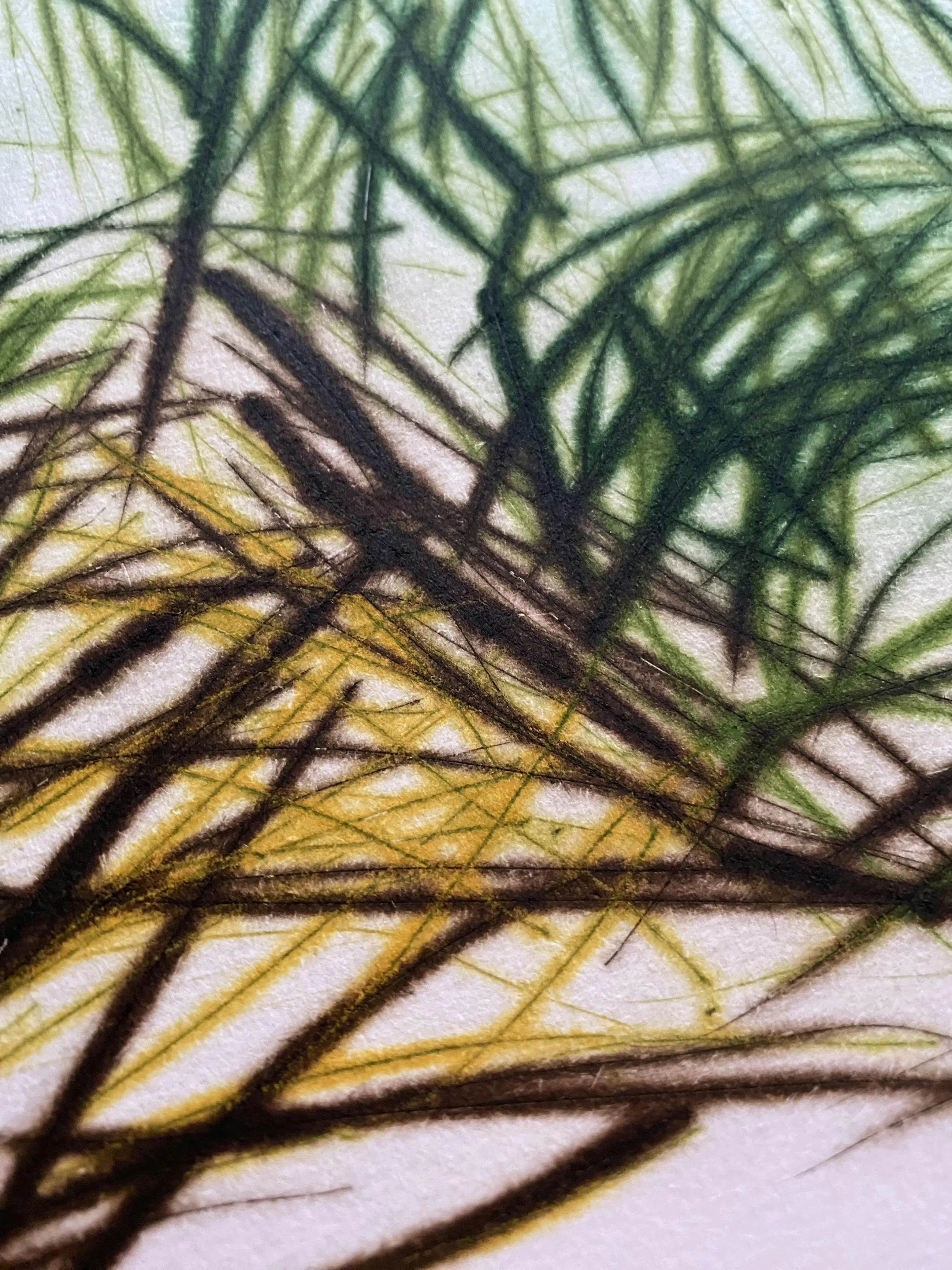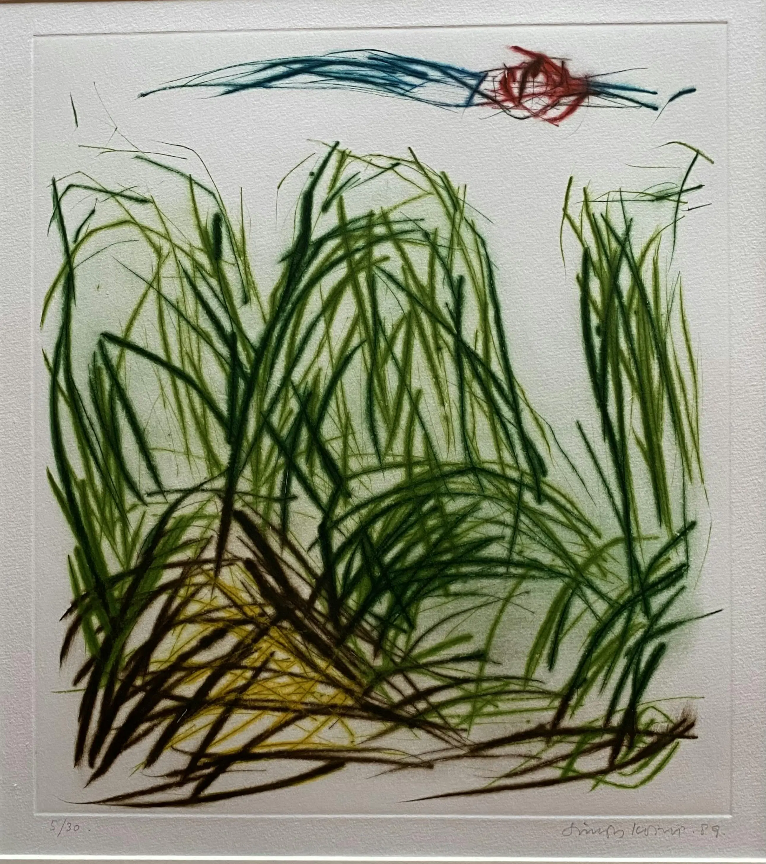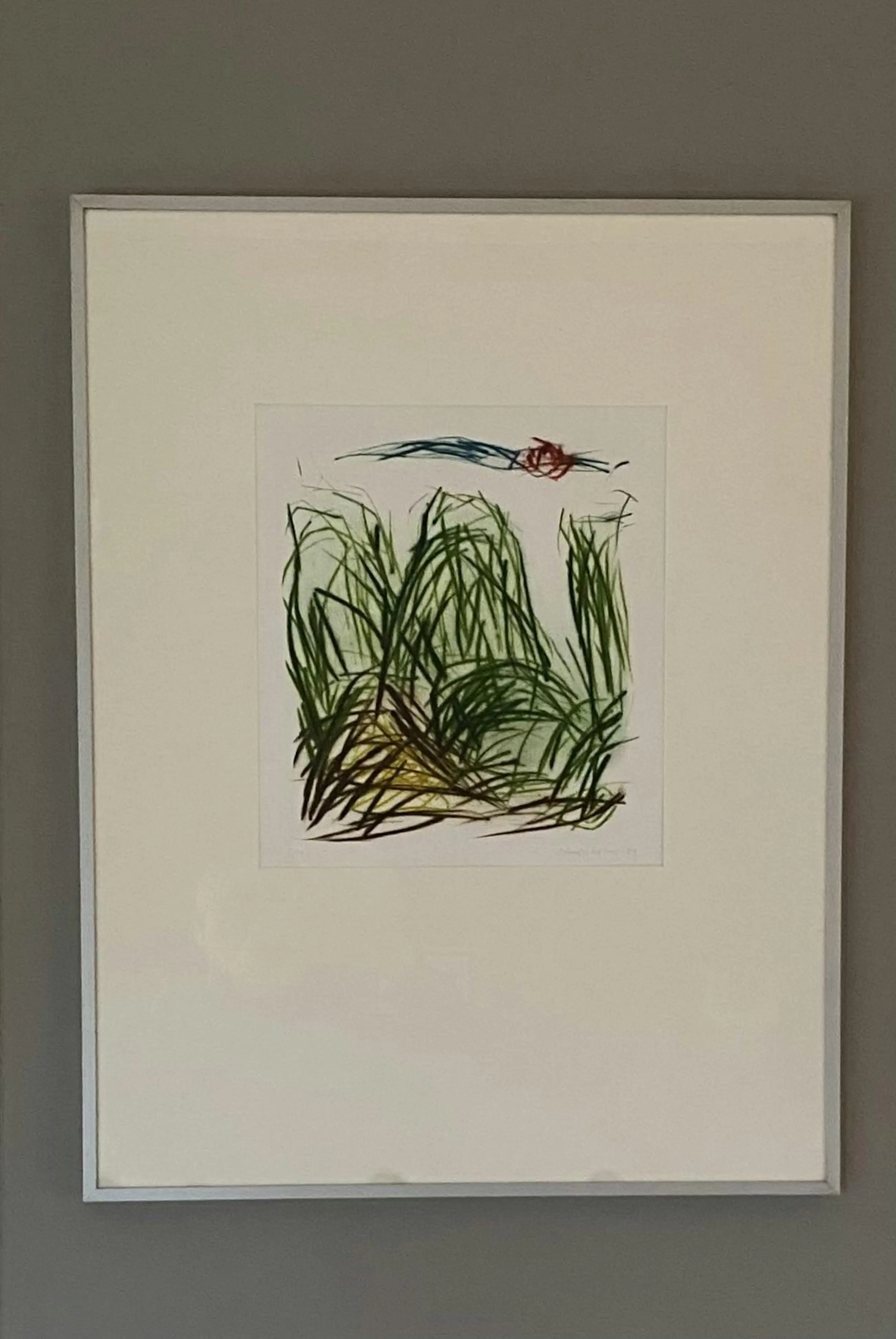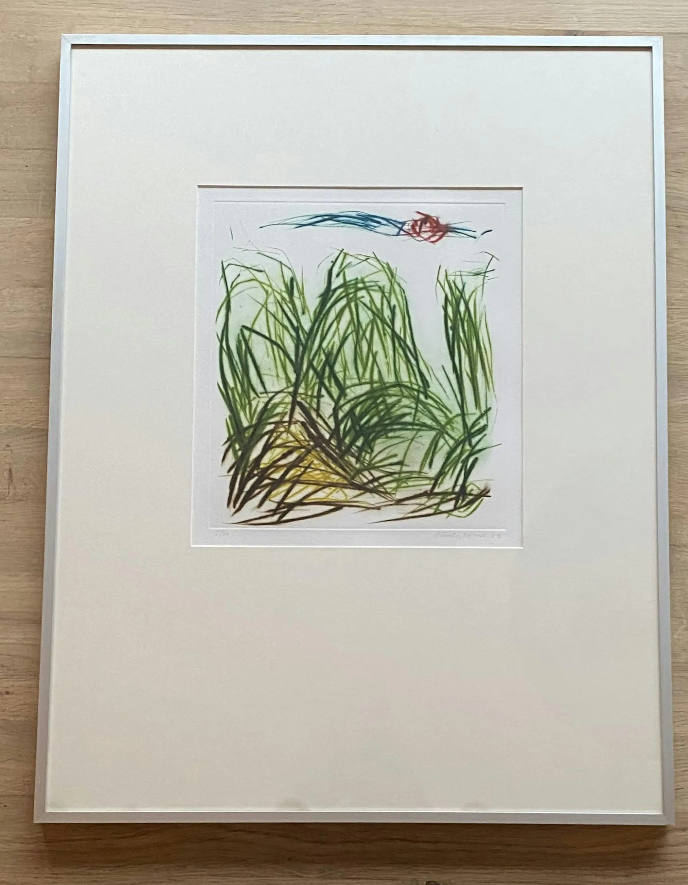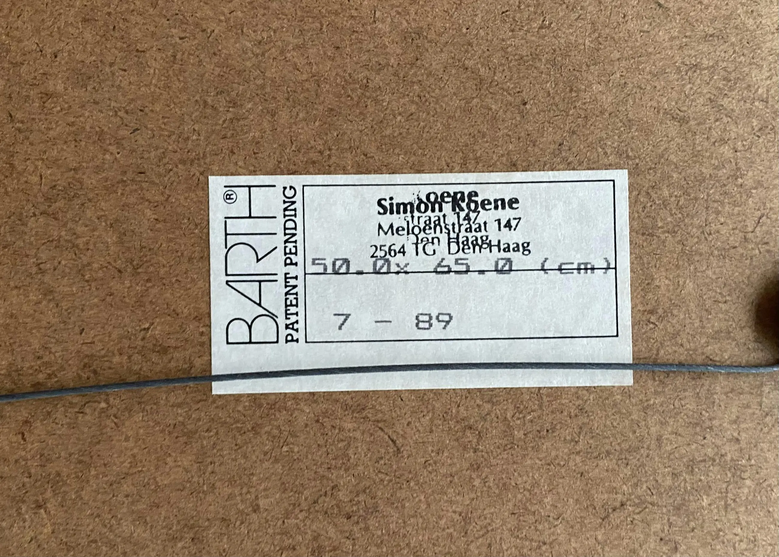 Mooie abstracte kleurets van de Haagse kunstenaar Simon Koene. Ingelijst in een aluminium Barth lijst. De ets verkeert in perfecte staat. Het passe-partout heeft aan de onderzijde wat lichte vlekken (zie foto’s) Wat kleine beschadigingen op de lijst (zie foto)