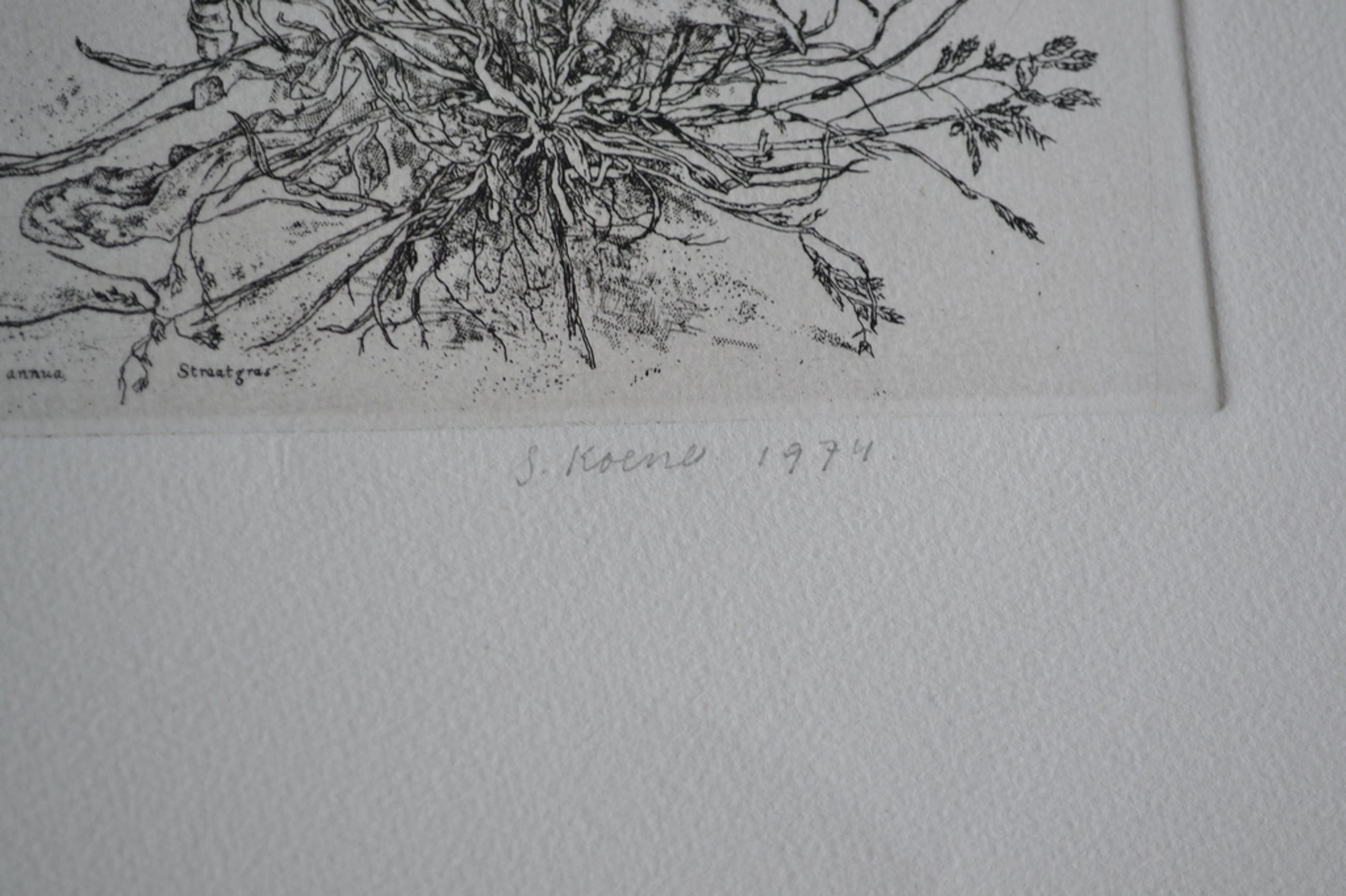 Ets van de Haagse kunstenaar Simon Koene. Koene was oprichter van de Haagse Etsclub en is geroemd om zijn etsen van planten en onkruid. De gehele collectie etsen is tevens te vinden in het RIjksmuseum. Afbeelding 24,2 x 32,2 cm.