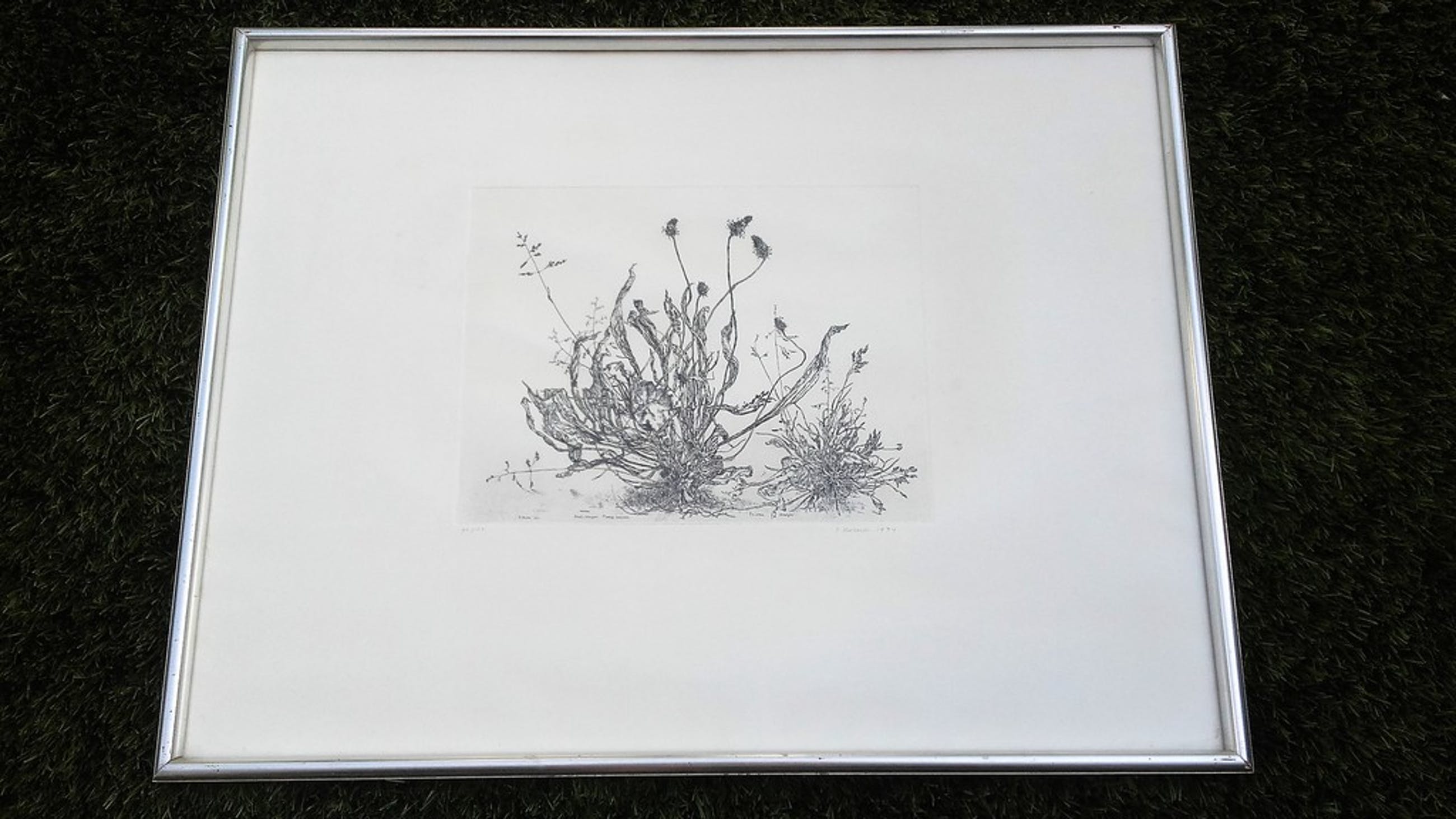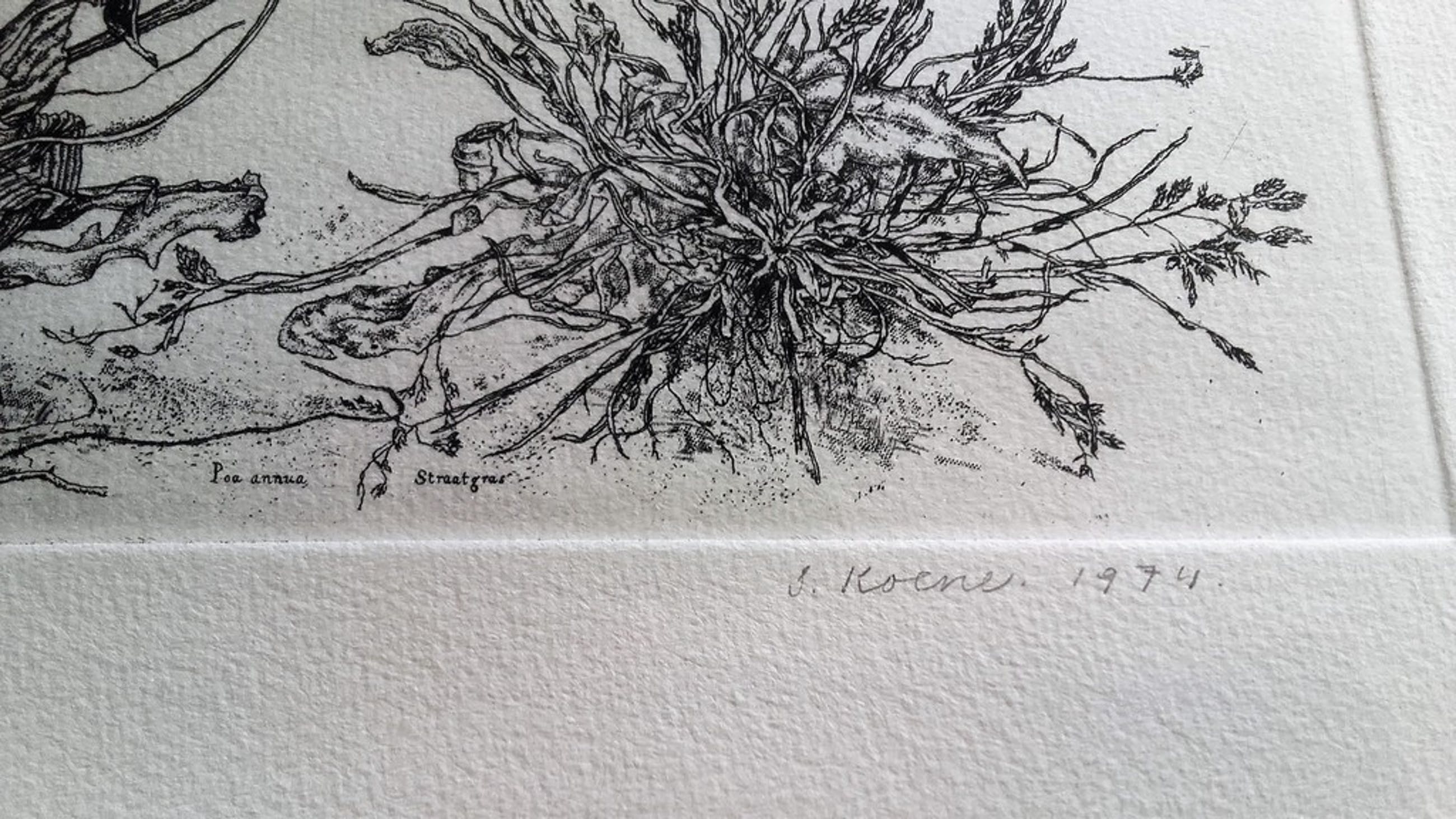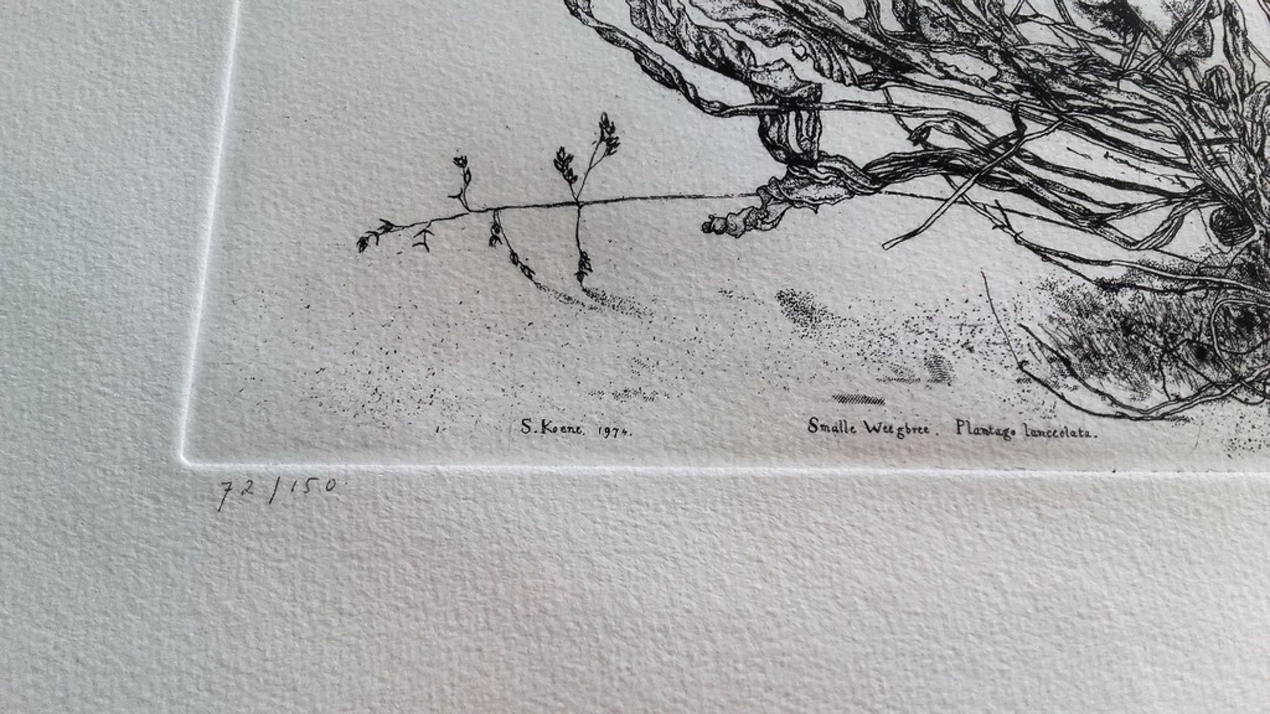 Simon Koene, (Geb, Den Haag 1946) is graficus (etser) tekenaar, schilder en publicist. Hij behoort tot de belangrijkste Nederlandse grafici van de twintigste eeuw. Volgde zijn opleiding aan de Koninklijke Academie van Beeldende Kunsten in Den Haag. Afm totaal: 66.5 cm bij 51.5 cm. Afbeelding: 31 cm bij 24 cm. Titel: Smalle Weegbree. Gesigneerd: S. Koene 1974. Oplage: 72/150. Inclusief, glasplaat en ophangmogelijkheid. Conditie, Uitstekend. Wordt zorvuldig ingepakt, met doos en noppenplastic.