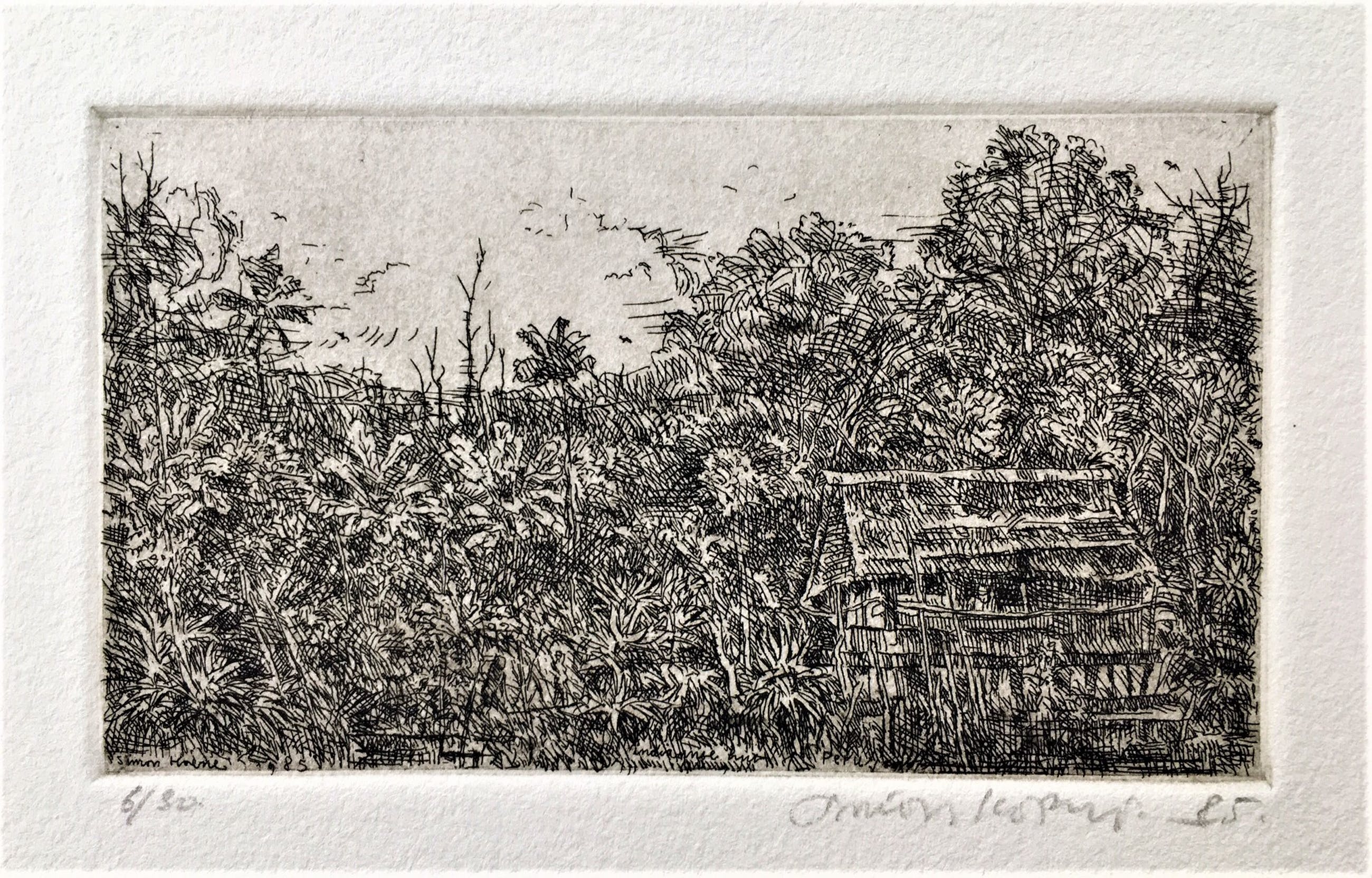 Linksonder in de etsplaat gesigneerd: Simon Koene 1985 Midden onder in de etsplaat: Indiaanse hut Rechtsonder met potlood gesigneerd: Simon Koene '85